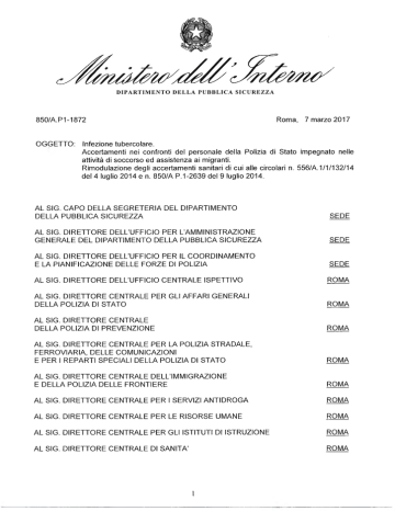 850/A.P1-1872 Roma, 7 marzo 2017 OGGETTO: Infezione tubercolare. Accertamenti nei confronti del personale della Polizia di Stato impegnato nelle attività di soccorso ed assistenza ai migranti. Rimodulazione degli accertamenti sanitari di cui alle circolari n. 556/A. 1/1/132/14 del 4 luglio 2014 e n. 850/A P.1-2639 del 9 luglio 2014. AL SIG. CAPO DELLA SEGRETERIA DEL DIPARTIMENTO DELLA PUBBLICA SICUREZZA SEDE AL SIG. DIRETTORE DELL’UFFICIO PER L’AMMINISTRAZIONE GENERALE DEL DIPARTIMENTO DELLA PUBBLICA SICUREZZA SEDE AL SIG. DIRETTORE DELL’UFFICIO PER IL COORDINAMENTO E LA PIANIFICAZIONE DELLE FORZE DI POLIZIA SEDE AL SIG. DIRETTORE DELL’UFFICIO CENTRALE ISPETTIVO ROMA AL SIG. DIRETTORE CENTRALE PER GLI AFFARI GENERALI DELLA POLIZIA DI STATO ROMA AL SIG. DIRETTORE CENTRALE DELLA POLIZIA DI PREVENZIONE ROMA AL SIG. DIRETTORE CENTRALE PER LA POLIZIA STRADALE, FERROVIARIA, DELLE COMUNICAZIONI E PER I REPARTI SPECIALI DELLA POLIZIA DI STATO ROMA AL SIG. DIRETTORE CENTRALE DELL’IMMIGRAZIONE E DELLA POLIZIA DELLE FRONTIERE ROMA AL SIG. DIRETTORE CENTRALE PER I SERVIZI ANTIDROGA ROMA AL SIG. DIRETTORE CENTRALE PER LE RISORSE UMANE ROMA AL SIG. DIRETTORE CENTRALE PER GLI ISTITUTI DI ISTRUZIONE ROMA AL SIG. DIRETTORE CENTRALE DI SANITÀ’ ROMA 1 Nell’ultimo biennio è stato realizzato un estensivo screening del personale della Polizia di Stato, impegnato nelle attività di soccorso ed assistenza ai migranti, per il monitoraggio dell’infezione tubercolare. L’attivazione del protocollo sanitario, attuato con le circolari in oggetto, si è resa necessaria per garantire, a favore del personale operante nei predetti ambiti, la prevenzione e la profilassi della patologia infettiva tubercolare. L’assenza in letteratura scientifica di specifici studi volti a quantificare il rischio di contrarre la malattia in soggetti con ripetuti e ravvicinati contatti con un elevato numero di soggetti appartenenti a popolazioni ad alta endemia dell’infezione, ha reso opportuno realizzare un attento monitoraggio del fenomeno. A distanza di due anni, i risultati dell’analisi dei dati, relativi alle indagini cliniche e di laboratorio effettuate sugli operatori, non hanno evidenziato rischi specifici correlati ai suddetti servizi, anche per gli interventi di profilassi primaria comunque adottati (misure igienico-comportamentali ed uso dei dispositivi di protezione individuale). Non è risultato ad oggi, nel personale della Polizia di Stato, alcun caso di malattia tubercolare correlato al rischio professionale mentre è stato evidenziato un numero di casi di infezione tubercolare latente sovrapponibile a quello atteso nella popolazione generale e, laddove indicate, sono state messe in atto le relative misure di profilassi. Le risultanze del monitoraggio sono state recentemente pubblicate sulla importante rivista medica internazionale British Medicai Journal Open, i cui revisori scientifici hanno confermato la rigorosità dei dati e la corretta metodologia dello studio. 5 DIPARTIMENTO DELLA PUBBLICA SICUREZZA Alla luce di quanto emerso, si ritiene pertanto opportuno rimodulare l’attuale programma di screening degli operatori della Polizia di Stato impegnati in attività con migranti, attraverso: a) il ripristino dei previgenti controlli post-esposizione (per contatti con casi accertati di tubercolosi bacillifera contagiosa); b) la prosecuzione del monitoraggio relativamente alla sola popolazione lavorativa più giovane, al fine di confermare, nel tempo, la bassa incidenza di positività finora riscontrata ai test di screening; c) l’implementazione dei momenti di informazione e formazione del personale sul rischio biologico. La sospensione dei controlli estesi trova, peraltro, giustificazione nella possibile positivizzazione al test causata dalla reiterata esecuzione dello stesso e legata ad una sensibilizzazione del soggetto all’antigene inoculato. La Direzione Centrale di Sanità, di concerto con gli altri uffici interessati, avrà cura di impartire le disposizioni di specifica competenza per garantire la rimodulazione nel senso suindicato dell’attuale programma di screening. Il Capo della Polizia Direttore Generale della Pubblica Sicurezza 6