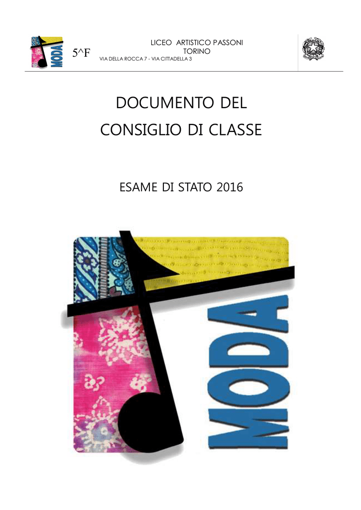 5^F LICEO ARTISTICO PASSONI TORINO VIA DELLA ROCCA 7 - VIA CITTADELLA 3 DOCUMENTO DEL CONSIGLIO DI CLASSE ESAME DI STATO 2016 5F a.s. 2015/2016 COMPOSIZIONE DEL CONSIGLIO DI CLASSE discipline docenti Italiano e Storia PATRIZIA MASSERANO Storia dell'Arte MARIA GRAZIA PAPPALARDO Matematica e Fisica PROVVIDENZA PELLERITI Filosofia CRISTINA CAIANO Lingua straniera:Inglese MASSIMO PRESTIFILIPPO Progettazione Design della Moda + PC ANNA FERRERO ELENA LANZA DI CASALANZA Laboratorio Design Storia del Costume Laboratorio Design Taglio Laboratorio Design Tessuto PATRIZIA SOLFAROLI Scienze Motorie SUSANNA OSSOLA Religione GIUSEPPE FAUSTI firme LILIANA CONTI ENRICA MARLETTA Coordinatore di classe Enrica Marletta Torino, 15 maggio 2016 Il Dirigente Scolastico Prof. Giovanni La Rosa PRESENTAZIONE DEL LICEO ARTISTICO “ALDO PASSONI” Struttura Il Liceo Artistico nasce nel 2010 in seguito alla Riforma Gelmini e l'Indirizzo di Moda e Tessuto eredita quella che fu l'esperienza storica, didattica e formativa dell'Istituto Statale d’Arte per il Disegno di Moda e Costume, fondato nel 1955 da Italo Cremona in risposta alle esigenze di mercato dei creatori di moda e dei disegnatori, dei grafici e degli illustratori pubblicitari operanti nel mondo dello spettacolo (teatro, cinema, televisione). Attualmente il Liceo Artistico ha due sedi: via Della Rocca 7, sede storica dell'ex Istituto d'Arte, ospita una parte delle classi degli Indirizzi di Design della Moda e Arti Figurative, oltre a Uffici Amministrativi, Didattici e di Presidenza; via della Cittadella 3, Sede Succursale di ampia struttura, ospita la maggior parte delle classi di tutti gli Indirizzi (Arti Figurative, Design della Moda, Design del Libro, Design Industriale) e l'Ufficio del Vicepreside. Territorio e utenza Entrambe le sedi si trovano nel centro della città, in un territorio ad alta densità residenziale e commerciale, vicine a enti e istituzioni culturali (Musei, Biblioteche e Università).Entrambe le sedi sono ben servite da mezzi pubblici urbani ed extraurbani e la vicinanza alle stazioni ferroviarie e della metropolitana favorisce gli studenti pendolari, che rappresentano la maggior parte degli iscritti al Liceo. La prossimità ad altre scuole, a enti e istituzioni culturali, a centri di servizi didattici e formativi, facilita rapporti di collaborazione e scambi, mentre il collegamento in rete consente a docenti e studenti confronti e contatti con realtà anche internazionali e, nel corso degli anni scolastici, la partecipazione dell’Istituto a progetti europei. Al Liceo Artistico “Passoni” frequentano 964 studenti provenienti da 155 Scuole Medie di Torino e Provincia. Finalità generali Il liceo artistico si propone di offrire agli studenti una formazione culturale in campo artistico-visivo, storico, letterario, linguistico e scientifico, unita a specifiche competenze progettuali e artistiche. Le finalità degli attuali indirizzi dell’Istituto favoriscono inoltre la prosecuzione degli studi nelle varie facoltà universitarie, all’Accademia di belle arti e a corsi post-diploma di specializzazione nel settore. L’indirizzo di DESIGN Moda: profilo in uscita degli studenti Il percorso del liceo artistico è indirizzato allo studio dei fenomeni estetici e alla pratica artistica. Favorisce l’acquisizione dei metodi specifici della ricerca e della produzione artistica e la padronanza dei linguaggi e delle tecniche relative. Fornisce allo studente gli strumenti necessari per conoscere il patrimonio artistico nel suo contesto storico e culturale e per coglierne appieno la presenza e il valore nella società odierna. Guida lo studente ad approfondire e a sviluppare le conoscenze e le abilità e a maturare le competenze necessarie per dare espressione alla propria creatività e capacità progettuale nell’ambito delle arti” (D.P.R. 15/03/2010, n. 89, art. 4 comma 1). I piani di studio del Corso di Design Moda prevedono la formazione di una cultura generale, integrata da esperienze operative maturate nello specifico ambito di indirizzo, anche attraverso collaborazioni con enti esterni alla scuola e visite scolastiche. L’indirizzo “Design Moda” prevede la definizione di una figura di livello professionale intermedio, dotata di conoscenze di base nel campo del design , finalizzate al proseguimento degli studi presso istituti superiori. L’indirizzo “Moda e Costume” prevede la definizione di una figura a livello professionale intermedio con conoscenze e competenze teorico-operative di base nel campo della moda e del design del tessuto, finalizzate anche al proseguimento degli studi presso istituzioni superiori specializzate. Il triennio di indirizzo permette l’acquisizione di: Capacità di ricerca e di analisi storica del costume e della moda. Competenze operative nel disegno tecnico delle strutture principali dei capi di abbigliamento. Competenze operative nel campo del design di tessuti. Capacità progettuali per la ideazione e la realizzazione di un capo unico o di una collezione di moda. Competenze nell’uso del PC sia con programmi di videoscrittura, sia per elaborazione di immagini con programmi specifici (Corel Draw, Lectra System,…). Capacità di orientarsi sul territorio e conoscenza di enti, istituzioni e agenzie pubbliche e private del settore. Con il superamento dell'Esame di Stato si accede a tutte le facoltà universitarie, all'Accademia di Belle Arti, agli Istituti Superiori di Istruzione Artistica, ai corsi Post-Diploma di specializzazione nel settore, ai corsi di Formazione Professionale. Tutte le discipline svolgono i loro programmi con modalità coerenti all'indirizzo e adottano metodologie in grado di fornire contributi importanti all'acquisizione di competenze e conoscenze caratterizzan Ottimizzare l'offerta formativa: PROGETTO COMPETENZE Il Progetto Competenze, studiato e realizzato dal dipartimento Moda, prende spunto dal programma nazionale proposto dal ministero per il nuovo liceo artistico ed