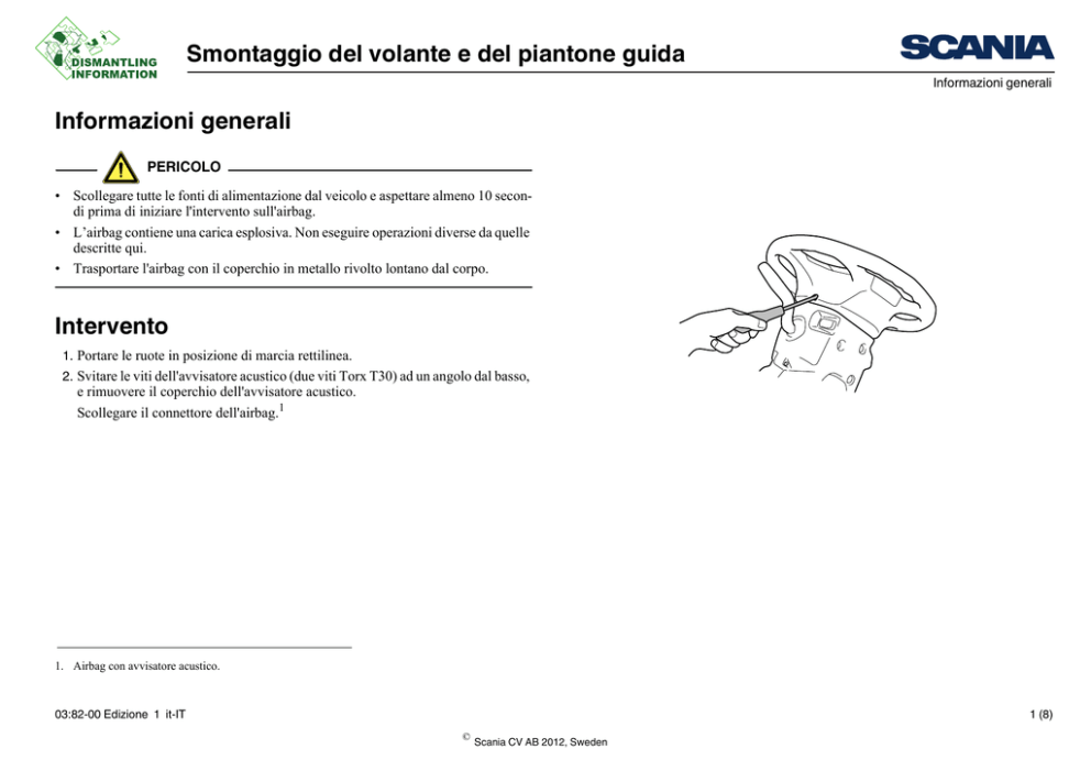 Smontaggio del volante e del piantone guida Informazioni generali Informazioni generali PERICOLO • Scollegare tutte le fonti di alimentazione dal veicolo e aspettare almeno 10 secondi prima di iniziare l'intervento sull'airbag. • L’airbag contiene una carica esplosiva. Non eseguire operazioni diverse da quelle descritte qui. • Trasportare l'airbag con il coperchio in metallo rivolto lontano dal corpo. Intervento 1. Portare le ruote in posizione di marcia rettilinea. 2. Svitare le viti dell'avvisatore acustico (due viti Torx T30) ad un angolo dal basso, e rimuovere il coperchio dell'avvisatore acustico. Scollegare il connettore dell'airbag.1 1. Airbag con avvisatore acustico. 03:82-00 Edizione 1 it-IT 1 (8) © Scania CV AB 2012, Sweden Smontaggio del volante e del piantone guida Intervento 145 343 3. Separare il connettore dal contatto spiralato. 03:82-00 Edizione 1 it-IT 2 (8) © Scania CV AB 2012, Sweden Smontaggio del volante e del piantone guida Intervento 4. Smontare i coperchi di protezione sotto il cruscotto e intorno al piantone di guida. 205 297 5. Svitare la vite centrale del volante e rimuovere il volante. 03:82-00 Edizione 1 it-IT 3 (8) © Scania CV AB 2012, Sweden Smontaggio del volante e del piantone guida Intervento 6. Staccare il connettore e rimuovere il contatto spiralato. Il contatto spiralato è fis- sato da 3 ganci di fissaggio, che vanno premuti verso l'interno durante lo smontaggio. 7. Smontare le leve indicatore di direzione, tergicristalli e rallentatore/Opticruise. 03:82-00 Edizione 1 it-IT 4 (8) © Scania CV AB 2012, Sweden Smontaggio del volante e del piantone guida Intervento 8. Smontare gli eventuali sensori angolo di sterzata. 9. Scollegare i connettori del blocchetto di avviamento e del ricetrasmettitore. 10. Tagliare i fermi del cablaggio. 11. Smontare il giunto a vite. 03:82-00 Edizione 1 it-IT 5 (8) © Scania CV AB 2012, Sweden Smontaggio del volante e del piantone guida Intervento 12. Separare il giunto tirando la parte inferiore del piantone guida verso il basso. 13. Spingere il piantone guida il più possibile verso il basso. 201 541 14. Scaricare il sistema pneumatico. 03:82-00 Edizione 1 it-IT 6 (8) © Scania CV AB 2012, Sweden Smontaggio del volante e del piantone guida Intervento 15. Smontare il flessibile dell'aria. 03:82-00 Edizione 1 it-IT 7 (8) © Scania CV AB 2012, Sweden Smontaggio del volante e del piantone guida Intervento 16. Svitare le 4 viti che fissano il piantone guida in sede. Le viti sono accessibili dal lato inferiore con il piantone di guida completamente rientrato. 17. Tirare il piantone di guida verso l'alto a un angolo obliquo e smontarlo. 03:82-00 Edizione 1 it-IT 8 (8) © Scania CV AB 2012, Sweden