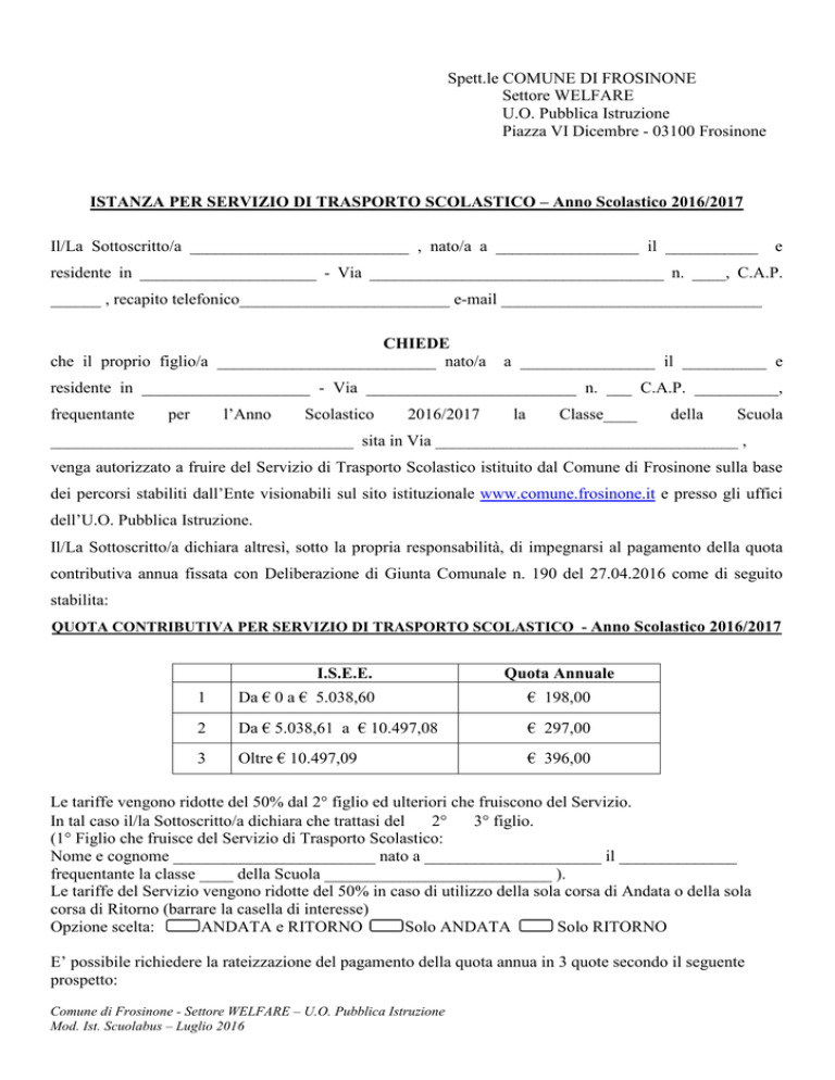Spett.le COMUNE DI FROSINONE Settore WELFARE U.O. Pubblica Istruzione Piazza VI Dicembre - 03100 Frosinone ISTANZA PER SERVIZIO DI TRASPORTO SCOLASTICO – Anno Scolastico 2016/2017 Il/La Sottoscritto/a __________________________ , nato/a a _________________ il ___________ e residente in _____________________ - Via ___________________________________ n. ____, C.A.P. ______ , recapito telefonico_________________________ e-mail _______________________________ CHIEDE che il proprio figlio/a __________________________ nato/a a ________________ il __________ e residente in ____________________ - Via _________________________ n. ___ C.A.P. __________, frequentante per l’Anno Scolastico 2016/2017 la Classe____ della Scuola ____________________________________ sita in Via ____________________________________ , venga autorizzato a fruire del Servizio di Trasporto Scolastico istituito dal Comune di Frosinone sulla base dei percorsi stabiliti dall’Ente visionabili sul sito istituzionale www.comune.frosinone.it e presso gli uffici dell’U.O. Pubblica Istruzione. Il/La Sottoscritto/a dichiara altresì, sotto la propria responsabilità, di impegnarsi al pagamento della quota contributiva annua fissata con Deliberazione di Giunta Comunale n. 190 del 27.04.2016 come di seguito stabilita: QUOTA CONTRIBUTIVA PER SERVIZIO DI TRASPORTO SCOLASTICO - Anno Scolastico 2016/2017 I.S.E.E. Quota Annuale 1 Da € 0 a € 5.038,60 € 198,00 2 Da € 5.038,61 a € 10.497,08 € 297,00 3 Oltre € 10.497,09 € 396,00 Le tariffe vengono ridotte del 50% dal 2° figlio ed ulteriori che fruiscono del Servizio. In tal caso il/la Sottoscritto/a dichiara che trattasi del 2° 3° figlio. (1° Figlio che fruisce del Servizio di Trasporto Scolastico: Nome e cognome ________________________ nato a _____________________ il ______________ frequentante la classe ____ della Scuola ___________________________ ). Le tariffe del Servizio vengono ridotte del 50% in caso di utilizzo della sola corsa di Andata o della sola corsa di Ritorno (barrare la casella di interesse) Opzione scelta: ANDATA e RITORNO Solo ANDATA Solo RITORNO E’ possibile richiedere la rateizzazione del pagamento della quota annua in 3 quote secondo il seguente prospetto: Comune di Frosinone - Settore WELFARE – U.O. Pubblica Istruzione Mod. Ist. Scuolabus – Luglio 2016 1 2 3 I.S.E.E. Quota Annua Da € 0 a € 5.038,60 Da € 5.038,61 a € 10.497,08 Oltre € 10.497,09 € 198,00 € 297,00 € 396,00 1° rata entro il 30.09.2016 € 66,00 € 99,00 € 132,00 2° rata entro il 31.12.2016 € 66,00 € 99,00 € 132,00 3° rata entro il 31.03.2017 € 66,00 € 99,00 € 132,00 Il/La Sottoscritto/a dichiara che effettuerà il pagamento della quota contributiva per il Servizio di Trasporto Scolastico nella seguente modalità (barrare la casella di interesse): A) Pagamento della quota annuale (da effettuarsi entro max il 30 settembre 2016); B) Rateizzazione della quota annuale in n. 3 rate (prospetto n. 1); Modalità di pagamento: - a mezzo Bonifico Bancario intestato a Tesoreria Comune di Frosinone - Banca Popolare Di Ancona IBAN: IT 92 B 05308 14800 000000010746; - Conto Corrente Postale Intestato a Tesoreria Comune di Frosinone - n. 13034038; (indicare nella causale: Servizio Scuolabus - nome e cognome del bambino, classe e scuola di appartenenza e periodo di pagamento). L’attestazione o le attestazioni di versamento della quota annuale o le attestazioni di versamento delle singole rate devono essere obbligatoriamente presentate presso l’Ufficio Mensa e Trasporto Scolastico – Via Adige, Frosinone o inviate a mezzo posta elettronica. Nel momento della presentazione della prima attestazione di versamento della rata sarà consegnata la Tessera Scuolabus che costituisce l’unico titolo valido per poter fruire del Servizio di Trasporto Scolastico. La stessa Tessera dovrà essere detenuta dal minore ed esibita al personale preposto. Si allega la seguente documentazione (necessaria ai fini dell’accoglimento della istanza di iscrizione al Servizio: - Documento di identità del richiedente in corso di validità; - Certificazione I.S.E.E corrente, sulla base della normativa vigente (D.P.C.M. 5.12.2013 n. 159), corredata dalla DSU (Dichiarazione Sostitutiva Unica). In caso di mancata presentazione della certificazione I.S.E.E., verrà applicata la tariffa massima; - Fototessera del minore. Ai sensi e per gli effetti di cui all’art. 13 del D.Lgs n. 196 del 30/06/2003, i dati personali saranno trattati, anche con strumenti informativi, esclusivamente nell’ambito del presente procedimento. Frosinone, __________________ In Fede ____________ Comune di Frosinone - Settore WELFARE – U.O. Pubblica Istruzione Mod. Ist. Scuolabus – Luglio 2016