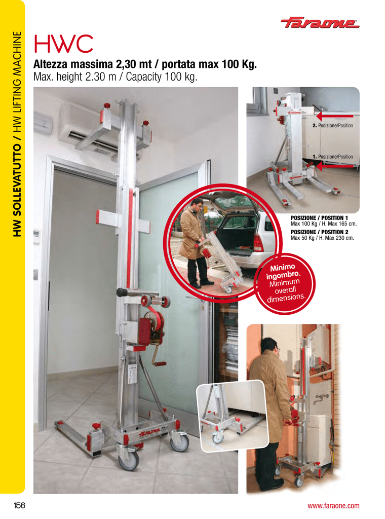 HW SOLLEVATUTTO / HW LIFTING MACHINE HWC Altezza massima 2,30 mt / portata max 100 Kg. Max. height 2.30 m / Capacity 100 kg. 2. Posizione/Position 1. Posizione/Position POSIZIONE / POSITION 1 Max 100 Kg / H. Max 165 cm. POSIZIONE / POSITION 2 Max 50 Kg / H. Max 230 cm. Minimo . ingombro Minimum overall s. dimension 156 www.faraone.com C E R T I F I C A T A / C E R T I F I E D S A F E T Y P H H HW Sollevatutto chiuso HW Sollevatutto closed L P L HW Sollevatutto aperto HW Sollevatutto open L. H. P. L. H. P. HW 270 S HW 270 BIG HW 415 S HW 415 BIG HW 550 S HW 550 BIG HW C230 mt. 0,45 mt. 0,45 mt. 0,45 mt. 0,45 mt. 0,45 mt. 0,45 mt. 0,42 mt. 1,78 mt. 1,78 mt. 1,78 mt. 1,78 mt. 1,78 mt. 1,78 mt. 1,10 mt. 0,63 mt. 0,63 mt. 0,63 mt. 0,63 mt. 0,63 mt. 0,63 mt. 0,59 mt. 0,96 mt. 0,96 mt. 0,96 mt. 0,96 mt. 1,31 mt. 1,31 mt. 0,90 mt. 1,82 mt. 1,82 mt. 1,82 mt. 1,82 mt. 1,82 mt. 1,82 mt. 1,10 mt. 1,15 mt. 1,15 mt. 1,15 mt. 1,15 mt. 1,52 mt. 1,52 mt. 0,59 Montaggio di tapparelle. Installing shutters. MAX Kg Kg Articolo Item Installazione di serrande. Installing rolling gates. H. MAX EURO mt. 2,70 mt. 2,70 mt. 4,15 mt. 4,15 mt. 5,50 mt. 5,50 mt. 1,65/2,30 200 300 150 250 100 200 100/50 55 72 63 86 74 103 35.5 Carico e scarico merci. Loading/unloading goods. Montaggio caldaie. Installing boilers. Montaggio di condizionatori e climatizzatori. Installing air-conditioning systems. Montaggio di pannelli in cartongesso. Installing plasterboard panels. 1.474 2.210 1.710 2.420 1.841 2.750 1.290 SOLLEVATUTTO HW / HW LIFTING MACHINE S I C U R E Z Z A è vietaton! forbidde s!! operation L’illustrazione raffigura un comportamento vietato dalle normative. The figure shows an example of operations not allowed by regulations. Accessori Accessories Articolo Item HW.S1 HW.S3 HW.S4 HW.S5 Descrizione Description Kit stabilizzatore con vite Stabiliser kit with screw Supporto sollevamento cartongesso Support for plasterboard Supporto sollevamento vetro con ventose e manometro Support for glass with two suction pads with manometer Kit per sbalzo frontale con zavorre in ghisa Kit per sbalzo frontale con zavorre in ghisa HW Sollevatutto garantisce una maggiore sicurezza nel montaggio, spostamento, carico e scarico di lastre in vetro, pensiline, grandi vetrate o infissi. EURO 351 314 858 790 speciale tri! KIT per ve special KIT for glass! HW Sollevatutto (general-purpose lift) guarantees improved safety when installing, moving, loading or unloading glass sheets, canopies, large panes or fixtures. www.faraone.com 157