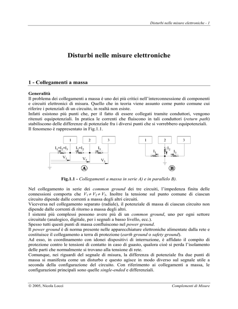 Disturbi nelle misure elettroniche - 1 Disturbi nelle misure elettroniche 1 - Collegamenti a massa Generalità Il problema dei collegamenti a massa è uno dei più critici nell’interconnessione di componenti e circuiti elettronici di misura. Quello che in teoria viene assunto come punto comune cui riferire i potenziali di un circuito, in realtà non esiste. Infatti esistono più punti che, per il fatto di essere collegati tramite conduttori, vengono ritenuti equipotenziali. In pratica le correnti che fluiscono in tali conduttori (return path) stabiliscono delle differenze di potenziale fra i diversi punti che si vorrebbero equipotenziali. Il fenomeno è rappresentato in Fig.1.1. Fig.1.1 - Collegamenti a massa in serie A) e in parallelo B). Nel collegamento in serie dei common ground dei tre circuiti, l’impedenza finita delle connessioni comporta che V1 ≠ V2 ≠ V3. Inoltre la tensione sul punto comune di ciascun circuito dipende dalle correnti a massa degli altri circuiti. Viceversa nel collegamento separato (radiale), il potenziale di massa di ciascun circuito non dipende dalle correnti di ritorno a massa degli altri. I sistemi più complessi possono avere più di un common ground, uno per ogni settore circuitale (analogico, digitale, per i segnali a basso livello, ecc.). Spesso tutti questi punti di massa confluiscono nel power ground. Il power ground è di norma presente nelle apparecchiature elettroniche alimentate dalla rete e costituisce il collegamento a terra di protezione (earth ground o safety ground). Ad esso, in coordinamento con idonei dispositivi di interruzione, è affidato il compito di protezione contro le tensioni di contatto in caso di guasto, qualora cioè si perda l’isolamento delle parti che normalmente si trovano alla tensione di rete. Comunque, nei riguardi del segnale di misura, la differenza di potenziale fra due punti di massa si manifesta come un disturbo e questo agisce in modo diverso sul segnale utile a seconda della configurazione del circuito. Con riferimento ai collegamenti a massa, le configurazioni principali sono quelle single-ended e differenziali. 2005, Nicola Locci Complementi di Misure Disturbi nelle misure elettroniche - 2 Configurazioni single-ended Si consideri lo schema di Fig.1.2A, dove il segnale utile Vs viene applicato allo strumento di misura attraverso un amplificatore single-ended con impedenza di ingresso Zin. Il fatto che le masse per il segnale e per il dispositivo di misura possano essere a potenziali diversi è posto in evidenza utilizzando per esse simboli differenti. Indicheremo pertanto con Vg e Zg i parametri del generatore equivalente di disturbo presente fra i due punti di massa. Nelle configurazioni single-ended, il disturbo dovuto alla tensione Vg fra le masse è particolarmente insidioso in quanto si presenta in serie con il segnale utile. Fig.1.2 - Configurazioni single-ended. Spesso risulta benefico creare un collegamento diretto fra la massa del segnale e quella dello strumento (Fig.1.2B). Bisogna tuttavia tener presente che il collegamento Zb, benchè a bassa resistenza, presenta anche delle induttanze parassite, la cui importanza cresce con la frequenza. Configurazioni differenziali Nelle configurazioni differenziali, la tensione di disturbo fra le masse risulta di modo comune. Con riferimento al circuito equivalente (Fig.1.3) dell’amplificatore differenziale (o per strumentazione), l’effetto della tensione di modo comune Vg sull’impedenza differenziale d’ingresso Zin può essere fortemente ridotto (tanto da risultare praticamente trascurabile) se si cura la simmetria delle impedenze in serie su ciascun ingresso (Zs+Za = Zb). Infatti, poichè in pratica le impedenze Zc che ciascun ingresso (H o L) presenta verso massa sono praticamente uguali (e particolarmente elevate), il circuito è riconducibile a un ponte in equilibrio e pertanto risulta nulla la tensione fra i punti H ed L per effetto della tensione di modo comune Vg. Fig.1.3 - Configurazione differenziale. Per applicazioni particolarmente delicate (segnali utili di intensità molto debole) gli effetti delle tensioni di modo comune possono essere efficacemente contrastati anche con tecniche di guard. Con riferimento alla Fig.1.4, l’amplificatore vero e proprio è racchiuso in un involucro metallico di schermo (quello più interno), al quale vengono collegati i common di 2005, Nicola Locci Complementi di Misure Disturbi nelle misure elettroniche - 3 funzionamento. Tale involucro è poi collegato all’involucro più esterno, il telaio dello strumento, che è connesso alla presa di terra, tramite l’impedenza Z0 di valore particolarmente elevato, essendo costituita da un’impedenza di dispersione fra schermo e telaio. Fig.1.4 - Schema per la funzione di guard. L’ingresso dello strumento, oltre ai morsetti H ed L dispone anche di un morsetto di guard. Questo collega lo schermo di guardia a un morsetto del generatore di segnale, come mostrato in figura, tramite un conduttore di bassissima resistenza. In tal modo la corrente dovuta al disturbo di modo comune Vg viene cortocircuitata dal conduttore di guardia e tutta la tensione di modo comune cade ai capi dell’impedenza di isolamento Z0 senza interessare la maglia del circuito di segnale. 2 - Accoppiamenti induttivi Schema di principio I disturbi che nascono per accoppiamento induttivo sono dovuti alla circolazione di correnti. Si considerino pertanto due conduttori come rappresentato nello schema di Fig.2.1. Il primo, detto circuito disturbante, è percorso dalla corrente I1; il secondo, detto circuito disturbato, trasferisce il segnale di misura Vs allo stadio di ingresso Rin di uno strumento. Fig.2.1 - Schema per l’accoppiamento induttivo. La corrente I1 circolante nel conduttore "1" determina un flusso Φ che si concatena anche con il conduttore "2". La mutua induttanza M12 presente fra i due conduttori è responsabile dell’accoppiamento induttivo. 2005, Nicola Locci Complementi di Mis
