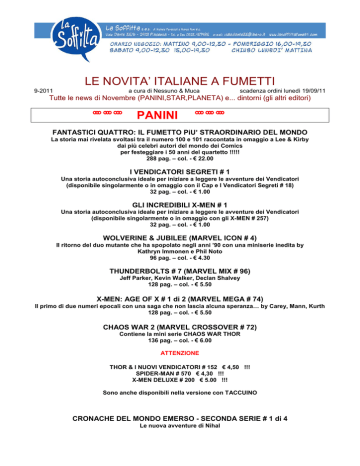 LE NOVITA’ ITALIANE A FUMETTI 9-2011 a cura di Nessuno & Muca scadenza ordini lunedì 19/09/11 Tutte le news di Novembre (PANINI,STAR,PLANETA) e... dintorni (gli altri editori) °°° °°° °°° PANINI °°° °°° °°° FANTASTICI QUATTRO: IL FUMETTO PiU’ STRAORDINARIO DEL MONDO La storia mai rivelata svoltasi tra il numero 100 e 101 raccontata in omaggio a Lee & Kirby dai più celebri autori del mondo dei Comics per festeggiare i 50 anni del quartetto !!!!! 288 pag. – col. - € 22.00 I VENDICATORI SEGRETI # 1 Una storia autoconclusiva ideale per iniziare a leggere le avventure dei Vendicatori (disponibile singolarmente o in omaggio con il Cap e I Vendicatori Segreti # 18) 32 pag. – col. - € 1.00 GLI INCREDIBILI X-MEN # 1 Una storia autoconclusiva ideale per iniziare a leggere le avventure dei Vendicatori (disponibile singolarmente o in omaggio con gli X-MEN # 257) 32 pag. – col. - € 1.00 WOLVERINE & JUBILEE (MARVEL ICON # 4) Il ritorno del duo mutante che ha spopolato negli anni ’90 con una miniserie inedita by Kathryn Immonen e Phil Noto 96 pag. – col. - € 4.30 THUNDERBOLTS # 7 (MARVEL MIX # 96) Jeff Parker, Kevin Walker, Declan Shalvey 128 pag. – col. - € 5.50 X-MEN: AGE OF X # 1 di 2 (MARVEL MEGA # 74) Il primo di due numeri epocali con una saga che non lascia alcuna speranza… by Carey, Mann, Kurth 128 pag. – col. - € 5.50 CHAOS WAR 2 (MARVEL CROSSOVER # 72) Contiene la mini serie CHAOS WAR THOR 136 pag. – col. - € 6.00 ATTENZIONE THOR & I NUOVI VENDICATORI # 152 € 4,50 !!! SPIDER-MAN # 570 € 4,30 !!! X-MEN DELUXE # 200 € 5.00 !!! Sono anche disponibili nella versione con TACCUINO CRONACHE DEL MONDO EMERSO - SECONDA SERIE # 1 di 4 Le nuova avventure di Nihal 40 pag. – col. - € 3.50 100% PANINI COMICS STAN LEE SOLDIER ZERO # 1 Un nuovo volume della linea supereroistica pubblicata negli USA dai Boom! Studios e concepita da Stan Lee. Testi Paul Cornell e disegni di Javier Pina 96 pag. – col. - € 11.00 TAKIO Dagli autori della serie POWERS BRIAN MICHAEL BENDIS e MICHAEL AVON OEMING Una coppia di sorelline con superpoteri che litiga in continuazione tra un salvataggio del mondo e... 96 pag. – col. - € 11.00 100% ARTIFACTS # 2 Witchblade, Aphrodite IV, Darkness, Hunter Killer, Cyberforce 96 pag. – col. - € 11.00 MY NAME IS TEX Prima collaborazione Panini/Sergio Bonelli Editore per omaggiare il nostro ranger con un CD di canzoni di Graziano Romani, due rare storie ricolorate appositamente e una breve storia inedita !!!!! 48 pag. – col. - € 9.90 D.GRAY-MAN ILLUSTRATIONS: NOCHE Il libro di illustrazioni dedicato al mondo di Hoshino 96 pag. – b/n e col. - € 19.90 PSYCHIC DETECTIVE YAKUMO – L’INVESTIGATORE DELL’OCCULTO # 1 Suzuka Oda Dal romanzo che ha ispirato una serie animata, un live action ed uno spettacolo teatrale !!! Provatelo... 184 pag. – b/n - € 4.30 WHITE HAIRED DEVIL # 1 di 6 Ryoichi Ikegami e Kazuo Koike Un Manga torbido e violento... …questa la presentazione della mini ideata dagli autori di LONE WOLF & CUB e CRYING FREEMAN 408 pag. – b/n - € 9.00 GEKKA BIJIN – LA PRINCIPESSA GUERRIERA # 1 Il destino di una giovane principessa erede al trono 184 pag. – b/n - € 3.90 VAMPIRE KNIGHT FANBOOK Schede, aneddoti, retroscene... tutto sul famoso Manga di Hino 208 pag. – b/n e col. - € 5.90 *** *** *** *** *** STAR *** *** *** *** *** KEPHER # 1 La fantascienza stellare di Roberto Cardinale, Stefano Nocilli, Vito Rallo e copertine di Fabbri RIPROPOSTA finalmente in uscita a novembre 96 pag. – b/n - € 2.70 LEGION 75 # 1 Walter Riccio e Daniele Statella 1975. Ti chiami Byron Truman e sei un assassino su contratto. Il migliore. Non puoi essere da meno se il tuo committente è la Military Intelligence Section 6, più comunemente nota come “MI6”: l’agenzia nazionale di spionaggio britannica. Sei cinico, freddo, spietato. Pensi in fretta, fiuti il sangue, colpisci brutalmente. Hai un talento naturale per il tuo lavoro. Anneghi i sensi di colpa nell’alcol e sciogli il rimorso nell’acido lisergico. Succede, quando la vita ti ha colpito così duro, giù dritto nello stomaco, da farti vomitare anche l’anima. Non ti rimane niente, solo l’Odio. Da lì in poi, puoi solo odiare i tuoi simili. E farti odiare da loro. Poi arriva il giorno in cui il passato ti chiede il conto. E allora devi scegliere: o reagisci o muori. Nel tuo caso il passato è Caliban, il serial killer che credevi di aver ucciso. L’uomo responsabile della tua decadenza. Certo, basterebbe un’altra pallottola, magari due. Ma oggi il bastardo ha complici ovunque ed è al vertice di una surreale setta di psicopatici col pallino di sovvertire il concetto stesso di Umanità. Sei solo contro tutti. È allora che scopri che il tessuto della realtà è strappato. E attraverso i suoi buchi intravedi le tenebre di un antico passato, l’orrore di un allucinante universo popolato da esseri mostruosi… 1985. Non ti ricordi chi sei. Non hai più un nome. Fottuta amnesia… Attorno a te, imponenti creature umanoidi usano la nostra specie come nutrimento. Li chiamano “Legione”: predatori nati, guidati solo dal loro istinto assassino. Riprodursi. Nutrirsi. Uccidere. Giorno dopo giorno, hai visto morire tutti i tuoi simili. Finché sei rimasto SOLO. Forse più scaltro, forse più fortunato. Ma senza un’identità. Senza una storia. Senza sapere chi sei. I tuoi ricordi sono pezzi di un puzzle senza senso che non riesci a mettere assieme. Sospetti di te stesso. Tu, l’ultimo sopravvissuto, credi di essere il demiurgo di questo caos, il responsabile dell’annientamento del genere umano. O forse stai solo affogando nella paranoia… Ma c’è qualcosa di più importante: SOPRAVVIVERE! Là fuori ci sono un sacco di bastardi predatori pronti a spartirsi la carne dell’ultima preda, la TUA carne. Per questo vivi recluso nella tua tana, nei recessi di una Londra ormai in cenere. Poi accade qualcosa. Una voce alla radio riaccende la sper