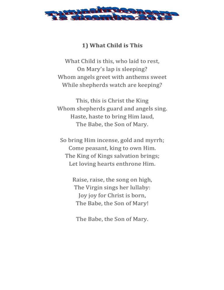 1)WhatChildisThis WhatChildisthis,wholaidtorest, OnMary'slapissleeping? Whomangelsgreetwithanthemssweet Whileshepherdswatcharekeeping? This,thisisChristtheKing Whomshepherdsguardandangelssing. Haste,hastetobringHimlaud, TheBabe,theSonofMary. SobringHimincense,goldandmyrrh; Comepeasant,kingtoownHim. TheKingofKingssalvationbrings; LetlovingheartsenthroneHim. Raise,raise,thesongonhigh, TheVirginsingsherlullaby: JoyjoyforChristisborn, TheBabe,theSonofMary! TheBabe,theSonofMary. 2) NEARER MY GOD TO THEE In articulo mortis caelitus mihi vires Nearer my God , to Thee Oooooooooooooo Nearer to Thee Oooooooooooooo E'en though it be a cross Oooooooooooooo That raiseth me Oooooooooooooo There let the way appear In articulo mortis caelitus mihi vires Steps unto heav'n deo adjuvante non timendum in perpetuum All that Thou sendest me dirige nos domine ad Augusta per angusta In mercy giv'n Sic itur ad astra Excelsior Excelsior – Excelsior – Excelsior – Excelsi Still al my song shall be Nearer my God, to Thee Nearer my God, to Thee dirige nos domine ad Augusta per angusta Sic itur ad astra Excelsior In articulo mortis caelitus mihi vires Nearer my God, to Thee Nearer to Thee Though like the wanderer The sun gone down deo adjuvante non timendum in perpetuum Darkness be over me dirige nos domine ad Augusta per angusta My rest a stone Sic itur ad astra Excelsior Excelsior – Excelsior – Excelsior – Excelsi Angels to beckon me Nearer my God, to Thee Nearer my God, to Thee dirige nos domine ad Augusta per angusta Nearer my God, to Thee Nearer to thee ì Sic itur ad astra Excelsior (U1) Excelsior (U2) Excelsior (U1) Excelsior (U2) Excelsior (U1) Excelsior (U2) Excelsior In articulo mortis caelitus mihi vires Cleaving the sky deo adjuvante non timendum in perpetuum Sun, moon, and stars forgot dirige nos domine ad Augusta per angusta Upward I fly. ì (U2) Sic itur ad astra Excelsi (U1) dirige nos domine ad Augusta per angusta (U1 - U2) Sic itur ad astra Excelsior Or if, on joyful wing 3) ONE LOVE Onelove.Oneheart(n’ammor,nucore) Let'sgettogetherandfeelalright(mettimctutt’assieme,accussìstammbuon!) Herethechildrencrying(n’ammor,nucore) Saying-GivethanksandpraisestotheLord AndIwillfeelalright(mettimctutt’assieme,accussìstammbuon!) Saying-Let'sgettogetherandfeelalright(mettimctutt’assieme,accussìstammbuon!) Letthemallpasstheirdirtyremarks(n’ammor) ThereisonequestionI'dreallylovetoask(nucore) Isthereaplaceforthehopelesssinner Whohashurtallmankind Justtosavehisown Believeme Onelove.Oneheart(n’ammore,nucore) Let'sgettogetherandfeelalright(mettimctutt’assieme,accussìstammbuon!) Asitwasinthebeginning(n’ammor) Soshallitbeintheend(nucore) GivethanksandpraisestotheLord AndIwillfeelalright(mettimctutt’assieme,accussìstammbuon!) Let'sgettogetherandfeelalright(mettimctutt’assieme,accussìstammbuon!) Onemorething Let'sgettogethertofightthisholyArmageddon(n’ammor) Sowhenthemancomes Therewillbeno-noDoom(nusuon) Havepityonthose Whosechancesgrowsthinner Thereain'tnohidingplace FromtheFatherofcreation Saying Onelove.Oneheart(n’ammore,nucore) Let'sgettogetherandfeelalright.(mettimctutt’assieme,accussìstammbuon!) I'mpleaingtomankind Onelove.Oneheart.(n’ammore,nucore) GivethanksandpraisestotheLord AndIwillfeelalright(mettimctutt’assieme,accussìstammbuon!) Let'sgettogetherandfeelalright(mettimctutt’assieme,accussìstammbuon!) Givethanksandpraisesandfeel Alright-Let'sgettogetherandfeelalright(mettimctutt’assieme,accussìstammbuon!) (mettimctutt’assieme,accussìstamm………..buon!) 4) HAPPY It might seem crazy what I’m about to say Sunshine she’s here, you can take away I’m a hot air balloon that could go to space With the air, like I don’t care baby by the way Because I’m happy / Clap along if you feel like a room without a roof Because I’m happy / Clap along if you feel like happiness is the truth Because I’m happy / Clap along if you know what happiness is to you Because I’m happy / Clap along if you feel like that’s what you wanna do Here come bad news talking this and that - Yeah Give me all you got, don’t hold back - Yeah Well I should probably warn you I’ll be just fine - Yeah No offense to you don’t waste your time Here’s why Because I’m happy / Clap along if you feel like a room without a roof Because I’m happy / Clap along if you feel like happiness is the truth Because I’m happy / Clap along if you know what happiness is to you Because I’m happy / Clap along if you feel like that’s what you wanna do Happy, come on, bring me down Happy, come on, bring me down Love is too happy to bring me down Come on, bring me down I said bring me down Come on, bring me down Love is too happy to bring me down Come on, bring me down I said Because I’m happy / Clap along if you feel like a room without a roof Because I’m happy / Clap along if you feel like happiness is the truth Because I’m happy / Clap along if you know what happiness is to you Because I’m happy / Clap along if you feel like that’s what you wanna do Because I’m happy / Clap along if you feel like a room without a roof Because I’m happy / Clap along if you feel like happiness is the truth Because I’m happy / Clap along if you know what happiness is to you Because I’m happy / Clap along if you feel like that’s what you wanna do Happy, come on, bring me down Happy, come on, bring me down Love is too happy to bring me down Come on, bring me down I said bring me down Come on, bring me down Love is too happy to bring me down Come on, bring me down I said Because I’m happy / Clap along if you feel like a room without a roof Because I’m happy / Clap along if you feel like happiness is the truth Because I’m happy / Clap along if you know what happiness is to you Because I’m happy / Clap along if you feel like that’s what you wanna do Because I’m happy / Clap along if you feel like a room without a roof Because I’m happy / Clap along if you feel like happiness i