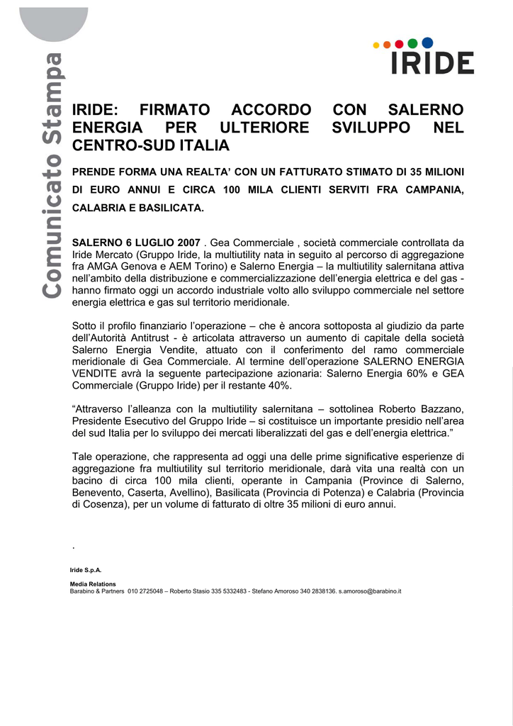 IRIDE: FIRMATO ACCORDO ENERGIA PER ULTERIORE CENTRO-SUD ITALIA CON SALERNO SVILUPPO NEL PRENDE FORMA UNA REALTA’ CON UN FATTURATO STIMATO DI 35 MILIONI DI EURO ANNUI E CIRCA 100 MILA CLIENTI SERVITI FRA CAMPANIA, CALABRIA E BASILICATA. SALERNO 6 LUGLIO 2007 . Gea Commerciale , società commerciale controllata da Iride Mercato (Gruppo Iride, la multiutility nata in seguito al percorso di aggregazione fra AMGA Genova e AEM Torino) e Salerno Energia – la multiutility salernitana attiva nell’ambito della distribuzione e commercializzazione dell’energia elettrica e del gas hanno firmato oggi un accordo industriale volto allo sviluppo commerciale nel settore energia elettrica e gas sul territorio meridionale. Sotto il profilo finanziario l’operazione – che è ancora sottoposta al giudizio da parte dell’Autorità Antitrust - è articolata attraverso un aumento di capitale della società Salerno Energia Vendite, attuato con il conferimento del ramo commerciale meridionale di Gea Commerciale. Al termine dell’operazione SALERNO ENERGIA VENDITE avrà la seguente partecipazione azionaria: Salerno Energia 60% e GEA Commerciale (Gruppo Iride) per il restante 40%. “Attraverso l’alleanza con la multiutility salernitana – sottolinea Roberto Bazzano, Presidente Esecutivo del Gruppo Iride – si costituisce un importante presidio nell’area del sud Italia per lo sviluppo dei mercati liberalizzati del gas e dell’energia elettrica.” Tale operazione, che rappresenta ad oggi una delle prime significative esperienze di aggregazione fra multiutility sul territorio meridionale, darà vita una realtà con un bacino di circa 100 mila clienti, operante in Campania (Province di Salerno, Benevento, Caserta, Avellino), Basilicata (Provincia di Potenza) e Calabria (Provincia di Cosenza), per un volume di fatturato di oltre 35 milioni di euro annui. . Iride S.p.A. Media Relations Barabino & Partners 010 2725048 – Roberto Stasio 335 5332483 - Stefano Amoroso 340 2838136. [email protected]