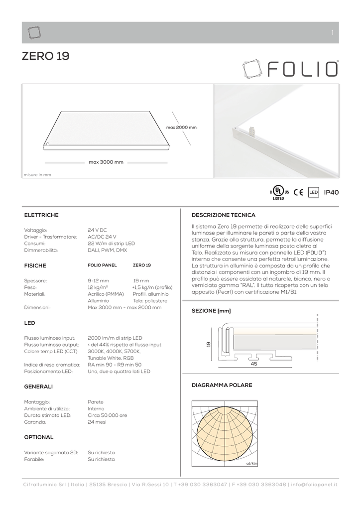 1 ZERO 19 max 2000 mm max 3000 mm misure in mm LED ELETTRICHE DESCRIZIONE TECNICA Voltaggio: Driver - Trasformatore: Consumi: Dimmerabilità: 24 V DC AC/DC 24 V 22 W/m di strip LED DALI, PWM, DMX FISICHE FOLIO PANEL Spessore: Peso: Materiali: 9-12 mm 19 mm 12 kg/m2 +1,5 kg/m (profilo) Acrilico (PMMA) Profili: alluminio Alluminio Telo: poliestere Max 3000 mm - max 2000 mm Dimensioni: IP40 ZERO 19 Il sistema Zero 19 permette di realizzare delle superfici luminose per illuminare le pareti o parte della vostra stanza. Grazie alla struttura, permette la diffusione uniforme della sorgente luminosa posta dietro al Telo. Realizzato su misura con pannello LED (Folio ®) interno che consente una perfetta retroilluminazione. La struttura in alluminio è composta da un profilo che distanzia i componenti con un ingombro di 19 mm. Il profilo può essere ossidato al naturale, bianco, nero o verniciato gamma “RAL”. Il tutto ricoperto con un telo apposito (Pearl) con certificazione M1/B1. SEZIONE [mm] Flusso luminoso input: Flusso luminoso output: Colore temp LED (CCT): Indice di resa cromatica: Posizionamento LED: 2000 lm/m di strip LED < del 44% rispetto al flusso input 3000K, 4000K, 5700K, Tunable White, RGB RA min 90 - R9 min 50 Uno, due o quattro lati LED 45 DIAGRAMMA POLARE GENERALI Montaggio: Ambiente di utilizzo; Durata stimata LED: Garanzia: 19 LED Parete Interno Circa 50.000 ore 24 mesi OPTIONAL Variante sagomata 2D: Forabile: Su richiesta Su richiesta cd/klm Cifralluminio Srl | Italia | 25135 Brescia | Via R.Gessi 10 | T +39 030 3363047 | F +39 030 3363048 | [email protected] 2 ZERO 19 ISTRUZIONI SOSTITUZIONE BANNER Quando è chiuso il banner rimane perfetttamente in tensione. La linguetta rende semplice l’operazione di smontaggio. Il banner può essere sfilato facilmente dalla cornice e sostituito. ZERO 19 CONTENUTO 1 1 Banner in tessuto con linguetta per sostituzione 2 2 Pannello Folio 3 3 Struttura in alluminio Cifralluminio Srl | Italia | 25135 Brescia | Via R.Gessi 10 | T +39 030 3363047 | F +39 030 3363048 | [email protected] 3 ZERO 19 APPLICAZIONI Cifralluminio Srl | Italia | 25135 Brescia | Via R.Gessi 10 | T +39 030 3363047 | F +39 030 3363048 | [email protected]