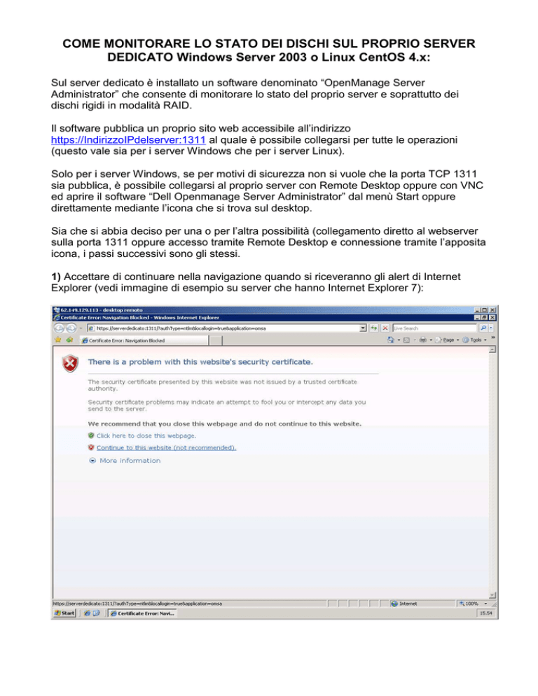 COME MONITORARE LO STATO DEI DISCHI SUL PROPRIO SERVER DEDICATO Windows Server 2003 o Linux CentOS 4.x: Sul server dedicato è installato un software denominato “OpenManage Server Administrator” che consente di monitorare lo stato del proprio server e soprattutto dei dischi rigidi in modalità RAID. Il software pubblica un proprio sito web accessibile all’indirizzo https://IndirizzoIPdelserver:1311 al quale è possibile collegarsi per tutte le operazioni (questo vale sia per i server Windows che per i server Linux). Solo per i server Windows, se per motivi di sicurezza non si vuole che la porta TCP 1311 sia pubblica, è possibile collegarsi al proprio server con Remote Desktop oppure con VNC ed aprire il software “Dell Openmanage Server Administrator” dal menù Start oppure direttamente mediante l’icona che si trova sul desktop. Sia che si abbia deciso per una o per l’altra possibilità (collegamento diretto al webserver sulla porta 1311 oppure accesso tramite Remote Desktop e connessione tramite l’apposita icona, i passi successivi sono gli stessi. 1) Accettare di continuare nella navigazione quando si riceveranno gli alert di Internet Explorer (vedi immagine di esempio su server che hanno Internet Explorer 7): 2) Se richiesto, inserire le credenziali di accesso dell’utente “root” in caso di server Linux o dell’utente “admin123456” (il numero è il numero d’ordine del vostro server) nel caso di server Windows: 3) Da questa pagina web è possibile controllare lo stato del sistema: Sulla sinistra nella pagina si trova una struttura ad albero dove è possibile controllare lo stato dei vari componenti che costituiscono il server. In linea di massima tutti i componenti debbono avere accanto un segno di spunta verde, che significa “funziona correttamente”. Uno dei componenti più importanti è quello relativo allo “storage” ossia gli hard disk collegati al server. Tutti i sistemi RAID1 e RAID5 consentono che uno dei dischi componenti l’array (gruppo di dischi) si guasti senza che il server smetta di funzionare e senza perdite di dati. Se però due dischi che fanno parte dell’array RAID1 o RAID5 smettono di funzionare, il server si blocca ed è possibile che tutti i dati presenti siano irrimediabilmente danneggiati. Per questo motivo è molto importante effettuare un monitoraggio periodico e costante dello stato del proprio server, segnalando allo staff Aruba eventuali malfunzionamenti riscontrati in modo che sia possibile intervenire al più presto per sistemarli. Le immagini seguenti si riferiscono ad un server “Village”, “Town” oppure “City” RAID1 che utilizza il controller Serial ATA “CERC 1.5 a 6 canali”. La guida è comunque applicabile anche ai sistemi Metropolis SCSI RAID1 o RAID5 con poche differenze. 4) Esempio di server dove i dischi stanno funzionando correttamente: 5) Esempio di server dove l’array RAID1 è in modalità “degraded” in quanto uno dei dischi non è più funzionante: