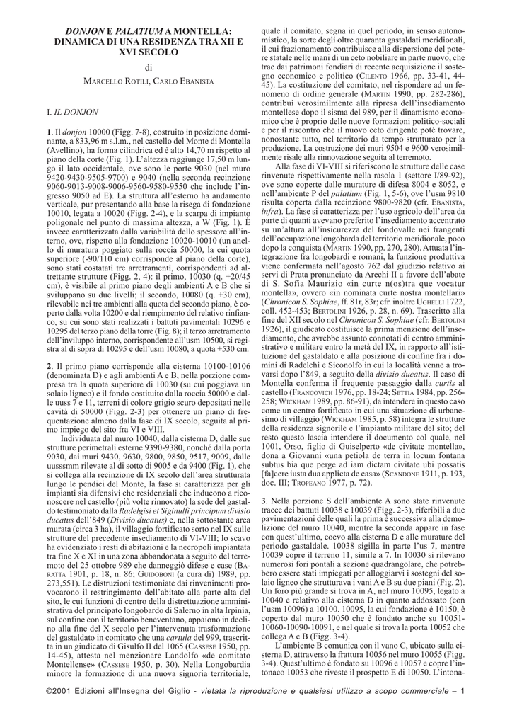 DONJON E PALATIUM A MONTELLA: DINAMICA DI UNA RESIDENZA TRA XII E XVI SECOLO di MARCELLO ROTILI, CARLO EBANISTA I. IL DONJON 1. Il donjon 10000 (Figg. 7-8), costruito in posizione dominante, a 833,96 m s.l.m., nel castello del Monte di Montella (Avellino), ha forma cilindrica ed è alto 14,70 m rispetto al piano della corte (Fig. 1). L’altezza raggiunge 17,50 m lungo il lato occidentale, ove sono le porte 9030 (nel muro 9420-9430-9505-9700) e 9040 (nella seconda recinzione 9060-9013-9008-9006-9560-9580-9550 che include l’ingresso 9050 ad E). La struttura all’esterno ha andamento verticale, pur presentando alla base la risega di fondazione 10010, legata a 10020 (Figg. 2-4), e la scarpa di impianto poligonale nel punto di massima altezza, a W (Fig. 1). È invece caratterizzata dalla variabilità dello spessore all’interno, ove, rispetto alla fondazione 10020-10010 (un anello di muratura poggiato sulla roccia 50000, la cui quota superiore (-90/110 cm) corrisponde al piano della corte), sono stati costatati tre arretramenti, corrispondenti ad altrettante strutture (Figg. 2, 4): il primo, 10030 (q. +20/45 cm), è visibile al primo piano degli ambienti A e B che si sviluppano su due livelli; il secondo, 10080 (q. +30 cm), rilevabile nei tre ambienti alla quota del secondo piano, è coperto dalla volta 10200 e dal riempimento del relativo rinfianco, su cui sono stati realizzati i battuti pavimentali 10296 e 10295 del terzo piano della torre (Fig. 8); il terzo arretramento dell’inviluppo interno, corrispondente all’usm 10500, si registra al di sopra di 10295 e dell’usm 10080, a quota +530 cm. 2. Il primo piano corrisponde alla cisterna 10100-10106 (denominata D) e agli ambienti A e B, nella porzione compresa tra la quota superiore di 10030 (su cui poggiava un solaio ligneo) e il fondo costituito dalla roccia 50000 e dalle uuss 7 e 11, terreni di colore grigio scuro depositati nelle cavità di 50000 (Figg. 2-3) per ottenere un piano di frequentazione almeno dalla fase di IX secolo, seguita al primo impiego del sito fra VI e VIII. Individuata dal muro 10040, dalla cisterna D, dalle sue strutture perimetrali esterne 9390-9380, nonché dalla porta 9030, dai muri 9430, 9630, 9800, 9850, 9517, 9009, dalle uusssmm rilevate al di sotto di 9005 e da 9400 (Fig. 1), che si collega alla recinzione di IX secolo dell’area strutturata lungo le pendici del Monte, la fase si caratterizza per gli impianti sia difensivi che residenziali che inducono a riconoscere nel castello (più volte rinnovato) la sede del gastaldo testimoniato dalla Radelgisi et Siginulfi principum divisio ducatus dell’849 (Divisio ducatus) e, nella sottostante area murata (circa 3 ha), il villaggio fortificato sorto nel IX sulle strutture del precedente insediamento di VI-VIII; lo scavo ha evidenziato i resti di abitazioni e la necropoli impiantata tra fine X e XI in una zona abbandonata a seguito del terremoto del 25 ottobre 989 che danneggiò difese e case (BARATTA 1901, p. 18, n. 86; GUIDOBONI (a cura di) 1989, pp. 273,551). Le distruzioni testimoniate dai rinvenimenti provocarono il restringimento dell’abitato alla parte alta del sito, le cui funzioni di centro della distrettuazione amministrativa del principato longobardo di Salerno in alta Irpinia, sul confine con il territorio beneventano, appaiono in declino alla fine del X secolo per l’intervenuta trasformazione del gastaldato in comitato che una cartula del 999, trascritta in un giudicato di Gisulfo II del 1065 (CASSESE 1950, pp. 14-45), attesta nel menzionare Landolfo «de comitato Montellense» (CASSESE 1950, p. 30). Nella Longobardia minore la formazione di una nuova signoria territoriale, quale il comitato, segna in quel periodo, in senso autonomistico, la sorte degli oltre quaranta gastaldati meridionali, il cui frazionamento contribuisce alla dispersione del potere statale nelle mani di un ceto nobiliare in parte nuovo, che trae dai patrimoni fondiari di recente acquisizione il sostegno economico e politico (CILENTO 1966, pp. 33-41, 4445). La costituzione del comitato, nel rispondere ad un fenomeno di ordine generale (MARTIN 1990, pp. 282-286), contribuì verosimilmente alla ripresa dell’insediamento montellese dopo il sisma del 989, per il dinamismo economico che è proprio delle nuove formazioni politico-sociali e per il riscontro che il nuovo ceto dirigente poté trovare, nonostante tutto, nel territorio da tempo strutturato per la produzione. La costruzione dei muri 9504 e 9600 verosimilmente risale alla rinnovazione seguita al terremoto. Alla fase di VI-VIII si riferiscono le strutture delle case rinvenute rispettivamente nella rasola 1 (settore I/89-92), ove sono coperte dalle murature di difesa 8004 e 8052, e nell’ambiente P del palatium (Fig. 1, 5-6), ove l’usm 9810 risulta coperta dalla recinzione 9800-9820 (cfr. EBANISTA, infra). La fase si caratterizza per l’uso agricolo dell’area da parte di quanti avevano preferito l’insediamento accentrato su un’altura all’insicurezza del fondovalle nei frangenti dell’occupazione longobarda del territorio meridionale, poco dopo la conquista (MARTIN 1990, pp. 270, 280). Attuata l’integrazione fra longobardi e romani, la funzione produttiva viene confermata nell’agosto 762 dal giudizio relativo ai servi di Prata pronunciato da Arechi II a favore dell’abate di S. Sofia Maurizio «in curte n(os)tra que vocatur montella», ovvero «in nominata curte nostra montellari» (Chronicon S. Sophiae, ff. 81r, 83r; cfr. inoltre UGHELLI 1722, coll. 452-453; BERTOLINI 1926, p. 28, n. 69). Trascritto alla fine del XII secolo nel Chronicon S. Sophiae (cfr. BERTOLINI 1926), il giudicato costituisce la prima menzione dell’insediamento, che avrebbe assunto connotati di centro amministrativo e militare entro la metà del IX, in rapporto all’istituzione del gastaldato e alla posizione di confine fra i domini di Radelchi e Siconolfo in cui la località venne a trovarsi dopo l’849, a seguito della divis