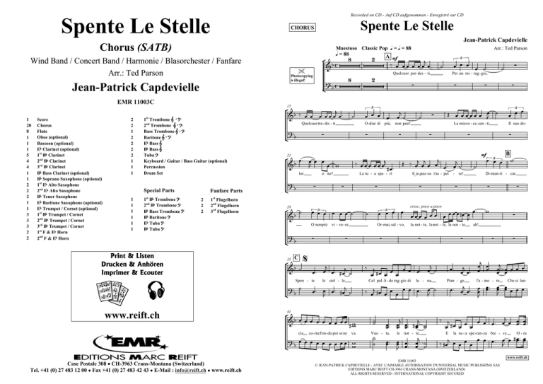 Recorded on CD - Auf CD aufgenommen - Enregistré sur CD Spente Le Stelle Spente Le Stelle CHORUS Jean-Patrick Capdevielle Chorus (SATB) Wind Band / Concert Band / Harmonie / Blasorchester / Fanfare Arr.: Ted Parson Maestoso Classic Pop q = q = 88 q = 88 A | Photocopying is illegal! Jean-Patrick Capdevielle EMR 11003C 1 20 8 1 1 1 5 4 4 1 1 2 2 2 1 1 3 3 3 2 2 Score Chorus Flute Oboe (optional) Bassoon (optional) E Clarinet (optional) 1st B Clarinet 2nd B Clarinet 3rd B Clarinet B Bass Clarinet (optional) B Soprano Saxophone (optional) 1st E Alto Saxophone 2nd E Alto Saxophone B Tenor Saxophone E Baritone Saxophone (optional) E Trumpet / Cornet (optional) 1st B Trumpet / Cornet 2nd B Trumpet / Cornet 3rd B Trumpet / Cornet 1st F & E Horn 2nd F & E Horn 2 2 1 2 2 2 2 1 1 1 1st Trombone + 2nd Trombone + Bass Trombone + Baritone + E Bass B Bass Tuba Keyboard / Guitar / Bass Guitar (optional) Percussion Drum Set 1st B Trombone 2nd B Trombone B Bass Trombone B Baritone E Tuba B Tuba 15 Special Parts 1 1 1 1 1 1 Fanfare Parts 2 2 2 1st Flugelhorn 2nd Flugelhorn 3rd Flugelhorn Print & Listen Drucken & Anhören Imprimer & Ecouter Quelcuor tra - dis - ti o no? O non più C $ Spen - te www.reift.ch le stel - le 41 cia E_io,paz -za t'as - pet co - me l'on-da poi se ne va. - to! mf Col pal - li - do rag -gio di lu - na, Vuo - ta, le not - te, 3 B Di-men-ti - car, la not - te, la not - te, la not - te, Il suo do - 3 La miavo - ce, sen - ti cresc. poco a poco Or - mai, sal - vo, 3 vi - ve - re, non puó! 3 28 Per un mi - rag - gio, La tu - a spa - rì 35 O -diar di più, 21 3 Quelcuor per - des - ti 3 lor, mf Arr.: Ted Parson ah! Pian - ge l'a - mo - re Che si lan- E la su - a spe - ran -za bre - ve. O - ra www.reift.ch Case Postale 308 • CH-3963 Crans-Montana (Switzerland) Tel. +41 (0) 27 483 12 00 • Fax +41 (0) 27 483 42 43 • E-Mail : [email protected] • www.reift.ch EMR 11003 © JEAN-PATRICK CAPDEVIELLE - AVEC L'AIMABLE AUTORISATION D'UNIVERSAL MUSIC PUBLISHING SAS EDITIONS MARC REIFT CH-3963 CRANS-MONTANA (SWITZERLAND) ALL RIGHTS RESERVED - INTERNATIONAL COPYRIGHT SECURED 4 Recorded on CD - Auf CD aufgenommen - Enregistré sur CD Spente Le Stelle | Photocopying is illegal! Chorus Flute Oboe Bassoon 1st Bb Clarinet 2nd Bb Clarinet 3rd Bb Clarinet 2nd Eb Alto Saxophone Bb Tenor Saxophone 5 6 1st Bb Trumpet / Cornet f 2nd Bb Trumpet / Cornet f 3rd Bb Trumpet / Cornet f 1st F Horn f 2nd F Horn f 1st Trombone f 2nd Trombone f Bass Trombone f Baritone f Tuba in C Bass Guitar (optional) Drum Set f f f f f f f f Dm sus f p f A suspended Cymbal w/ Mallets Chorus f mf mf f mf f mf f mf f mf mf mf mf f f f f Percussion f Eb Baritone Saxophone Keyboard / Guitar (optional) 1st Eb Alto Saxophone Bb Bass Clarinet 4 8 3 Arr.: Ted Parson 7 2 Maestoso q = 88 Dm 9 Jean-Patrick Capdevielle p f B.Cl. Hn.2 B.Tbn. mf Bar. mf Keyb./ Gtr. EMR 11003C © JEAN-PATRICK CAPDEVIELLE - AVEC L'AIMABLE AUTORISATION D'UNIVERSAL MUSIC PUBLISHING SAS EDITIONS MARC REIFT CH-3963 CRANS-MONTANA (SWITZERLAND) ALL RIGHTS RESERVED - INTERNATIONAL COPYRIGHT SECURED fill ad lib. mf mp Dm mp closed Hi-Hat 3 3 3 mp mp mp mp Dm mp www.reift.ch A mp mp mp mp 3 mf Perc. Dr. 3 14 mi - rag - gio, Tuba A B.Gtr. Tbn.1 mf Hn.1 Tbn.2 mf mf mp mf mf Per un mf Tpt./ Cnt.3 mf Tpt./ Cnt.2 3 Tpt./ Cnt.1 mf mf 13 Quel cuor per - des - ti 12 mf A.Sax.2 mf 11 A A.Sax.1 Cl.3 Cl.2 B.Sax. mf Cl.1 Bsn. T.Sax. Ob. mf mf Gm Fl. 10 Classic Pop q = q = 88 A“4 A A A“4 A www.reift.ch EMR 11003C 5 15 Chorus 16 Fl. Ob. Bsn. T.Sax. B.Sax. Tpt./ Cnt.1 3 3 3 più, non puó! Tpt./ Cnt.3 Hn.1 Tbn.1 B.Tbn. B.Gtr. Tuba A A“4 A Perc. Dr. p p Dm 3 Il suo do 3 3 3 3 Cl.2 Cl.3 T.Sax. B.Sax. o no? Tpt./ Cnt.3 Hn.1 3 mf mf 3 mf 3 mf mf mf mf mf 3 mf 3 mf 3 mf mf mf mf A A“4 A A A“4 A A A“4 A A A“4 A Dm Perc. Dr. 3 3 3 mf 3 mf mf mf mf car, B.Gtr. Keyb./ Gtr. 27 - 3 3 3 Di - men - ti mf B mf www.reift.ch EMR 11003C to! Tuba - Tpt./ Cnt.2 B.Tbn. t'as - pet E_io, paz - za Tbn.2 La tu - a spa - rì Bar. 26 25 Tbn.1 24 Hn.2 23 Tpt./ Cnt.1 lor, A.Sax.1 B.Cl. Cl.1 A.Sax.2 Ob. 22 Bsn. Fl. 3 Chorus 21 A A“4 p A Tbn.2 p p p Keyb./ Gtr. 6 20 La mia vo - ce, sen - ti 19 Bar. 18 Tpt./ Cnt.2 Hn.2 3 O - diar di 3 Cl.1 Cl.2 Cl.3 B.Cl. A.Sax.1 A.Sax.2 3 Quel cuor tra - dis - ti 17 3 Gm7 www.reift.ch EMR 11003C 7 28 30 31 3 O non più 3 vi - ve re, 3 3 3 Cl.1 Ob. Bsn. Cl.2 Cl.3 B.Cl. A.Sax.1 3 3 3 T.Sax. Tbn.1 B.Tbn. 3 3 3 cresc. poco a poco 3 cresc. poco a poco 3 3 cresc. poco a poco cresc. poco a poco cresc. poco a poco cresc. poco a poco cresc. poco a poco cresc. poco a poco cresc. poco a poco cresc. poco a poco 3 3 3 cresc. poco a poco cresc. poco a poco cresc. poco a poco Dm 3 Keyb./ Gtr. Perc. 3 3 3 3 Dm/A A cresc. poco a poco B.Cl. cresc. poco a poco A A“4 Tpt./ Cnt.1 Tpt./ Cnt.2 mf mf Hn.1 Tbn.1 Tbn.2 37 mf f f f mf mf 38 f mf f B.Gtr. fill ad lib. cresc. poco a poco f Dm f Cabasa or Shaker Perc. f Keyb./ Gtr. Dr. 39 40 - na, f f Pian - ge l'a - mo - re Che si lan - f A A/D f f f f f f Dm f f A “4 Gm f www.reift.ch EMR 11003C lu Col pal - li - do rag - gio di Tuba le f Bar. f B.Tbn. - mf Tpt./ Cnt.3 Hn.2 mf mf A mf cresc. poco a poco Cl.3 stel mf B.Sax. T.Sax. Cl.2 3 3 3 36 mf mf A.Sax.2 le Cl.1 te mf A.Sax.1 - Bsn. Ob. Spen Fl. Chorus 3 3 3 cresc. poco a poco 3 3 3 cresc. poco a poco 3 3 3 3 B.Gtr. Dr. cresc. poco a poco Bar. Tuba 3 Tbn.2 ah! 35 cresc. poco a poco Hn.2 la not - te, la not - te, la not - te, Tpt./ Cnt.3 Hn.1 3 3 cresc. poco a poco $ 8 34 Tpt./ Cnt.2 33 3 3 Tpt./ Cnt.1 B.Sax. A.Sax.2 Or - mai, sal - vo, 3 Fl. 32 C Chorus 29 www.reift.ch EMR 11003C 9 41 Chorus 42 cia co - me l'on - da poi se ne va. Vuo Fl. Ob. Cl.1 Bsn. Cl.2 Cl.3 B.Cl. A.Sax.1 A.Sax.2 T.Sax. B.Sax. Tpt./ Cnt.1 Tpt./ Cnt.2 Tpt./ Cnt.3 Hn.2 Hn.1 Tbn.1 Tbn.2 mf Perc. mf mf mf mf mf fill ad lib. A A “4 Arrangements for Chorus (SATB) and Concert Band / Brass Band These arrangements are conceived primarily as band works, with optional additional chorus. The band parts are self-sufficient, 
