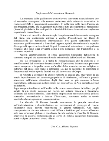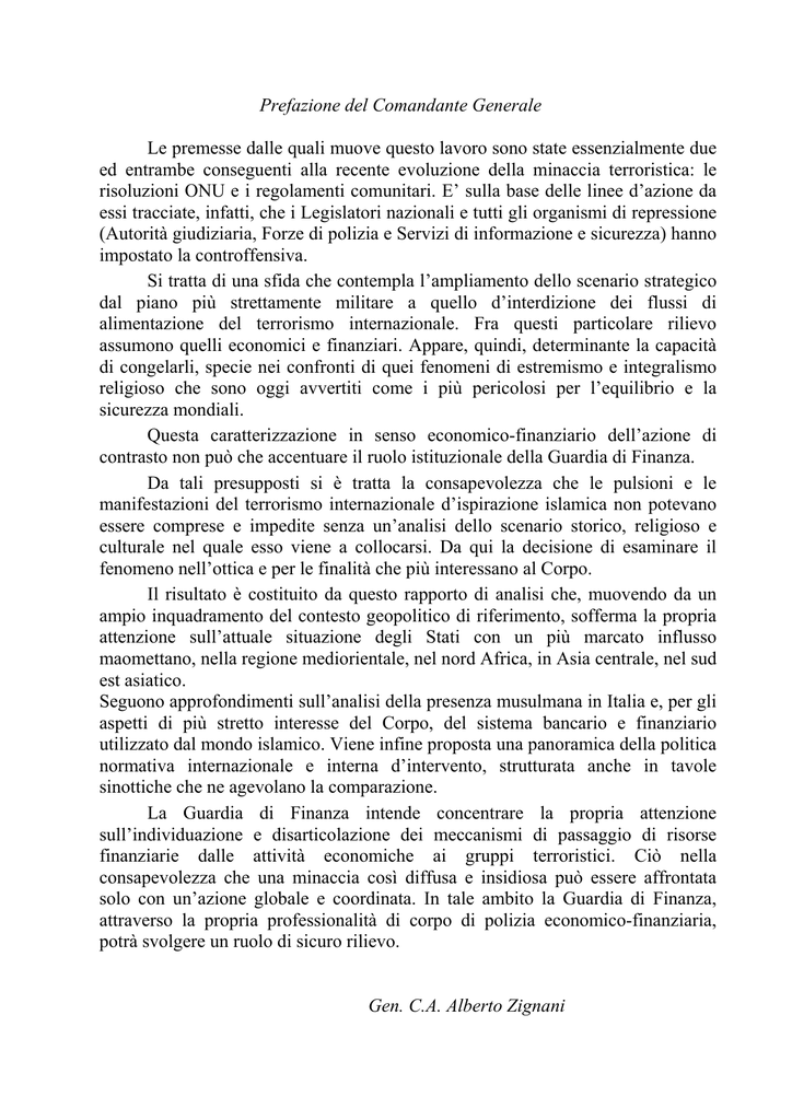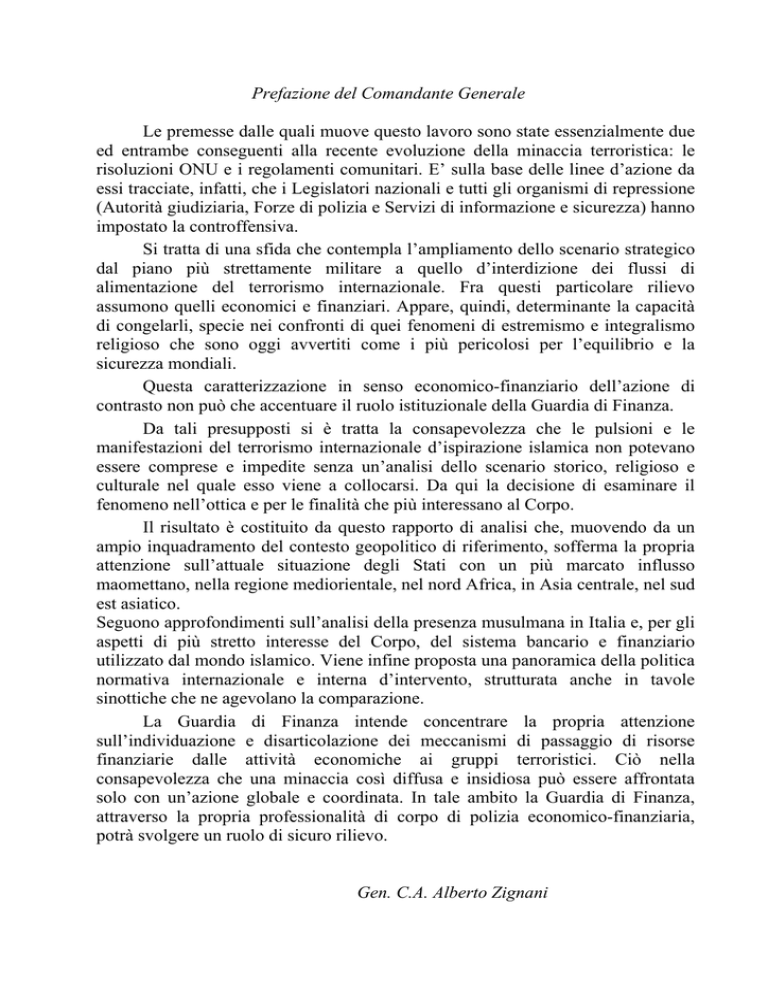 Prefazione del Comandante Generale Le premesse dalle quali muove questo lavoro sono state essenzialmente due ed entrambe conseguenti alla recente evoluzione della minaccia terroristica: le risoluzioni ONU e i regolamenti comunitari. E’ sulla base delle linee d’azione da essi tracciate, infatti, che i Legislatori nazionali e tutti gli organismi di repressione (Autorità giudiziaria, Forze di polizia e Servizi di informazione e sicurezza) hanno impostato la controffensiva. Si tratta di una sfida che contempla l’ampliamento dello scenario strategico dal piano più strettamente militare a quello d’interdizione dei flussi di alimentazione del terrorismo internazionale. Fra questi particolare rilievo assumono quelli economici e finanziari. Appare, quindi, determinante la capacità di congelarli, specie nei confronti di quei fenomeni di estremismo e integralismo religioso che sono oggi avvertiti come i più pericolosi per l’equilibrio e la sicurezza mondiali. Questa caratterizzazione in senso economico-finanziario dell’azione di contrasto non può che accentuare il ruolo istituzionale della Guardia di Finanza. Da tali presupposti si è tratta la consapevolezza che le pulsioni e le manifestazioni del terrorismo internazionale d’ispirazione islamica non potevano essere comprese e impedite senza un’analisi dello scenario storico, religioso e culturale nel quale esso viene a collocarsi. Da qui la decisione di esaminare il fenomeno nell’ottica e per le finalità che più interessano al Corpo. Il risultato è costituito da questo rapporto di analisi che, muovendo da un ampio inquadramento del contesto geopolitico di riferimento, sofferma la propria attenzione sull’attuale situazione degli Stati con un più marcato influsso maomettano, nella regione mediorientale, nel nord Africa, in Asia centrale, nel sud est asiatico. Seguono approfondimenti sull’analisi della presenza musulmana in Italia e, per gli aspetti di più stretto interesse del Corpo, del sistema bancario e finanziario utilizzato dal mondo islamico. Viene infine proposta una panoramica della politica normativa internazionale e interna d’intervento, strutturata anche in tavole sinottiche che ne agevolano la comparazione. La Guardia di Finanza intende concentrare la propria attenzione sull’individuazione e disarticolazione dei meccanismi di passaggio di risorse finanziarie dalle attività economiche ai gruppi terroristici. Ciò nella consapevolezza che una minaccia così diffusa e insidiosa può essere affrontata solo con un’azione globale e coordinata. In tale ambito la Guardia di Finanza, attraverso la propria professionalità di corpo di polizia economico-finanziaria, potrà svolgere un ruolo di sicuro rilievo. Gen. C.A. Alberto Zignani Premessa Questo rapporto di analisi strategica di intelligence ha essenzialmente due scopi: creare nella Guardia di Finanza una conoscenza generale del terrorismo internazionale di matrice islamica, tale da inserire in un adeguato contesto di base il contrasto al finanziamento di questo fenomeno, missione che il Corpo vuole sempre più perseguire e sviluppare, in linea con le sue precipue competenze; individuare le conseguenti linee strategiche d’intervento. E’ essenziale precisare preliminarmente che le informazioni utilizzate in questo contesto sono esclusivamente provenienti da fonti aperte. Si è ritenuto infatti che il suddetto panorama informativo, generato da numerosi soggetti da tempo attivi nello specifico settore, fosse già abbastanza ampio e variegato, in relazione ai predetti obiettivi. Si è, quindi, proceduto ad una vasta raccolta, selezione, esame e integrazione delle informazioni, per ottenere un prodotto organico che delinea, e in alcuni casi distilla, le caratteristiche generali dello scenario di riferimento da molteplici punti di vista, quali quello storico, culturale, religioso, geo-politico, economico-finanziario, criminale, normativo. E’ infatti questa olografica conoscenza - da cui possono emergere fattori chiave, elementi strutturali del fenomeno – che potrà condurre ad una corretta impostazione di lungo periodo della complessiva attività info-operativa. Il rapporto è aggiornato a settembre 2002, per gli avvenimenti d’attualità, e a novembre 2002, per i provvedimenti normativi di maggior rilievo. Naturalmente, data la natura dell’informazione elaborata, ossia intelligence proveniente da fonti aperte, va da sé che la maggior parte delle affermazioni necessita dei conseguenti riscontri investigativi. In ogni caso, il documento non si presta ad un’ampia diffusione, ma deve essere mantenuto all’interno di una ristretta cerchia di “addetti ai lavori”. Posto quanto precede, per approfondimenti, scambi di esperienze o degli elementi informativi caratterizzati da una maggior riservatezza, è necessario far riferimento al Comando Generale della Guardia di Finanza – II Reparto. Sintesi dei contenuti I primi capitoli sono dedicati al background storico-culturale dell’ Islam per cogliere le differenze essenziali tra quella mentalità e la nostra ed acquisire, quindi, le giuste chiavi di lettura per interpretare i fenomeni che si sviluppano nel mondo musulmano. L’obiettivo finale, infatti, non e’ solo quello di ricostruire, per esempio, i flussi di finanziamento del terrorismo internazionale, quanto piuttosto quello di inserire queste ricostruzioni in un contesto non solo logicamente coerente, ma anche culturalmente e storicamente piu’ nitido. Il capitolo sui profili culturali/religiosi è dedicato alle origini dell’Islam (Arabia centrale del VII secolo d.c.), alla suddivisione ed alle differenze tra sciiti e sunniti - nonché tra le diverse scuole che si muovono in quest’ultimo ambito -, alle fonti (Corano, Sunna, Shari’a), ai principali contenuti (i cosiddetti cinque pilastri) e significati (ad esempio, quelli di Umma, imam) della religione musulmana. Dall’analisi del contesto culturale e religioso islamico, emerge con imme