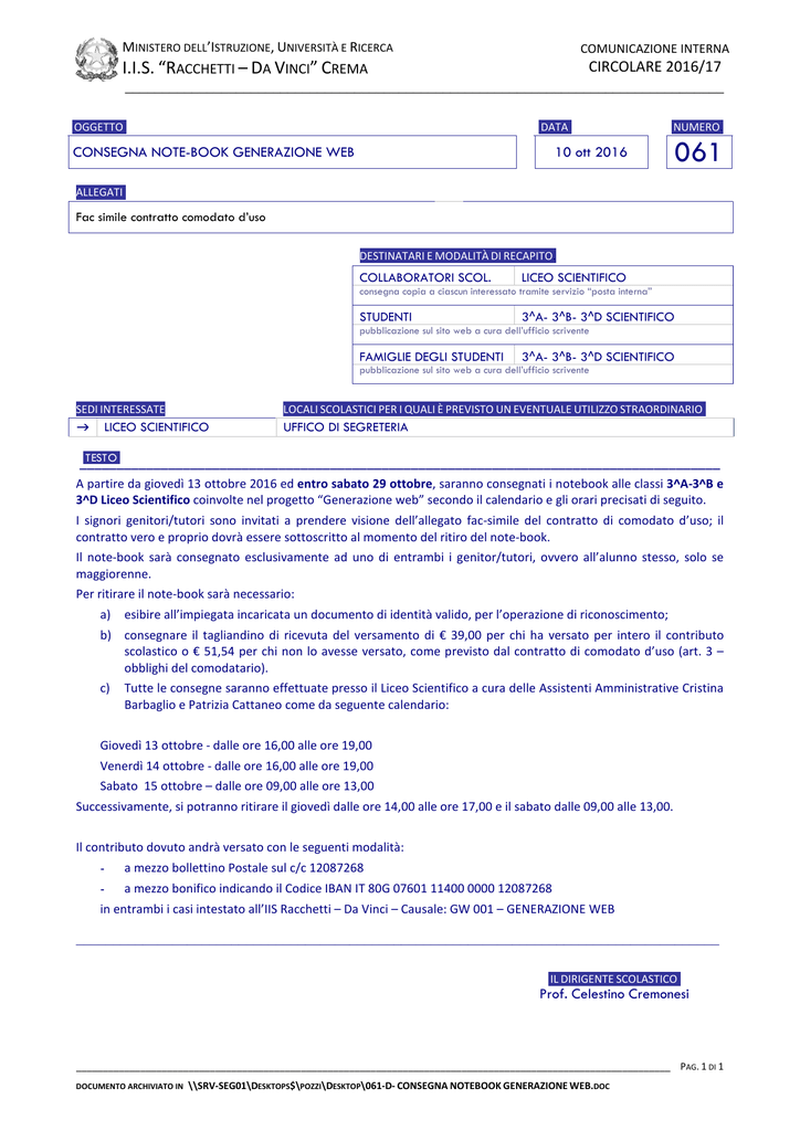 MINISTERO DELL’ISTRUZIONE, UNIVERSITÀ E RICERCA COMUNICAZIONE INTERNA CIRCOLARE 2016/17 I.I.S. “RACCHETTI – DA VINCI” CREMA _________________________________________________________________________________ OGGETTO. DATA. CONSEGNA NOTE-BOOK GENERAZIONE WEB NUMERO. 10 ott 2016 061 ALLEGATI. Fac simile contratto comodato d’uso DESTINATARI E MODALITÀ DI RECAPITO. COLLABORATORI SCOL. LICEO SCIENTIFICO consegna copia a ciascun interessato tramite servizio “posta interna” STUDENTI 3^A- 3^B- 3^D SCIENTIFICO pubblicazione sul sito web a cura dell’ufficio scrivente FAMIGLIE DEGLI STUDENTI 3^A- 3^B- 3^D SCIENTIFICO pubblicazione sul sito web a cura dell’ufficio scrivente SEDI INTERESSATE LOCALI SCOLASTICI PER I QUALI È PREVISTO UN EVENTUALE UTILIZZO STRAORDINARIO. LICEO SCIENTIFICO UFFICO DI SEGRETERIA TESTO. _______________________________________________________________________________________ A partire da giovedì 13 ottobre 2016 ed entro sabato 29 ottobre, saranno consegnati i notebook alle classi 3^A-3^B e 3^D Liceo Scientifico coinvolte nel progetto “Generazione web” secondo il calendario e gli orari precisati di seguito. I signori genitori/tutori sono invitati a prendere visione dell’allegato fac-simile del contratto di comodato d’uso; il contratto vero e proprio dovrà essere sottoscritto al momento del ritiro del note-book. Il note-book sarà consegnato esclusivamente ad uno di entrambi i genitor/tutori, ovvero all’alunno stesso, solo se maggiorenne. Per ritirare il note-book sarà necessario: a) esibire all’impiegata incaricata un documento di identità valido, per l’operazione di riconoscimento; b) consegnare il tagliandino di ricevuta del versamento di € 39,00 per chi ha versato per intero il contributo scolastico o € 51,54 per chi non lo avesse versato, come previsto dal contratto di comodato d’uso (art. 3 – obblighi del comodatario). c) Tutte le consegne saranno effettuate presso il Liceo Scientifico a cura delle Assistenti Amministrative Cristina Barbaglio e Patrizia Cattaneo come da seguente calendario: Giovedì 13 ottobre - dalle ore 16,00 alle ore 19,00 Venerdì 14 ottobre - dalle ore 16,00 alle ore 19,00 Sabato 15 ottobre – dalle ore 09,00 alle ore 13,00 Successivamente, si potranno ritirare il giovedì dalle ore 14,00 alle ore 17,00 e il sabato dalle 09,00 alle 13,00. Il contributo dovuto andrà versato con le seguenti modalità: - a mezzo bollettino Postale sul c/c 12087268 - a mezzo bonifico indicando il Codice IBAN IT 80G 07601 11400 0000 12087268 in entrambi i casi intestato all’IIS Racchetti – Da Vinci – Causale: GW 001 – GENERAZIONE WEB _______________________________________________________________________________________ IL DIRIGENTE SCOLASTICO. Prof. Celestino Cremonesi _______________________________________________________________________________________________________________ PAG. 1 DI 1 DOCUMENTO ARCHIVIATO IN \\SRV-SEG01\DESKTOPS$\POZZI\DESKTOP\061-D- CONSEGNA NOTEBOOK GENERAZIONE WEB.DOC