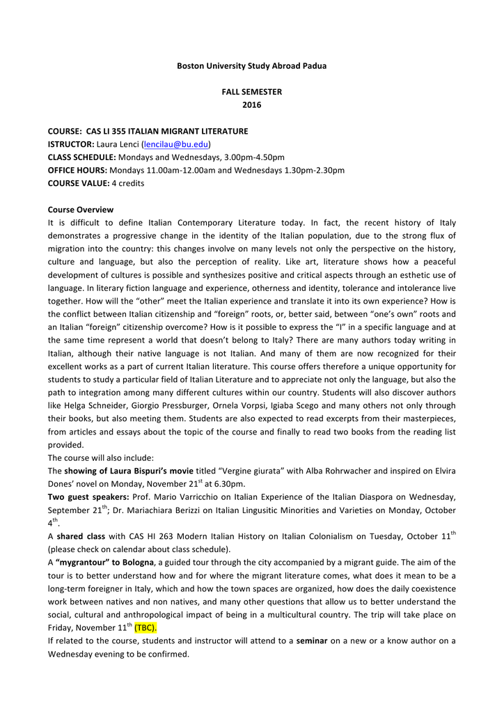 BostonUniversityStudyAbroadPadua FALLSEMESTER 2016 COURSE:CASLI355ITALIANMIGRANTLITERATURE ISTRUCTOR:LauraLenci([email protected]) CLASSSCHEDULE:MondaysandWednesdays,3.00pm-4.50pm OFFICEHOURS:Mondays11.00am-12.00amandWednesdays1.30pm-2.30pm COURSEVALUE:4credits CourseOverview It is difficult to define Italian Contemporary Literature today. In fact, the recent history of Italy demonstrates a progressive change in the identity of the Italian population, due to the strong flux of migration into the country: this changes involve on many levels not only the perspective on the history, culture and language, but also the perception of reality. Like art, literature shows how a peaceful developmentofculturesispossibleandsynthesizespositiveandcriticalaspectsthroughanestheticuseof language.Inliteraryfictionlanguageandexperience,othernessandidentity,toleranceandintolerancelive together.Howwillthe“other”meettheItalianexperienceandtranslateitintoitsownexperience?Howis theconflictbetweenItaliancitizenshipand“foreign”roots,or,bettersaid,between“one’sown”rootsand anItalian“foreign”citizenshipovercome?Howisitpossibletoexpressthe“I”inaspecificlanguageandat the same time represent a world that doesn’t belong to Italy? There are many authors today writing in Italian, although their native language is not Italian. And many of them are now recognized for their excellentworksasapartofcurrentItalianliterature.Thiscourseoffersthereforeauniqueopportunityfor studentstostudyaparticularfieldofItalianLiteratureandtoappreciatenotonlythelanguage,butalsothe pathtointegrationamongmanydifferentcultureswithinourcountry.Studentswillalsodiscoverauthors like Helga Schneider, Giorgio Pressburger, Ornela Vorpsi, Igiaba Scego and many others not only through theirbooks,butalsomeetingthem.Studentsarealsoexpectedtoreadexcerptsfromtheirmasterpieces, fromarticlesandessaysaboutthetopicofthecourseandfinallytoreadtwobooksfromthereadinglist provided. Thecoursewillalsoinclude: TheshowingofLauraBispuri’smovietitled“Verginegiurata”withAlbaRohrwacherandinspiredonElvira Dones’novelonMonday,November21stat6.30pm. Two guest speakers: Prof. Mario Varricchio on Italian Experience of the Italian Diaspora on Wednesday, September21th;Dr.MariachiaraBerizzionItalianLingusiticMinoritiesandVarietiesonMonday,October 4th. A shared class with CAS HI 263 Modern Italian History on Italian Colonialism on Tuesday, October 11th (pleasecheckoncalendaraboutclassschedule). A“mygrantour”toBologna,aguidedtourthroughthecityaccompaniedbyamigrantguide.Theaimofthe touristobetterunderstandhowandforwherethemigrantliteraturecomes,whatdoesitmeantobea long-termforeignerinItaly,whichandhowthetownspacesareorganized,howdoesthedailycoexistence workbetweennativesandnonnatives,andmanyotherquestionsthatallowustobetterunderstandthe social, cultural and anthropological impact of being in a multicultural country. The trip will take place on Friday,November11th(TBC). Ifrelatedtothecourse,studentsandinstructorwillattendtoaseminaronaneworaknowauthorona Wednesdayeveningtobeconfirmed. Basedonclassmeetings(2110’-appointmentsperweek),readings(textsandcriticism),assignments(23pagesresponsepaper;2oralpresentations;finalpaper)andpreparationforclassdiscussions,studentsare expectedtoengagethemselvesforaminimumof8-10hoursperweekinordertoperforminthiscourse. ThisisparticularlyrelevantduetothefactthatthisisacoursetaughtinItalian,forcredits,ata300level. Theinstructorencouragestudentstogototheofficehoursandtoaskforhelpatanytime,inparticularat thebeginningandattheendofthecourse. LEARNINGOUTCOMESoftheItalianandEuropeanStudiesProgram 1.DemonstrateincreasedproficiencyinItalianlanguagefromelementarytolow-intermediateandfrom intermediatetoadvancedlevel. 2.DemonstrateknowledgeofItalianculturewithrespecttothreeofthefollowingareas:history,politics, economics,religion,literature,filmandthearts. 3.Developanawarenessofculturaldifferenceandanunderstandingofculture’sroleinshapingbeliefsand practices. 4.Developnewperspectivesonone’sowncultureandanabilitytothinkcriticallyaboutone’sownvalues andbeliefs. Classmaterial(alsoonBlackboard) - Course pack, including critical essays and articles – all stuff is also available on Blackboard as digital supportforyourstudyoutsideclass. -Oneentirebookstudiedduringthecourse,chosenbythestudentforhis/herfinalpaper(mandatory). -Interviews,videosanddocumentslistedbelow. Worksreadanddiscussedinclass AA.VV.,Pecorenere,Roma-Bari,Laterza,2005. CarmineAbate,Ilmurodeimuri,Milano,Mondadori,2006. CarmineAbate,Vivereperaddizione,Milano,Mondadori,2010. HelenaJaneczek,Cibo,Milano,Mondadori,2002. HelenaJaneczek,Lezioniditenebra,Milano,Guanda,1997. HelenaJaneczek,LerondinidiMontecassino,Milano,Guanda,2010. GëzimHajadri,Stigmate,Lecce,Besa,2007. KossiKomla-Ebri,Imbrazzismi.Quotidianiimbarazziinbiancoenero,Milano,Edizionidell’Arco,2002. AmaraLakhous,ScontrodiciviltàperunascensoreaPiazzaVittorio,Roma,Edizionie/o,2006. AmaraLakhous,Divorzioall’islamicaaVialeMarconi,Roma,Edizionie/o2010. AzraNuhefendić,Lestellechestannogiù.CronachedallaJugoslaviaedallaBosniaErzegovina,Cesena,ed.Spartaco, 2011. JarmilaOckayová,Verràlavitaeavràituoiocchi,Milano,BaldinieCastoldi,1995. GiorgioPressburger,Storiedell’OttavoDistretto,Milano,Marietti,1986. GiorgioPressburger,L’orologiodiMonaco,Torino,Einaudi,2003. OrnelaVorpsi,Ilpaesedovenonsimuoremai,Torino,Einaudi,2005. OrnelaVorpsi,Lamanochenonmordi,Torino,Einaudi,2007. IgiabaScego,Lamiacasaèdovesono,Milano,Rizzoli,2010. HelgaSchneider,IlrogodiBerlino,Milano,Adelphi,1995. Otherquotatedtextsorrelevantforthecourse CarmineAbate,LamotodiScanderbeg,Milano,Mondadori,2008. 1 CarmineAbate,LatrilogiadiHora,Milano,Mondadori,(1991,1999e2006) ,2014 OrnelaVorpsi,BeveteCacaovanHouten,Torino,Einaudi,2010. OrnelaVorpsi,Fuorimondo,Torino,Einaudi,2012. OrnelaVorspi,Vetrirosa,Roma,Nottetempo,2006. ElviraDones,Verginegiurata,Milano,Feltrinelli,2007. AnildaIbrahimi,Rossocomeunasposa,Torino,Einaudi,2008. Videos www.scrittoriperunanno.ra