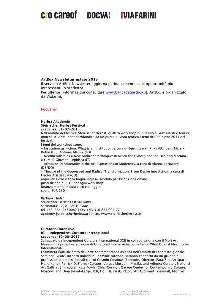 ArtBox Newsletter estate 2013 Il servizio ArtBox Newsletter aggiorna periodicamente sulle opportunità più interessanti in scadenza. Per ulteriori informazioni consultare www.bancadatiartbox.it. ArtBox è organizzato da Viafarini. Focus on Herbst Akademie Steirischer Herbst Festival scadenza: 31-07-2013 Nell’ambito del festival Steirischer Herbst, quattro workshop riuniranno a Graz artisti e teorici, nonché studenti per approfondire da un punto di vista teorico i temi dell’edizione 2013 del festival. I temi del workshop sono: - Institution as Fiction: What is an Institution, a cura di Beirut (Sarah Rifky (EG), Jens MaierRothe (DE), Antonia Alampi (IT)) - Neoliberalism as a New Anthropotechnique: Between the Cyborg and the Desiring Machine, a cura di Giovanni Leghissa (IT) - Afropean Decoloniality in the Art Plantations of Modernity, a cura di Alanna Lockward (DE/DO) - Theatre of the Oppressed and Radical Transformation: From Desire into Action, a cura di Hector Aristizábal (CO) requisiti: Conoscenza lingua inglese. Modulo per l’iscrizione online. posti disponibili: 10 per ogni workshop finanziamento: inclusi vitto e alloggio costo: EUR 130 Barbara Thaler Steirischer Herbst Festival GmbH Sackstraße 17, A - 8010 Graz tel +43-664-2450087 | fax +43 316 823 007 77 [email protected] | http://www.steirischerherbst.at Curatorial Intensive ICI - Independent Curators International scadenza: 10-08-2012 Sviluppato da Independent Curators International (ICI) in collaborazione con il Mori Art Museum, la prossima edizione di Curatorial Intensive ha come tema: What Does it Mean to be International? Esaminerà l’attuale stato dell’arte contemporanea asiatica nell’ambito del contesto globale. Seminari, visite, incontri individuali e tavole rotonde, saranno condotto da un gruppo di professionisti internazionali tra cui Cosmin Costinas (Executive Director, Para/Site Art Space, Hong Kong), Patrick D. Flores (Curator, Vargas Museum, Manila, and Adjunct Curator, National Art Gallery, Singapore), Kate Fowle (Chief Curator, Garage Center for Contemporary Culture, Moscow, and Director-at-Large, ICI), Hou Hanru (Curator, 5th Auckland Triennial), Michiyo Hayashi (Professor, Faculty of Liberal Arts, Sophia University, Tokyo), Mami Kataoka (Chief Curator, Mori Art Museum, Tokyo), and Dr. Sook-Kyung Lee (Research Curator, Tate Research Centre: Asia-Pacific, London), tra gli altri. requisiti: Curatori con almeno tre anni di esperienza professionale. Iscrizione online. posti disponibili: 12-14 durata: 1 settimana finanziamento: possibili borse di studio costo: USD 1900,00, spese di viaggio e alloggio. Education & Public Programs Manager Chelsea Haines ICI - Independent Curators International 779 Broadway Suite 205, USA - New York NY 10003 tel +1-212-2548200 | fax +1-212-4774781 [email protected] | http://www.curatorsintl.org Skaftfell & Dieter Roth Academy Skaftfell - Center for Visual Art scadenza: 16-09-2013 Durante il workshop della durata di due settimane, viene data la possibilità di vivere e lavorare in un ambiente molto diverso da quello accademico tradizionale. Il programma si basa su un intenso lavoro che comprende: discussioni di gruppo, lezioni e progetti indipendenti con uno dei professori della Dieter Roth Academy, oltre a due escursioni naturalistiche. Il focus del corso è sia concettuale sia empirico, sia globale sia locale. Il lavoro finale verrà presentato tramite una mostra, un evento di discussione, performance e qualsiasi altro metodo risulti appropriato per il gruppo. requisiti: Il corso si tiene in lingua inglese. Iscrizione online possibile fino al 16 settembre. posti disponibili: 12 durata: 2 settimane a ottobre costo: ISK 250.000 (circa EUR 1650) + viaggio, vitto e alloggio e materiali a carico dei partecipanti Thorunn Eymundardóttir Skaftfell - Center for Visual Art Austurvegur 42, IS - 710 Seydisfjordur [email protected] | http://skaftfell.is/en/ Residenze Artists Residencies Delfina Foundation periodica Delfina Foundation offre opportunità per artisti, scrittori, curatori per sviluppare il proprio lavoro, esplorare le varie connessioni tra le diverse parti del mondo e costruire collaborazioni con colleghi, comunità e istituzioni situate nel Regno Unito e nell’area settentrionale e orientale dell’Africa. requisiti: Su invito, su segnalazione di istituzioni, open call. posti disponibili: 14 all’anno Delfina Foundation 29 Catherine Place, Victoria, UK - London SW1E 6DY tel +44-(0)20-72335344 | fax [email protected] | http://www.delfinafoundation.com Residency at Nes Artist Residency NES Artist Residency ammissione continua Il programma di residenza nella cittadina islandese di Skagaströnd ha avuto inizio nel 2008. Offre agli artisti un alloggio in centro città e uno studio, a spese degli artisti sono le spese per il viaggio e per il vitto. requisiti: Application online, in seguito inviare: curriculum vitae; breve descrizione del progetto che si intende realizzare durante il periodo di residenza (massimo 500 parole); quattro immagini del lavoro in formato .jpg con titolo e nome dell'artista. posti disponibili: 15-20 all'anno durata: Da 1 a 6 mesi. finanziamento: Uno stipendio parziale al mese all'artista che vorrà interagire con la comunità. Lo stipendio dovrà essere richiesto tra il 15 marzo e il 1 agosto 2010. costo: EUR 500,00-900,00 al mese NES Artist Residency Fjörubraut 8, IS - 545 Skagaströnd [email protected] | http://www.neslist.is Curatorial Studies Residency Node Center for Curatorial Studies scadenza: 03-08-2013 Il programma concepisce la curatela come una pratica espositiva, permettendo la sperimentazione diretta all’interno dello spazio espositivo. Inoltre, il programma è supportato da attività come workshop, seminari, incontri con agenti culturali, mostre. Ai residenti viene richiesto di assumere un ruolo attivo nell’organizzazione del programma, tramite lo sviluppo di una ricerca teorico-pratica durante la residenza. requisiti: Background a