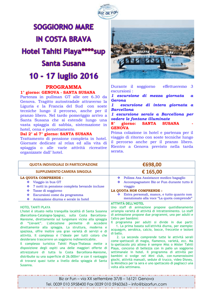 PROGRAMMA 1° giorno: GENOVA - SANTA SUSANA Partenza in pullman GT alle ore 6.30 da Genova. Tragitto autostradale attraverso la Liguria e la Francia del Sud con soste tecniche lungo il percorso, anche per il pranzo libero. Nel tardo pomeriggio arrivo a Santa Susana che si estende lungo una vasta spiaggia di sabbia, sistemazione in hotel, cena e pernottamento. Dal 2° al 7° giorno: SANTA SUSANA Trattamento di pensione completa in hotel. Giornate dedicate al relax ed alla vita di spiaggia o alle varie attività ricreative organizzate dall’ hotel. Durante il soggiorno effettueremo 3 escursioni : 1 escursione di mezza giornata a Gerona 1 escursione di intera giornata a Barcellona 1 escursione serale a Barcellona per vedere le fontane illuminate 8° giorno: SANTA SUSANA GENOVA Prima colazione in hotel e partenza per il viaggio di ritorno con soste tecniche lungo il percorso anche per il pranzo libero. Rientro a Genova previsto nella tarda serata. €698,00 € 165,00 QUOTA INDIVIDUALE DI PARTECIPAZIONE SUPPLEMENTO CAMERA SINGOLA LA QUOTA COMPRENDE : Viaggio in bus GT 7 notti in pensione completa bevande incluse Tasse di soggiorno Escursioni come da programma Animazione diurna e serale in hotel Polizza Axa Assistance medico bagaglio Accompagnatore Biz or Fun durante tutto il viaggio LA QUOTA NON COMPRENDE : Extra personali, mance, e tutto quanto non menzionato alla voce “La quota comprende” HOTEL TAHITI PLAYA L'hotel è situato nella tranquilla località di Santa Susanna (Barcellona-Catalogna-Spagna), sulla Costa BarcellonaMaresme, direttamente sul lungomare vicino alla spiaggia di “Llevant”. L'ubicazione permette di accedere direttamente alla spiaggia. La struttura, moderna e spaziosa, offre inoltre una gran varietà di servizi e di attività. Il complesso è l’ideale per tutti coloro che desiderano trascorrere un soggiorno indimenticabile. Il complesso turistico Tahití Playa-Thalassa mette a disposizione degli ospiti una delle maggiori offerte di attrezzature di tutta la Costa Barcellona-Maresme, distribuite su una superficie di 26.000m² e con il vantaggio di trovarsi quasi tutte a livello della spiaggia di Santa Susanna. ATTIVITÀ DELL'HOTEL Uno staff di animazione propone quotidianamente un'ampia varietà di attività di intrattenimento. Lo staff di animazione propone due programmi, uno per adulti e l'altro per bambini: Il programma per adulti si divide in due parti: 1. La prima basata sull'attività diurna, per esempio: acquagym, aerobica, calcio, bocce, freccette e lezioni di ballo. 2. La seconda comprende tutte le attività serali come spettacoli di magia, flamenco, varietà, ecc. Ma lo spettacolo più atteso è sempre Miss o Mister Tahití Playa, concorso di bellezza con in palio un soggiorno settimanale in hotel. Il programma di attività per bambini si svolge nel Mini club, con numerosissimi giochi, attività manuali, sedute di trucco, video Disney, la Minidisco per la sera e uno spettacolo di pagliacci una volta alla settimana. Biz or Fun – via XX settembre 37/8 – 16121 Genova Tel. 0039 010 5958400 Fax 0039 010 5960363 – [email protected]