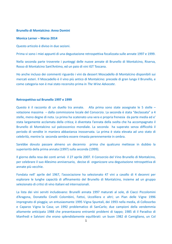 Brunello di Montalcino: Anno Domini Monica Larner – Marzo 2014 Questo articolo è diviso in due sezioni. Prima vi sono i miei appunti di una degustazione retrospettiva focalizzata sulle annate 1997 e 1999. Nella seconda parte troverete i punteggi delle nuove annate di Brunello di Montalcino, Riserva, Rosso di Montalcino Sant’Antimo, ed un paio di vini IGT Toscana. Ho anche incluso dei commenti riguardo i vini da dessert Moscadello di Montalcino disponibili sui mercati esteri. Il Moscadello è il vino più antico di Montalcino: precede di gran lunga il Brunello, e come categoria non è mai stato recensito prima in The Wine Advocate. Retrospettiva sul Brunello 1997 e 1999 Questo è il racconto di un duello tra annate. Alla prima sono state assegnate le 5 stelle – votazione massima – dalla commissione locale del Consorzio. La seconda è stata “declassata” a 4 stelle, meno degne di nota. La prima ha scatenato una vera e propria frenesia da parte media ed e' stata largamente acclamata della critica; è diventata l’annata della svolta che ha accompagnato il Brunello di Montalcino sul palcoscenico mondiale. La seconda ha superato senza difficoltà il periodo di vendite in maniera abbastanza inosservata. La prima è stata elevata ad uno stato di celebrità, mentre la seconda sembra essere rimasta perennemente in ombra. Sarebbe dovuto passare almeno un decennio prima che qualcuno mettesse in dubbio la superiorità della prima annata (1997) sulla seconda (1999). Il giorno della resa dei conti arrivò il 27 aprile 2007. Il Consorzio del Vino Brunello di Montalcino, per celebrare il suo 40esimo anniversario, decise di organizzare una degustazione retrospettiva di annate più vecchie. Fondata nell' aprile del 1967, l’associazione ha selezionato 47 vini a cavallo di 4 decenni per esplorare le lunghe capacità di affinamento del Brunello di Montalcino, insieme ad un gruppo selezionato di critici di vino italiani ed internazionali. La lista dei vini serviti includevano: Brunelli annata 1997 maturati al sole, di Ciacci Piccolomini d’Aragona, Donatella Cinelli Colombini, Fattoi, Uccelliera e altri; un Pian delle Vigne 1996 impregnato di pioggia; un entusiasmante 1995 Vigna Spuntali, dei 1993 nella media, di Collosorbo e Caparzo Vigna la Casa; un 1992 problematico di SanCarlo; due campioni della vendemmia altamente anticipata 1988 che presentavano entrambi problemi di tappo; 1985 di il Paradiso di Manfredi e Salvioni che erano splendidamente equilibrati: un buon 1982 di Camigliano, un Col 1 d’Orcia 1979 evoluto e complesso; una Riserva 1977 di Argiano equilibrata ma matura; vini ossidati dell’annata 1976; un Poggio alle Mura “scarso” del 1975; uno sbalorditivo Biondi Santi del 1970; un Tenute Silvio Nardi del 1968 decisamente arrivato ed un grande 1967 del Costanti. Un vino a sorpresa fu servito a conclusione della degustazione – un Biondi Santi del 1964 che è risultato essere il preferito da tutti. Il Consorzio aveva sicuramente motivi per festeggiare con una degustazione di tale portata. Aveva visto un periodo di sbalorditiva crescita, senza eguali in nessun’atra regione in Italia, e probabilmente nel mondo. In 40 anni, il valore di un singolo ettaro di Brunello è esploso di un incredibile 2,153%, da approssimativamente 15,000 a 350,000 euro, secondo il Consorzio. Nel 1967 il Consorzio di Montalcino contava 37 membri (di cui solamente 12 imbottigliavano il proprio vino). Nel 1997, quel numero e' salito sino a 183 membri (di cui 129 imbottigliatori). Oggi, sono 208 i produttori imbottigliatori di Brunello. Gli effetti, buoni o cattivi, che questo arricchimento improvviso ebbe sulla psicologia di Montalcino furono davvero di grande portata La crescita fu eccezionale e Montalcino fu catapultata fuori dalla povertà e dalla miseria (i produttori della generazione prima della mia se lo ricordano bene) e dentro un' Epoca d’Oro di indicibile prosperità. Una volta un coltivatore mi raccontò che i suoi nonni erano soliti mettere delle i reti sugli alberi per catturare le rondini che migravano. Non avevano nient' altro da mangiare eccetto stufato di ossa di uccelli bollito. Mentre il produttore mi raccontava la storia, la sua sagoma era sovrastata dall’alta gru che stava montando la cantina multimilionaria dietro di lui. Questo slancio di crescita spettacolare fu dovuto, in larga misura, al successo dell’annata 1997 sia a livello commerciale che tra la critica. Quell’annata è la “Anno Domini” dalla quale ha inizio il calendario contemporaneo del Brunello. La retrospettiva del 40esimo anniversario del Consorzio, tuttavia, sarebbe stato un atto di arroganza di proporzioni indimenticabili. Ripensando a quella degustazione, un produttore me l’ha descritta in termini calcistici come un “autogol clamoroso” Da giovane scrittrice di vino, agli inizi della carriera, ho condiviso l’onore di essere presente a quella degustazione. Non lo dimenticherò mai. Eravamo una cinquantina, seduti uno accanto all’altro in maniera ordinata con i nostri calici e le tovagliette di fronte a noi. I campioni che venivano versati presentavano sconcertanti gradazioni di rosso granato, rosso mattone, miele, ambra e castano. Valutammo ciascun vino attentamente, in assoluto silenzio, ansiosamente sperando che qualche barlume di commento intelligente uscisse dalle nostre bocche qualora fossimo stati chiamati in causa nella discussione pubblica che a breve sarebbe seguita. Questa situazione continuò per un tempo abbastanza lungo. Poi, di punto in bianco, una voce burbera interruppe l’insopportabile silenzio: “Sa di cesso” disse, con un pesante accento italiano. 2 Quelle parole fondamentali conferirono un senso collettivo di sollievo. Tutti noi avevamo pensato la stessa cosa in privato, ovviamente. Ciò che seguì fu un dibattito affascinante e vivace sui vini – specialmente sull’annata 1997. Per farla breve, i vini di quella annata ed altri dall'inizio fino alla metà degli anni 