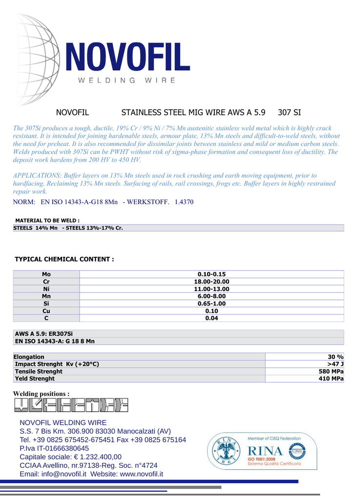 NOVOFIL STAINLESS STEEL MIG WIRE AWS A 5.9 307 SI The 307Si produces a tough, ductile, 19% Cr / 9% Ni / 7% Mn austenitic stainless weld metal which is highly crack resistant. It is intended for joining hardenable steels, armour plate, 13% Mn steels and difficult-to-weld steels, without the need for preheat. It is also recommended for dissimilar joints between stainless and mild or medium carbon steels. Welds produced with 307Si can be PWHT without risk of sigma-phase formation and consequent loss of ductility. The deposit work hardens from 200 HV to 450 HV. APPLICATIONS: Buffer layers on 13% Mn steels used in rock crushing and earth moving equipment, prior to hardfacing. Reclaiming 13% Mn steels. Surfacing of rails, rail crossings, frogs etc. Buffer layers in highly restrained repair work. NORM: EN ISO 14343-A-G18 8Mn - WERKSTOFF. 1.4370 MATERIAL TO BE WELD : STEELS 14% Mn - STEELS 13%-17% Cr. TYPICAL CHEMICAL CONTENT : ANALISI CHIMICA TIPICA Mo Cr Ni Mn Si Cu C 0.10-0.15 18.00-20.00 11.00-13.00 6.00-8.00 0.65-1.00 0.10 0.04 AWS A 5.9: ER307Si EN ISO 14343-A: G 18 8 Mn Elongation Impact Strenght Kv (+20°C) Tensile Strenght Yeld Strenght Welding positions : Tutte le posizioni NOVOFIL WELDING WIRE S.S. 7 Bis Km. 306.900 83030 Manocalzati (AV) Tel. +39 0825 675452-675451 Fax +39 0825 675164 P.Iva IT-01666380645 NOVOFIL S.r.l. – S.S. 7 Bis Km.306,900 – 83030 Manocalzati (AV). Tel +39 0825 675452-675451 Fax: + 39 0825 675164 - Email: [email protected] Capitale sociale: € 1.232.400,00 [email protected] Capitale Sociale: € 1.232.400,00 P.Iva IT- 01666380645 CCIAA Avellino, nr.97138-Reg. Soc. n°4724 CCIAA Avellino, nr. 97138 – Reg.Soc nr. 4724 www.novofil.it Email: [email protected] Website: www.novofil.it 30 % >47 J 580 MPa 410 MPa