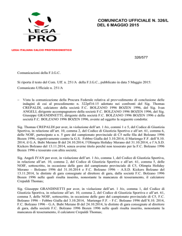 COMUNICATO UFFICIALE N. 326/L DEL 6 MAGGIO 2015 LEGA ITALIANA CALCIO PROFESSIONISTICO 326/577 Comunicazioni della F.I.G.C. Si riporta il testo del Com. Uff. n. 251/A della F.I.G.C., pubblicato in data 5 Maggio 2015: Comunicato Ufficiale n. 251/A Vista la comunicazione della Procura Federale relativa al provvedimento di conclusione delle indagini di cui al procedimento n. 322pf14-15 adottato nei confronti del Sig. Thomas CREPALDI, calciatore della società F.C. BOLZANO 1996 BOZEN 1996, del Sig. Ivan ANGELI, dirigente accompagnatore della società F.C. BOLZANO 1996 BOZEN 1996, del Sig. Giuseppe GRANDINETTI, dirigente della società F.C. BOLZANO 1996 BOZEN 1996 e della società F.C. BOLZANO 1996 BOZEN 1996, avente ad oggetto la seguente condotta: Sig. Thomas CREPALDI per aver, in violazione dell’art. 1 bis, commi 1 e 5, del Codice di Giustizia Sportiva, in relazione all’art. 10, comma 2, del Codice di Giustizia Sportiva e all’art. 61, comma 6, delle NOIF, partecipato a n. 5 gare del campionato provinciale di C5 nelle fila del Bolzano 1996 Bozen 1996, rispettivamente contro la G.S. Febbre Gialla del 3.10.2014, il Mariengo F.F. dell’8.10. 2014, il G.A. Bubi Merano B del 24.10.2014, l’Olimpia Holiday Merano del 31.10.2014, e l’A.S.D. Kickers Bolzano del 13.11.2014, senza averne titolo perché non tesserato per la F.C. Bolzano 1996 Bozen 1996 e tesserato con altra società; Sig. Angeli IVAN per aver, in violazione dell’art. 1 bis, comma 1, del Codice di Giustizia Sportiva, in relazione all’art. 10, comma 2, del Codice di Giustizia Sportiva e all’art. 61, comma 5, delle NOIF, sottoscritto, in occasione delle gare del campionato provinciale di C5, Olimpia Holiday Merano – Bolzano 1996 del 31.10.2014 e F.C. Bolzano 1996 – A.S.D. Kickers Bolzano del 13.11.2014, le distinte di gara consegnate al direttore di gara, dalla società F.C. Bolzano 1996 Bozen 1996 nelle quali risulta inserito, nonostante la mancanza di tesseramento, il calciatore Crepaldi Thomas; Sig. Giuseppe GRANDINETTI per aver, in violazione dell’art. 1 bis, comma 1, del Codice di Giustizia Sportiva, in relazione all’art. 10, comma 2, del Codice di Giustizia Sportiva e all’art. 61, comma 5, delle NOIF, sottoscritto, in occasione delle gare del campionato provinciale di C5, F.C. Bolzano 1996 – Febbre Gialla del 3.10.2014, Mariengo F.F. - F.C. Bolzano 1996 dell’8.10. 2014, F.C. Bolzano 1996 - G.A. Bubi Merano B del 24.10.2014, le distinte di gara consegnate al direttore di gara, dalla società F.C. Bolzano 1996 Bozen 1996 nelle quali risulta inserito, nonostante la mancanza di tesseramento, il calciatore Crepaldi Thomas; 326/578 società F.C. BOLZANO 1996 BOZEN 1996 per responsabilità oggettiva ai sensi dell’art. 4, comma 2, del Codice Giustizia Sportiva; vista la richiesta di applicazione della sanzione ex art. 32 sexies del Codice di Giustizia Sportiva, formulata dal Sig. Thomas CREPALDI, dal Sig. Angeli IVAN, dal Sig. Giuseppe GRANDINETTI, dal Sig. Franco Murano nell’interesse della società F.C. BOLZANO 1996 BOZEN 1996 nella qualità di Presidente; vista l’informazione trasmessa alla Procura Generale dello Sport; vista la prestazione del consenso da parte della Procura Federale; rilevato che il Presidente Federale non ha formulato osservazioni in ordine all’accordo raggiunto dalle parti relativo all’applicazione delle sanzioni di 2 giornate di squalifica nei confronti del sig. Thomas CREPALDI, di 20 giorni di inibizione nei confronti del Sig. Angeli IVAN, di 30 giorni di inibizione nei confronti del Sig. Giuseppe GRANDINETTI e di 1 punto di penalizzazione in classifica e € 200,00 di ammenda nei confronti della società F.C. BOLZANO 1996 BOZEN 1996; si rende noto l’accordo come sopra menzionato. Pubblicato in Firenze il 6 Maggio 2015 IL VICE PRESIDENTE Archimede Pitrolo 2