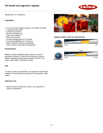 Vin brulé con agrumi e spezie Ricetta per 10-15 persone Ingredienti • 3 l di vino rosso (vitigno Gamay, vino della Turenna) • 4 stecche di cannella • 6 chiodi di garofano • 20 grani di pepe nero • 2 pz. anice stellato • 300 g di zucchero • la scorza grattugiata di 1/2 limone • la scorza grattugiata di 1/2 arancia • Noce moscata e zenzero grattugiati • 100 ml di gin (o altro tipo di acquavite) Preparazione Mettere tutti gli ingredienti nella vasca e avviare il processo di cottura. Al termine del tempo di cottura, filtrare il liquido per eliminare le spezie. Servire il vin brulé molto caldo in bicchieri di vetro. N.B. In caso di cottura a pressione, non superare mai il livello massimo di riempimento e osservare le indicazioni nella vasca. Sapevate che... • tempi di cottura ridotti fino al 30% con l’opzione di cottura a pressione Zuppe et salse, fondi di cottura/brodo senza alto 1 ora breve 1/1 lunga