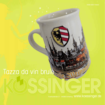 2009-008-F-Italien Tazza da vin brulè Fruehaufstraße 21 · 84069 Schierling www.koessinger.de 2 PERSONE DI RIFERIMENTO: P S Sig. Lars Nauheimer - Fon: +49 9451 499-129 ee-mail: [email protected] S Sig. Walter Roth - Fon: +49 9451 499-120 ee-mail: [email protected] FFax: +49 9451 499-101 3 Benvenuti da . . . N e l m o n d o de l l e t a z z e d a v i n b r u l è Vi invitiamo in un viaggio nel regno delle INFINITE POSSIBILITA’! Lasciatevi incantare dalle belle forme e figure ★ SEGUITECI! ★ ★★ ★★ ★ ★ ★ 4 ...... le antiche ....................................... forme conservate di Julia, Birgit, Stivalil & bicchieri 2 1 7 9 8 3 6 4 sono disponibili per voi più di 50 colori di smalto da scegliere! Diteci il vostro colore di smalto desiderato. Basta specificare il numero del Pantone. ★★ ★ ★★ ★ ★ 5 L A S C I AT E V I I S P I R A R E ! Molti modelli fotografati su queste pagine sono modelli di design brevettati. La violazione dei nostri brevetti sara’ legalmente perseguita! ★ 5 date i vendita? quantità d ale un nuovo le re ta n e n volete aum alla tazza tradizio ici a ente a dei man semplicem a una speciale form cotto, ... ie o di bis look graz li, di cuore forma di a gli stivali - Germania,Norvegia, Austria, Finlandia IBILE! S S O P È ! TUTTO O A NOI L E T E D CHIE le impilabili le slanciate - Birgit - Julia Versioni speciali con decori fino a 15 colori Sono possibili anche le versioni in gres calibrate a 0,2 litri con decori a vostra scelta interni e manici decorati. 4 1 2 3 5 6 Stivali e tazze in vetro Con calibratura precisa a 2 litri incisa In vetro trasparente o colorato, Con decori a vostra scelta interni e manici decorati! ★ 9 7 PREZZO A RICHIESTA. Tutte le tazze con marchio e indirizzo del produttore. 8 6 Decorazioni a mezzo rilievo Produzione straordinaria con fino a 15 decorazioni a colori + Tazze con struttura a rilevo, decorate ad arte con immagini transfer. Minimo 1200 pezzi. Da 200 ml, grès, con decorazioni a scelta, possibilità di decorare anche l’interno e di stampare dei motivi sul manico! 1 2 3 PREZZI SU RICHIESTA. Su tutte le tazze è presente l’indirizzo del produttore. Si accettano ordinazioni al massimo fino a settembre 2009 + + + + + + + + 4 Oltre 50 colori per la vetrinatura a vostra disposizione! Diteci quale colore desiderate. Realizziamo la vetrinatura con il colore che avete scelto. Inserite semplicemente il numero del pantone! 5 + + + ++ 7 Decorazioni completamente a rilievo ++ ++ + Produzione straordinaria con fino a 15 decorazioni a colori Decorazioni in rilievo realizzate a mano. Minimo 2.400 pezzi. Da 200 ml, grès, con decorazioni a scelta, PEZZO DI PUNTA: - fatto artigianalmente in ceramica - filigrana dipinta pazientemente a mano - possibilità di trasformare in ogni modo le decorazioni - alto numero di tazze portate a casa dai clienti - ottimo rapporto qualità-prezzo PREZZI SU RICHIESTA. Su tutte le tazze è presente l’indirizzo del produttore. Si accettano ordinazioni al massimo fino a luglio 2009 No copy? Right! + + + + + + + + 8 Decorazioni a rilievo premium Produzione straordinaria con fino a 15 decorazioni a colori Da 200 ml, grès, con decorazioni a scelta, PEZZO DI PUNTA: - tazza con struttura in filigrana a rilievo - decorata ad arte con splendide decalcomanie PREMIUM molto precise nei dettagli - possibilità di trasformare in ogni modo le decorazioni in base ai vostri desideri! PREZZI SU RICHIESTA. Su tutte le tazze è presente l’indirizzo del produttore. Si accettano ordinazioni al massimo fino a luglio 2009 ni di Nata ai mercati ti n e i li o c N i tr ? i vos tazze Volete che a casa più i rs in a v rt r o e p za p o di io una taz le decidan ad esemp o m e sorride h ia c n , o vi prop o Natale b b a n b i d rma ti, che no brulé a fo co ai clien ti a p . a im s s a ì os ela a c in modo c di portars o n e m a fare potranno m r o F + + + + Sache + + + + SSIBILE! O P È O TUTT CELO! E T E D E I CH + + ++ ++ ++ Si accettano ordinazioni al massimo fino a luglio 2009 + 5 6 4 1 2 3 7 BENVENUTI NEL REGNO DELLE INFINITE POSSIBILITÀ 8 9 11 12 13 Tazze a forma di soggetti vari, da 200 ml,dipinte a mano, al naturale o colorate, POS S I BI L I T U T T I I S O G GETTI! 15 9 16 14 10 10 Set vin brulé 3 pezzi Set vin brulé 2 pezzi costituito da: - 2 tazze natalizie a forma di stivale in ceramica da 200 ml, vetrinatura blu, decorazioni natalizie colorate - 1 bottiglia di vin brulé originale del mercatino di Natale di Norimberga da 375 ml - 1 esclusiva confezione regalo stam pata con motivi natalizi (pronta per la spedizione) e intarsiata 2 tazze a forma di stivale in ceramica con decorazioni natalizie colorate, (testo: Buon Natale), da 200 ml, con confezione regalo stampata a colori. Grazie alla forma speciale del coperchio della scatola potete inserire facilmente la vostra bottiglia di vin brulé da 750 ml – 1 l (senza vino), Imballaggio: 16 set / cartone esterno N. art. 100190 3,65 EUR/Set EDV-Nr. 100091 6,95 EUR/Set Set vin brulé 2 pezzi “Babbo Natale” Babbo Natale in 2 pezzi (inferiore e superiore), dipinto a mano, grès, 200 ml ciascun pezzo, in confezione regalo stampata a colori. Grazie alla forma speciale del coperchio della scatola potete inserire facilmente la vostra bottiglia di vin brulé da 750 ml – 1 l (senza vino), Imballaggio: 16 set / cartone esterno Riceverete Riceverete t gratuitamente grattuitame it nte t questo cartello. DIN A3, stampa a colori come da figura – N. art. 84563 EDV-Nr. 100191 3,65 EUR/Set 4 2 1 3 Tazza per vin brulé a forma di stivale vetrinatura blu, 200 ml N. art. 84552-06 Tazza per vin brulé a forma di stivale vetrinatura verde, 200 ml N. art. 84553-06 Tazza per vin brulé a forma di stivale vetrinatura bordeaux, 200 ml N. art. 84552-04 Tazza per vin brulé a forma di stivale vetrinatura blu, 200 ml N. art. 84552-05 v i s u l c ex 11 tazze classiche e a forma di stivale franco magazzino Tutte le tazze classiche e a forma di stivale “Buon Natale”, i