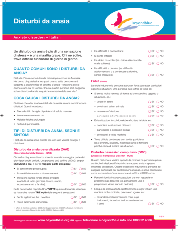 Disturbi da ansia Anxiety disorders – Italian Un disturbo da ansia è più di una sensazione di stress – è una malattia grave. Chi ne soffre, trova difficile funzionare di giorno in giorno. QUANTO COMUNI SONO I DISTURBI DA ANSIA? Disturbi d’ansia sono i disturbi mentali più comuni in Australia. Nel corso di qualsiasi anno quasi una su sette persone sarà soggetta a qualche tipo di disturbo d’ansia – circa una su sei donne e uno su 10 uomini. Una su quattro persone sarà soggetta ad un disturbo d’ansia in qualche momento della sua vita.1 COSA CAUSA I DISTURBI DA ANSIA? • Ha difficoltà a concentrarsi l SI’ l NO • Si sente irritabile l SI’ l NO • Ha dolori muscolari (es. dolore alle mascelle o alla schiena) l SI’ l NO • Ha difficoltà a dormire (es. difficoltà addormentarsi o a continuare a dormire, sonno irrequieto). l SI’ l NO Fobie (Phobia) Le fobie inducono la persona a provare forte paura per particolari oggetti o situazioni. Una persona può soffrire di fobia se: • Si sente molto nervosa di fronte ad uno specifico oggetto o situazione, es.: – volare in aereo l SI’ l NO – avvicinarsi ad un animale l SI’ l NO • Precedenti in famiglia di problemi di salute mentale – ricevere un’iniezione l SI’ l NO • Eventi stressanti nella vita – partecipare ad un’occasione sociale l SI’ l NO • Malattie fisiche prolungate • Evita situazioni in cui dovrebbe affrontare la fobia, es.: • Fattori di personalità. – cambiare la situazione di lavoro l SI’ l NO TIPI DI DISTURBI DA ANSIA, SEGNI E SINTOMI – partecipare a occasioni sociali l SI’ l NO – sottoporsi a visite mediche l SI’ l NO I disturbi da ansia sono di molti tipi, con una varietà di segni e di sintomi. • Trova difficile continuare con la vita quotidiana (es.: lavorare, studiare, incontrare amici e familiari) perché cerca di evitare tali situazioni. l SI’ l NO Si ritiene che a far scattare i disturbi da ansia sia una combinazione di fattori. Questi includono: Disturbo da ansia generalizzata (DAG) Disturbo ossessivo compulsivo (DOC) (Generalised Anxiety Disorder – GAD) Chi soffre di questo disturbo si sente in ansia la maggior parte dei giorni per lunghi periodi. Una persona può soffrire di DAG, se per SEI MESI o più, e per la maggior parte dei giorni: (Obsessive Compulsive Disorder – OCD) • Si sente molto preoccupata l SI’ l NO • Trova difficile smettere di preoccuparsi l SI’ l NO Questo disturbo si verifica quando la persona ha pensieri e paure continui e indesiderati/intrusivi che causano ansia – spesso chiamate ossessioni. Queste ossessioni inducono la persona ad eseguire certi rituali per sentirsi meno ansiosa, e sono conosciute come compulsioni. Una persona può soffrire di DOC se ha: l SI’ l NO • Pensieri ripetitivi o preoccupazioni che non riguardano problemi reali della vita (es. pensare che una o più persone vicine siano in pericolo) l SI’ l NO • Trova che l’ansia rende difficile svolgere le attività di tutti i giorni (es. lavoro, studio, incontrare amici e familiari). Se la persona ha risposto SI’ a TUTTE queste domande, chiedere se ha anche notato TRE o più delle seguenti sensazioni: • Sente agitazione, ha i nervi tesi l SI’ l NO • Prova facilmente stanchezza l SI’ l NO • Esegue la stessa attività ripetitivamente e ogni volta in una maniera molto ordinata, precisa ed uguale, es.: – lavandosi costantemente le mani, o gli indumenti, facendosi la doccia o lavandosi i denti l SI’ l NO 1 Ufficio di statistica australiano (2008). Sondaggio nazionale del 2007 sulla salute mentale e lo stato di benessere: Riassunto dei risultati (4326.0). Canberra: ABS. 1 di 4 Per maggiori informazioni www.beyondblue.org.au oppure Telefonare a beyondblue info line 1300 22 4636 Disturbi da ansia Anxiety disorders – Italian – lavando, pulendo or riordinando costantemente in una certa maniera a casa , al lavoro o nell’auto l SI’ E ha provato almeno DUE delle seguenti esperienze: l NO – controllando costantemente che porte e finestre siano chiuse a chiave e/o che gli elettrodomestici siano spenti l SI’ l NO • Trova sollievo nel breve temine facendo queste cose, ma presto sente il bisogno di ripeterle l SI’ l NO • Riconosce che tali sensazioni, pensieri e comportamenti sono irragionevoli l SI’ l NO • Trova che tali pensieri o comportamentis richiedono un’ora e più al giorno e/o interferiscono con la sua routine normale (es. lavoro, studio o incontrare amici e familiari). l SI’ l NO Disturbo post-traumatico da stress (DPTS) (Post Traumatic Stress Disorder – PTSD) Il DPTS comporta accessi di ansia dopo che la persona ha subito un grave shock emotivo, in seguito ad un evento stressante, es. un trauma. La persona può soffrire di DPTS se: • Ha subito o visto episodi di morte, ferimento, tortura o abusi e si è molto spaventata sentendosi impotente l SI’ l NO • Ha avuto ricordi o sogni conturbanti dell’evento per almeno UN mese l SI’ l NO • Trova difficile proseguire con la vita di tutti i giorni (es. difficoltà nel lavorare/studiare o andare d’accordo con familiari ed amici). l SI’ l NO Se la risposta è SI’ a TUTTE queste domande e la persona ha provato almeno TRE delle seguenti esperienze: • Ha difficoltà a dormire (es. ha incubi o trova difficile addormentarsi o continuare a dormire) l SI’ l NO • Va in collera o si irrita facilmente l SI’ l NO • Ha difficoltà a concentrarsi l SI’ l NO • Si sente minacciata l SI’ l NO • Trasale facilmente. l SI’ l NO Disturbo da panico (Panic Disorder) Il disturbo da panico comporta frequenti attacchi di panico, sensazioni intense di ansia che sembrano impossibili da controllare. La persona può soffrire di disturbi da panico se entro un PERIODO DI 10 MINUTI ha provato QUATTRO O PIU’ delle seguenti sensazioni: • Sudorazione l SI’ l NO • Insicurezza l SI’ l NO • Tachicardia l SI’ l NO • Mancanza di respiro l SI’ l NO • Sens