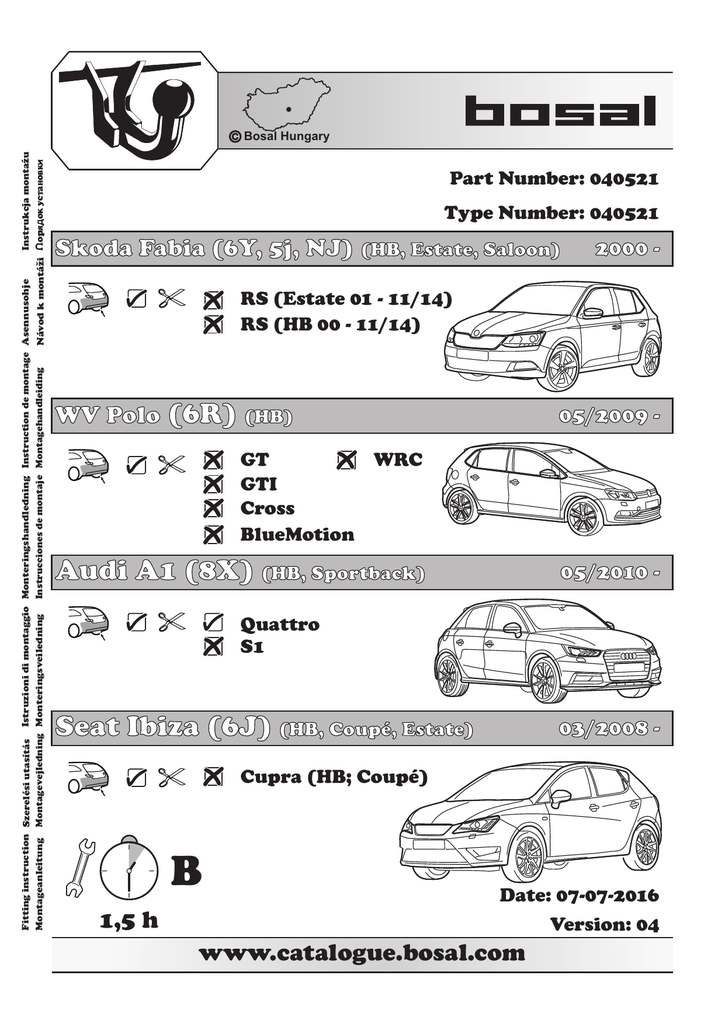 Fitting instruction Szerelési utasítás Istruzioni di montaggio Monteringshandledning Instruction de montage Asennusohje Instrukcja montazu Instrucciones de montaje Montagehandleiding Montageanleitung Montagevejledning Monteringsveiledning Návod k montázi op oK ycTaHoBK Bosal Hungary Part Number: 040521 Type Number: 040521 Skoda Fabia (6Y, 5j, NJ) (HB, Estate, Saloon) 2000 - RS (Estate 01 - 11/14) RS (HB 00 - 11/14) WV Polo (6R) (HB) 05/2009 - WRC GT GTI Cross BlueMotion Audi A1 (8X) (HB, Sportback) 05/2010 - Quattro S1 Seat Ibiza (6J) (HB, Coupé, Estate) 03/2008 - Cupra (HB; Coupé) B 1,5 h Date: 07-07-2016 Version: 04 www.catalogue.bosal.com E7 55R-011507 ECE R55 homologation S = 85 kg D= MAX KG X MAX KG MAX KG + MAX KG X 0,00981 < 7,50 kN 1665 kg 1415 kg D = 7,50 kN GB The clearance specified in appendix VII, diagram 25 of guideline ECE-R 55 must be guaranteed. GB at laden weight of the vehicle D Der Freiraum nach Anhang VII, Abbildung 25 der Richtlinie ECE-R 55 ist zu gewährleisten. D bei zulässigem Gesamtgewicht des Fahrzeuges H H rakománnyal terhelt járműsúly esetén. F Az ECE-R 55 irányelv VII. mellékletében, a 25. ábrán a vonógömb elhelyezése számára előírt szabad tér-adatokat biztosítani kell. La zone de dégagement doit être garantie conformément à l’annexe VII, illustration 25 de la directive ECE-R 55. I Deve essere garantito lo spazio libero secondo l’allegato VII, figura 25 della direttiva ECE-R 55. NL De tussenruimte conform supplement VII, afbeelding 25 van de richtlijn ECE-R 55 moet in acht worden genomen. E N pour poids total en charge autorisé du véhicule I per un peso complessivo ammesso del veicolo NL bij toelaatbaar totaal gewicht van het voertuig E Debe garantizarse el espacio libre, conforme al anexo VII, figura 25 de la directiva comunitaria ECE-R 55. con peso total autorizado del vehiculo FIN ajoneuvon suurimmalla sallitulla kokonaispainolla FIN Vapaa tila on taattava direktiivin ECE-R 55 liitteen VII, kuvan 25 mukaisesti. S F Spelrummet enligt bilaga VII, figur 25 i riktlinje ECE-R 55 skall garanteras. Frirommet etter tillegg VII, figur 25 i direktiv ECE-R 55 skal overholdes. S vid fordonets tillĺtna totalvikt N ved kjøretøyets tillatte totalvekt CZ při celkové přípustné hmotnosti vozidla CZ Volný prostor ve smyslu Přílohy VII, obr. 25 Směrnice č. ECE-R 55 musí být zaručen. PL Należy zagwarantować wolną wysokość określoną na rysunku nr 25 dyrektywy ECE-R 55 zawartej w załączniku nr VII. RU Необходимо обеспечить данные свободного пространства, предписанные для размещения тягового шарика в приложении VII. директивы ECE-R 55. DK Frirummet skal overholdes iht. bilag VII, fig. 25 i direktiv ECE-R 55. PL w przypadku największej dozwolonej masy całkowitej RU В случае нагруженного автомобиля. DK ved tilladt samlet vægt for køretøjet 15 Clearance space 100 Clearance space Vertical plane at limits of vehicle overal dimensions 65 max. 250 mm Vertical plane at limits of vehicle overal dimensions Ground 2 www.catalogue.bosal.com Przed holowaniem w każdym przypadku należy zapewnić dodatkowe połączenie, łańcuch bezpieczeństwa, który umożliwiają automatyczne zatrzymanie się przyczepy w przypadku oderwania się haka. English Polski W przypadku korzystania z zaczepu kulistego należy obowiązkowo przestrzegać przepisów producenta dotyczących maksymalnej masy przyczepy oraz maksymalnego pionowego obciążenia zaczepu, jak instrukcja użycia i dokumentacja WVTA. Proszę zapytać dystrybutora/miejscowego sprzedawcy, jaka jest maksymalna masa ciągniona Waszego samochodu. Specyfikacje dla zaczepu kulowego nie mogą być przekroczone. W skrajnych przypadkach, przeciążenie zaczepu kulistego może spowodować uwolnienie się sprzętu ciągnionego, a więc przyczepy, przyczepy kempingowej lub uchwytu na rower. Może to spowodować poważne lub śmiertelne obrażenia ciała osób znajdujących się w pojeździe ciągnącym i/lub przebywających w pobliżu przypadkowych przechodniów. The fixing points specified as standard must be observed. National guidelines concerning official approval of accessories must also be observed. All our products are adjusted upon dispatch with a weight control system. In the case of missing parts we can only accept a request of replacement with the weight control sticker. Guarantee is valid only for new towbars and accessories. The use of second-hand towbars is prohibited and could be life-threatening, where Bosal cannot be held responsible. Szélsőséges esetben a vonóhorog túlterhelése a vontatott berendezés, tehát az utánfutó, lakókocsi vagy kerékpártartó elszabadulását eredményezheti. Ez pedig súlyos vagy halálos kimenetelű sérülést okozhat a vontató járműben tartózkodó személyeknek és/vagy a területen tartózkodó vétlen nézelődőknek. A Bosal nem vonható felelősségre a termék olyan esetleges hibáiért, amelyeket helytelen vagy nem rendeltetésszerű használat okozott (többek között túlterhelés), akár a felhasználó, akár olyan személy részéről, akiért a felhasználó felelősséggel tartozik. Die Überbelastung der Anhängevorrichtung (bzw. das Missachten der Vorschriften) kann zu schweren Schäden am Fahrzeug und/oder der Anhängevorrichtung führen. A szabványosként meghatározott rögzítési pontoktól eltérni nem lehet. A tartozékok hatósági jóváhagyására vonatkozó nemzeti irányelveket is be kell tartani. Es dürfen keine Änderungen oder Umbauten an der Anhängevorrichtung vorgenommen werden ! Sie führen zum Erlöschen der Betriebserlaubnis. Die Anhängevorrichtung dient zum Ziehen von Anhängern, welche mit Zugkugelkupplungen ausgerüstet sind und zum Betrieb von Lastenträgern welche für die Montage auf der Kupplungskugel zugelassen sind, artfremde Benutzung ist verbo