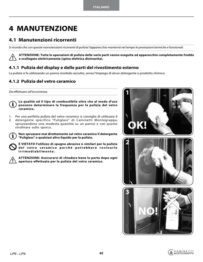 ITALIANO 4 MANUTENZIONE 4.1 Manutenzioni ricorrenti Si ricorda che con queste manutenzioni ricorrenti di pulizia l'apparecchio manterrà nel tempo le prestazioni termiche e funzionali. ATTENZIONE: Tutte le operazioni di pulizia delle varie parti vanno eseguite ad apparecchio completamente freddo e scollegato elettricamente (spina elettrica disinserita). 4.1.1 Pulizia del display e delle parti del rivestimento esterno La pulizia si fa utilizzando un panno morbido asciutto, senza l'impiego di alcun detergente o prodotto chimico. 4.1.2 Pulizia del vetro ceramico Da effettuarsi all'occorrenza. La qualità ed il tipo di combustibile oltre che al modo d'uso possono determinare la frequenza per la pulizia del vetro ceramico. 1. 2. Per una perfetta pulizia del vetro ceramico si consiglia di utilizzare il detergente specifico "Puliglass" di Caminetti Montegrappa, spruzzandone una modesta quantità su un panno e con questo strofinare sullo sporco. Non spruzzare mai direttamente sul vetro ceramico il detergente "Puliglass" o qualsiasi altro liquido per la pulizia. È VIETATO l'utilizzo di spugne abrasive o similari per la pulizia del vetro ceramico perché potrebbero rovinarlo irrimediabilmente. ATTENZIONE: Assicurarsi di chiudere bene la porta dopo ogni apertura effettuata per la pulizia del vetro ceramico. LP6 - LP9 42 ITALIANO 4.1.3 Manutenzioni ricorrenti tipo A Da effettuarsi almeno 2 volte alla settimana o giornalmente in base alle condizioni di utilizzo. L'esperienza dell'utilizzatore individuerà con il tempo la cadenza ottimale per la pulizia e manutenzione del proprio apparecchio. ATTENZIONE: Tutte le operazioni di pulizia delle varie parti vanno eseguite ad apparecchio completamente freddo e scollegato elettricamente (spina elettrica disinserita). Gli interventi di manutenzione aumentano proporzionalmente con le ore di utilizzo e le prestazioni richieste. ATTENZIONE: Prima di pulire l'apparecchio accertarsi che la cenere sia completamente fredda. Premesso questo per motivi di sicurezza, è possibile utilizzare un aspirapolvere per rimuoverla. L'attività prevista per le manutenzioni ricorrenti di tipo A è la seguente: 1. Aprire la porta dell'apparecchio lentamente, in modo da evitare che la cenere accumulatasi possa sollevarsi per il rapido movimento. 2. Rimuovere la griglia [G]. 3. Rimuovere il bruciatore [B]. 4a. Pulire il bruciatore [B] dalla cenere e da eventuali incrostazioni di cenere 4b. più consistenti, che potrebbero ostruire i canali di passaggio aria, utilizzando un aspirapolvere ed una spazzola con setole in acciaio o altro materiale comunque sufficientemente abrasivo. LP6 - LP9 43 ITALIANO 5. Afferrare il cinerario camera di combustione [H] ed estrarlo completamente per svuotarlo. 6. Muniti di un aspirapolvere sufficientemente potente (1000÷1300 W), aspirare tutta la cenere depositatasi nella camera di combustione, nel cinerario bruciatore e sulla porta. 7. Aspirare bene tutta la cenere rimasta all'interno del vano dove era inserito il cinerario. 8. Aspirare bene tutta la cenere depositatasi nella tasca della porta. A pulizia completata rimontare gli elementi tolti seguendo all'inverso questa sequenza. LP6 - LP9 44