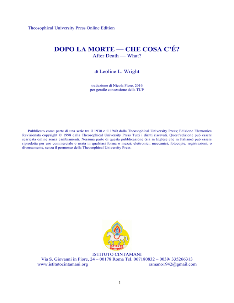 Theosophical University Press Online Edition DOPO LA MORTE — CHE COSA C’É? After Death — What? di Leoline L. Wright traduzione di Nicola Fiore, 2016 per gentile concessione della TUP Pubblicato come parte di una serie tra il 1930 e il 1940 dalla Theosophical University Press; Edizione Elettronica Revisionata copyright © 1998 dalla Theosophical University Press Tutti i diritti riservati. Quest’edizione può essere scaricata online senza cambiamenti. Nessuna parte di questa pubblicazione (sia in Inglese che in Italiano) può essere riprodotta per uso commerciale o usata in qualsiasi forma o mezzi: elettronici, meccanici, fotocopie, registrazioni, o diversamente, senza il permesso della Theosophical University Press. ISTITUTO CINTAMANI Via S. Giovanni in Fiore, 24 – 00178 Roma Tel. 067180832 – 0039/ 335266313 www.istitutocintamani.org [email protected] 1 Sommario Sezione 1 Capitolo 1: Introduzione Capitolo 2: Sonno e Morte Capitolo 3: Perché moriamo? Sezione 2 Capitolo 4: Devachan, il Mondo Celeste Capitolo 5: Possiamo comunicare con i Nostri “Morti”? Capitolo 6: Uno sguardo a ritroso Capitolo 7: La Morte e la Monade Sezione 3 Capitolo 8: Le Peregrinazioni della Monade Capitolo 9: Il Valore di questi Insegnamenti Capitolo 10: Morte e Rinascita Capitolo 11: Riposte ad alcune Domande Sezione 1 Capitolo 1 Introduzione La morte è un’apertura, è la sola cosa che dona la visione; la morte è il cambiamento più grande e più amabile che il cuore della natura ha in serbo per noi. — G. de Purucker, I Precetti Aurei dell’Esoterismo “Dov’è, o Morte, il tuo pungiglione? Dov’è la tua vittoria?” Conosciamo tutti queste belle parole di Paolo ma, ahimè, quanta poca consolazione hanno dato ai cuori in lutto, perché non c’è stato alcun insegnamento o esperienza che abbiano avvalorato la loro promessa. E tuttavia la verità è stata vicina a noi per tutto il tempo, sussurrando ai nostri cuori con la voce del suo amore per i nostri defunti: l’uomo spirituale è eterno, non ci sono morti. L’amore stesso è la prova della nostra sopravvivenza spirituale — l’amore vero, che è altruista e che nulla pretende, puro, indulgente, e indistruttibile. Possiamo mai smettere d’amare, anche se non piangiamo più per loro, quelli che ci hanno preceduti nella Terra della Luce? Il nostro amore, proprio perché è indistruttibile, deve nascere da un qualcosa in noi che è anche imperituro, perché come può essere una qualità più grande della sorgente dalla quale scaturisce? È nell’amore stesso che dobbiamo guardare per provare che lo spirito umano vive per sempre. Ma non dobbiamo dimenticare che è solo l’amore vero, e non l’attaccamento egoistico emotivo, che può aprire per noi la porta dell’autentica comunione spirituale con i nostri defunti. La teosofia ci dice che con la morte l’apparente separazione dai nostri cari non è reale e che noi viviamo nelle illusioni. Anche la scienza fisica non afferma forse che la materia è fatta “per lo più di buchi”? Tuttavia, sembra che la materia e la vita esterna siano diventate per noi tutto quello che ci preme conoscere. Viviamo quasi completamente negli scopi e interessi delle nostre personalità — le nostre menti-cervello o la nostra mentalità emotiva. E queste personalità, appartenendo grossolanamente alla terra, vincolate alle cose fisiche che periscono con il corpo, muoiono, e sfuggono alla comprensione umana. La grande lezione che dobbiamo imparare, se vogliamo tenerci in contatto spirituale non solo con i morti ma anche con tutti quelli che sono carnalmente assenti da noi, è la natura fugace della personalità. Dobbiamo imparare a capire che i nostri sé personali sono 2 transitori essi stessi. Quindi, scoprendo e vivendo nella realtà spirituale loro sottostante, comprenderemo che i nostri sé sono immortali, e cominceremo a vivere in quella radice permanente del nostro essere. Se riusciamo a farlo, noi vedremo, percepiremo che noi stessi siamo immortali oggi — ora — in questo momento! E allora riconosceremo anche i veri sé di quelli che amiamo, e sperimenteremo in ogni istante delle nostre vite il fatto che siamo insieme per sempre, sempre in contatto reale l’uno con l’altro, anche se gli occhi fisici non vedono il volto amato e le orecchie fisiche non sentono la voce di chi è assente. Solo la conoscenza dei nostri sé spirituali e dei sé spirituali interiori di quelli che amiamo ci darà la vittoria sulla morte. Infatti, è una verità da acquisire. Ciascuno di noi ha il potere di risolvere tutti i nostri problemi e rimarginare ogni dolore. La morte non è un mistero, nel senso di qualcosa che non possiamo comprendere. Le verità sulla morte sono nell’ambito di ciascuno di noi. È solo la nostra ignoranza delle realtà spirituali sottostanti alla vita materiale che circonda la morte di dolore, paura e timore. Se avremo coraggio e determinazione possiamo sollevare il velo e trovare, per mezzo delle nostre facoltà spirituali risvegliate, che la morte non è altro che entrare in una forma elevata d’esistenza su un piano dove noi e i nostri cari siamo inseparabili; e che, sempre uniti, “avanziamo di era in era e da altezze ad altezze sempre maggiori, per sempre.” L’ignoranza è il nostro nemico più grande, e soprattutto l’ignoranza della propria natura. Uomo, conosci te stesso! Perché in te giacciono tutte le possibilità e le realtà dell’universo. Poiché molti di noi non sanno praticamente nulla di loro stessi al di là delle anguste strettoie della vita in cui i nostri pensieri e sentimenti si ripetono quotidianamente, siamo ignoranti sul perché siamo qui e in quale luogo siamo confinati. Il lavoro della scienza moderna pondera la natura illusoria e ingannevole delle cose materiali. I fisici, ad esempio, ci dicono che i nostri corpi sono fatti di piccole particelle elettriche che la scienza classifica come elettroni, protoni, neutroni, ecc., ma che la teosofia chiama vi