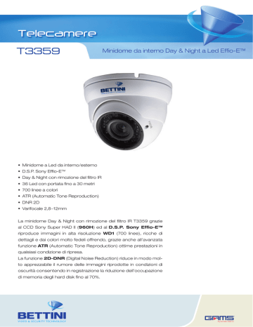 Telecamere T3359 Minidome da interno Day & Night a Led Effio-E™ • Minidome a Led da interno/esterno • D.S.P. Sony Effio-E™ • Day & Night con rimozione del filtro IR • 36 Led con portata fino a 30 metri • 700 linee a colori • ATR (Automatic Tone Reproduction) • DNR 2D • Varifocale 2,8~12mm La minidome Day & Night con rimozione del filtro IR T3359 grazie al CCD Sony Super HAD II (960H) ed al D.S.P. Sony Effio-E™ riproduce immagini in alta risoluzione WD1 (700 linee), ricche di dettagli e dai colori molto fedeli offrendo, grazie anche all’avanzata funzione ATR (Automatic Tone Reproduction) ottime prestazioni in qualsiasi condizione di ripresa. La funzione 2D-DNR (Digital Noise Reduction) riduce in modo molto apprezzabile il rumore delle immagini riprodotte in condizioni di oscurità consentendo in registrazione la riduzione dell’occupazione di memoria degli hard disk fino al 70%. Telecamere T3359 Minidome da interno Day & Night a Led Effio-E™ Le principali caratteristiche L’innovativa funzione ATR (Adaptive Tone Reproduction) propria dei D.S.P. Effio-E™ consente di ottenere il giusto bilanciamento dei colori anche in condizioni di controluce. Le applicazioni ideali sono rappresentate da scene in forte controluce, quindi con il soggetto retroilluminato, scene ad alto contrasto con aree molto illuminate ed aree in ombra e scene ove le condizioni di illuminazione cambiano continuamente. il DSP provvede a elaborare il segnale per ottenere immagini realistiche e fedeli, con colori ben bilanciati. La definizione di 700 linee a colori e 750 linee in bianco e nero è molto superiore rispetto a quella dei CCD convenzionali e consente la riproduzione di immagini più nitide e con maggiori dettagli. La funzione HLC (High Light Control) controlla forti abbagliamenti quali ad esempio i fari di una vettura proiettati direttamente contro la telecamera, annullandone completamente l’effetto e consentendo così di ottenere immagini sempre nitide e perfette. La funzione DNR 2D (Digital Noise Reduction) di ultima generazione riduce in modo molto apprezzabile il rumore di fondo del segnale video inevitabilmente generato in condizioni difficili di ripresa, restituendo immagini più nitide e consentendo in registrazione la riduzione dell’occupazione di memoria degli hard disk fino al 70%. Telecamere T3359 Minidome da interno Day & Night a Led Effio-E™ MODELLOT3359 Sistema TV Sensore CCD Elaborazione del segnale Elementi sensibili (H x V) Risoluzione Orizzontale Sistema di scansione Uscita video Numero e portata Led IR Menu O.S.D. Funzione Day & Night ATR (Automatic Tone Reproduction) DNR (Digital Noise Reduction) BLC (Back Light Compensation) HLC (High Light Control) AGC Bilanciamento del Bianco Flickerless Rapporto S/N (AGC Off) Gamma caratteristico Shutter Automatico Sincronizzazione Titolazione Parametri dell’immagine Sensibilità Obiettivo Regolazione fuoco e focale Alimentazione Consumo Housing Grado di protezione Cavi video e di alimentazione precablati Temperatura di lavoro Dimensioni in mm (ø x H) Peso in grammi PAL 1/3” Sony Super HAD II D.S.P. Effio-E™ 976 x 582 pixels 700 linee a colori • 750 linee in bianco e nero Interlaccio 2:1 1Vpp/75 Ohm 36 Led IR • portata 30 metri max. Doppio vetro per la riduzione della riflessione interna Tramite mini joystick integrato Con rimozione del filtro IR • Auto • Colore • Bianco e Nero Parametri programmabili On/Off 2D On/Off On/Off 3 Livelli programmabili Low A Middle A High A Off ATW • AWC • MWC • 2000°~11.000°K On/Off Selezionabile >48dB y=0,45 1/50~1/100.000sec. Interna 26 Caratteri alfanumerici Regolabili 0.25 Lux a colori F=2.0 • 0 Lux a Led accesi Varifocale manuale 2.8~12mm F=1.4 Esterna protetta 12Vcc +/-10% 400mA a Led accesi Alluminio IP66 Si -10°C~45°C • RH 95% max 119 x 82,5 580 Finalizzato ad un continuo e costante miglioramento, le specifiche del prodotto possono essere soggette a cambiamenti senza preavviso. Via E. H. Grieg, 23 - 21047 Saronno (VA) Tel. + 39 02 89651000 - Fax + 39 02 93182042 - www.bettinivideo.com