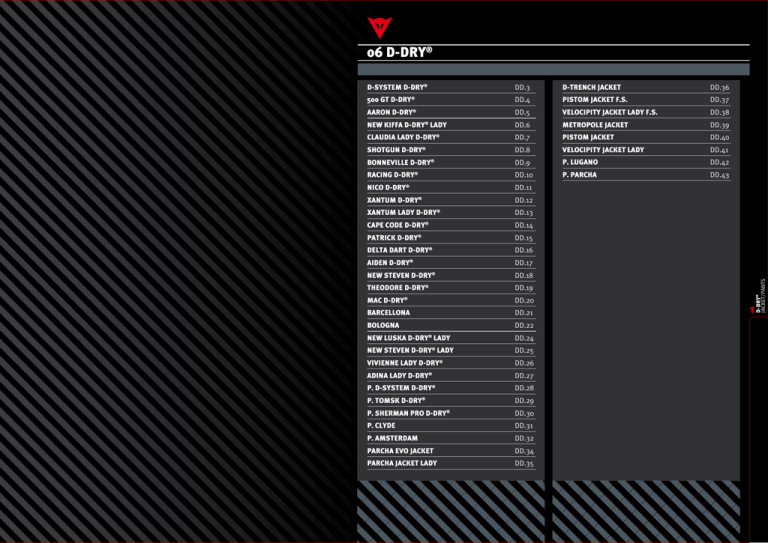 06 D-DRY® DD.3 D-TRENCH JACKET DD.36 500 GT D-DRY DD.4 PISTOM JACKET F.S. DD.37 AARON D-DRY® DD.5 VELOCIPITY JACKET LADY F.S. DD.38 NEW KIFFA D-DRY® LADY DD.6 METROPOLE JACKET DD.39 CLAUDIA LADY D-DRY DD.7 PISTOM JACKET DD.40 SHOTGUN D-DRY® DD.8 VELOCIPITY JACKET LADY DD.41 BONNEVILLE D-DRY DD.9 P. LUGANO DD.42 RACING D-DRY® DD.10 P. PARCHA DD.43 D-SYSTEM D-DRY® ® ® ® DD.11 XANTUM D-DRY® DD.12 XANTUM LADY D-DRY® DD.13 CAPE CODE D-DRY® DD.14 PATRICK D-DRY® DD.15 DELTA DART D-DRY DD.16 ® AIDEN D-DRY® DD.17 NEW STEVEN D-DRY DD.18 THEODORE D-DRY® DD.19 MAC D-DRY DD.20 ® ® BARCELLONA DD.21 BOLOGNA DD.22 NEW LUSKA D-DRY LADY DD.24 NEW STEVEN D-DRY® LADY DD.25 VIVIENNE LADY D-DRY® DD.26 ADINA LADY D-DRY® DD.27 P. D-SYSTEM D-DRY DD.28 ® ® P. TOMSK D-DRY® DD.29 P. SHERMAN PRO D-DRY DD.30 P. CLYDE DD.31 P. AMSTERDAM DD.32 PARCHA EVO JACKET DD.34 PARCHA JACKET LADY DD.35 ® 06 D-DRY® JACKET/PANTS NICO D-DRY ® D-System D-Dry® D-Dry® Jacket CARATTERISTICHE VERSIONI PROTEZIONE Da shock -Protettori compositi estraibili certificati secondo la norma EN 1621.1/97 Resistenza abrasione e trazione -Tessuto di marca Cordura® COMFORT Ergonomia -Chiusura collo regolabile -Regolazione ampiezza vita -Regolazione ampiezza polso -Cerniera aggancio giubbino-pantalone -Inserti in tessuto elastico Gestione temperatura -Membrana di marca D-Dry® impermeabile e traspirante -Fodera D-Dry® removibile -Fodera di marca Sanitized® -Prese d’ aria -Maniche staccabili ALTRE CARATTERISTICHE -Predisposizione paraschiena tipo G1 e G2 -Inserti rifrangenti -Tasche su fronte e retro -Tasche impermeabili su fodera removibile -Tasca su polso VESTIBILITA’ -Uomo Cod. 1654499 TAGLIE -Uomo 44/60 VARIANTI COLORE 604 Nero/Antracite 606 Nero/Rosso 631 Nero/Nero L08 Verde-M./Verde-M. FOCUS Pensata per l’offroad ed ispirata ai rally africani, D-System è un capo in Cordura estremamente versatile e polifunzionale. Essendo dotato di fodera impermeabile e staccabile D-Dry® e di prese d’aria su petto, fianchi, schiena e braccia, è perfetto anche per i periodi più caldi. Si può usare inoltre come gilet, dato che le maniche sono staccabili. Massima funzionalità, grazie alle numerose tasche esterne su fronte e retro e alle due tasche impermeabili sulla fodera e massima sicurezza con le protezioni composite estraibili, congiuntamente alla predisposizione per paraschiena di tipo G. STRUTTURA Front Back Motorbike Collection 2011 Rev.29/09/2010 Dd.3 500 Gt D-Dry® D-Dry® Jacket CARATTERISTICHE VERSIONI PROTEZIONE Da shock -Protettori compositi estraibili certificati secondo la norma EN 1621.1/97 Resistenza abrasione e trazione -Tessuto di marca Cordura® COMFORT Ergonomia -Tasca per supporto cervicale Neck 5/6 -Chiusura collo regolabile -Regolazione ampiezza vita -Regolazione ampiezza polso -Regolazione del fondo giacca con coulisse -Cerniera aggancio giubbino-pantalone -Inserti in tessuto elastico -Regolazione antiflottaggio manica Gestione temperatura -Interno di marca D-Dry® impermeabile e traspirante -Fodera termica removibile con doppio collo staccabile -Chiusura anteriore Idraflap ALTRE CARATTERISTICHE -Predisposizione paraschiena tipo G1 e G2 -Inserti rifrangenti -Tasca impermeabile su lista -Tasche impermeabili -Tasca su fodera staccabile -Tasca interna Motorbike Collection 2011 Rev.29/09/2010 Dd.4 VESTIBILITA’ -Uomo Cod. 1654489 -Lady Cod. 2654489 TAGLIE -Uomo 44/64 -Lady 40/52 VARIANTI COLORE 691 Nero/Nero/Nero 424 Nero/Rosso/Argento 776 Nero/Argento/Nero 368 Nero/Blu/Argento FOCUS Dedicata ai moto turisti attenti alla funzionalità ed alla protezione, ma sensibili anche al prezzo, 500 GT è confezionata in Cordura, con inserti in tessuto elastico su maniche e schiena, che, abbinati alle regolazioni di collo, polsi, maniche e vita, consentono un elevato comfort. Membrana impermeabile e traspirante D-Dry® e fodera termica removibile con doppio collo assicurano una corretta gestione della temperatura in tutte le condizioni climatiche. Protettori compositi estraibili, predisposizione per paraschiena di tipo G ed inserti rifrangenti completano la dotazione di questo capo dall’ottimo rapporto qualità-prezzo. STRUTTURA Front Back aaron D-Dry® D-Dry® Jacket CARATTERISTICHE NEW VERSIONI PROTEZIONE Da shock -Protettori compositi estraibili certificati secondo la norma EN 1621.1/97 Resistenza abrasione e trazione -Tessuto poliammide alta tenacità COMFORT Ergonomia -Cerniera aggancio giubbino-pantalone -Chiusura collo regolabile -Regolazione ampiezza polso -Regolazione ampiezza vita -Regolazione del fondo giacca con coulisse -Inserti in tessuto elastico Gestione temperatura -Membrana di marca D-Dry® impermeabile e traspirante -Membrana laminata con tessuto esterno -Tessuto esterno con trattamento idrorepellente -Chiusura anteriore Idraflap -Fodera termica removibile ALTRE CARATTERISTICHE -Predisposizione paraschiena tipo G1 e G2 -Inserti rifrangenti -Tasca impermeabile su lista -Tasca su fodera staccabile -2 tasche esterne -Tasca interna VESTIBILITA’ -Uomo Cod. 1654515 TAGLIE -Uomo 44/66 VARIANTI COLORE N00 Nero/Silver M93 Nero/Princess-Blue 606 Nero/Rosso FOCUS Comfort ed ergonomia, ma anche sicurezza e design moderno, secondo tradizione Dainese, caratterizzano questa giacca touring dall’ottimo rapporto qualità/ prezzo. Grazie alla membrana impermeabile e traspirante D-Dry® laminata al tessuto esterno si gode di grande leggerezza e rapidità di asciugatura in caso di pioggia. Comfort ed ergonomia sono assicurati dalla fodera termica removibile, dagli inserti in tessuto elastico, dalle regolazioni su fianchi, collo, polsi, fondo giacca, e dall’aggancio giacca-pantalone. Protettori compositi omologati, predisposizione per paraschiena e inserti rifrangenti completano la dotazione tecnica. STRUTTURA Front Back Motorbike Collection 2011 Rev.29/09/2010 Dd.5 NEW KIFFA D-Dry® LADY D-Dry® Jacket CARATTERISTICHE VERSIONI PROTEZIONE Da Shock -Protettori compositi estraibili certificati secondo la norm