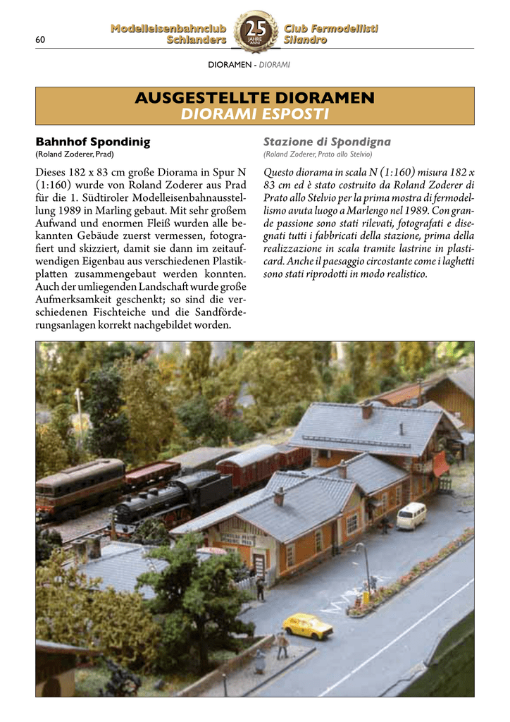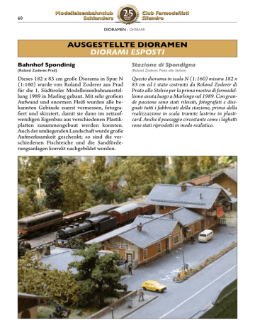 1SHIPPIMWIRFELRGPYF 7GLPERHIVW .%,6) %22- 'PYF*IVQSHIPPMWXM 7MPERHVS (-36%1)2(-36%1- %97+)78)008)(-36%1)2 (-36%1-)74378&ELRLSJ7TSRHMRMK 7XE^MSRIHM7TSRHMKRE 6SPERH>SHIVIV4VEH 6SPERH>SHIVIV4VEXSEPPS7XIPZMS Dieses 182 x 83 cm große Diorama in Spur N (1:160) wurde von Roland Zoderer aus Prad für die 1. Südtiroler Modelleisenbahnausstellung 1989 in Marling gebaut. Mit sehr großem Aufwand und enormen Fleiß wurden alle bekannten Gebäude zuerst vermessen, fotografiert und skizziert, damit sie dann im zeitaufwendigen Eigenbau aus verschiedenen Plastikplatten zusammengebaut werden konnten. Auch der umliegenden Landschaft wurde große Aufmerksamkeit geschenkt; so sind die verschiedenen Fischteiche und die Sandförderungsanlagen korrekt nachgebildet worden. Questo diorama in scala N (1:160) misura 182 x 83 cm ed è stato costruito da Roland Zoderer di Prato allo Stelvio per la prima mostra di fermodellismo avuta luogo a Marlengo nel 1989. Con grande passione sono stati rilevati, fotografati e disegnati tutti i fabbricati della stazione, prima della realizzazione in scala tramite lastrine in plasticard. Anche il paesaggio circostante come i laghetti sono stati riprodotti in modo realistico. 1SHIPPIMWIRFELRGPYF 7GLPERHIVW .%,6) %22- 'PYF*IVQSHIPPMWXM 7MPERHVS (-36%1)2(-36%1- /MVGLI0SRKEVSRI (IXPIJ:SKIP,IV^SKIREYVEGL( Nachdem Detlef Vogel bereits etliche Gebäude des Bahnhofs von Longarone gebaut hatte, wurde auch die Kirche dieses Ortes in der Nachbarprovinz Belluno in 1-jähriger Bauzeit nach Originalfotos angefertigt. Für die Übertragung der Abmessungen von den Fotos auf das Material wurde ein eigenes, spezielles Verfahren entwickelt. 'LMIWEHM0SRKEVSRI (IXPIJ:SKIP,IV^SKIREYVEGL( Dopo la realizzazione di molti fabbricati della stazione di Longarone è stata riprodotta anche la chiesa del paese Bellunese appoggiandosi a foto dell’originale. Per ottenere le misure dalle foto è stata applicata una speciale tecnica di calcolo. TARTAROTTI OTTO & HANS OHG 39021 LATSCH (VINSCHGAU) INDUSTRIEZONE 4 Tel. 0473 623129 - LAGER: 0473 623273 LANDWIRTSCHAFTLICHE ARTIKEL - BEREGNUNGSMATERIAL ELEKTRO-MATERIAL - GARTENARTIKEL 1SHIPPIMWIRFELRGPYF 7GLPERHIVW 'PYF*IVQSHIPPMWXM 7MPERHVS .%,6) %22- (-36%1)2(-36%1- &ELRFIXVMIFW[IVOMR2 (ITSWMXS0SGSQSXMZIMRWGEPE2 ,IMR^9RXIVLSP^IV7GLPERHIVW ,IMR^9RXIVLSP^IV7MPERHVS Bereits in den Anfangsjahren des Clubs ist dieses Diorama in Spur N entstanden und stellt einen Teil eines Dampfbetriebswerks dar. Es kann auch als Regal in einen Wohnzimmerglaskasten gestellt werden und stellt eine Alternative zu einer handelsüblichen Ausstellungsvitrine für Modelle dar. Alles, mit Ausnahme der Drehscheibenbrücke, ist im Eigenbau entstanden. Nei primi anni di esistenza del club è stato costruito questo diorama in scala N che rappresenta un deposito locomotive all’epoca del vapore. Questo diorama può essere inserito in una vetrina ed è quindi un’alternativa alle classiche vetrine di esposizione per rotabili. Tutto, ad eccezione del ponte della piattaforma girevole, è autocostruito. Bahnhofbar Mals BAR STAZIONE Del Pero Sonja Bahnhofstr. 32/C - 39024 Mals Tel. 0473 83 54 63 1SHIPPIMWIRFELRGPYF 7GLPERHIVW .%,6) %22- 'PYF*IVQSHIPPMWXM 7MPERHVS (-36%1)2(-36%1- *6)131SHYPI 1SHYPM*6)13 7MQSR*YGLW7IFEWXMER7XSGOIV7GLPERHIVW8IVPER *YGLW7MQSR7IFEWXMER7XSGOIV7MPERHVS8IVPERS Simon Fuchs aus Schlanders und Sebastian Stocker aus Terlan haben sich dem maßstäblichen Eisenbahnmodellbau verschrieben. Der FREMO:87-Norm folgend sind 2 erste Module nach italienischem (Südtiroler) Vorbild mit vorbildgerechtem Gleisoberbau in vollständigem Eigenbau entstanden. Gezeigt werden außerdem exakt maßstäbliche Modelle, ebenso Informationstafeln über den maßstäblichen Eisenbahnmodellbau nach Proto:87 bzw. FREMO:87. Simon Fuchs di Silandro e Sebastian Stocker di Terlano si dedicano al modellismo ferroviario in scala esatta. Seguendo lo standard FREMO:87 sono stati realizzati 2 moduli di ambientazione italiana (alto-atesina) con riproduzione in scala esatta dell’armamento dei binari, il tutto completamente autocostruito. Verranno inoltre presentati modelli in scala esatta, così come cartelli informativi sul modellismo ferroviario in scala esatta secondo gli standard Proto:87/FREMO:87. /I[\PWN :M[\I]ZIV\?MQV[\]JM+INv )TJMZOW:Q[\WZIV\M<I^MZVI+INv .IU<PIVMQ4WZMVb 1!5IT[5ITTM[ *]ZOMQ[*]ZO][QW <MT! .I`! OI[\PWN[\VQSWTI][(ZWTUIQTVM\ ___OI[\PWN[\VQSWTI][Q\ 1SHIPPIMWIRFELRGPYF 7GLPERHIVW .%,6) %22- 'PYF*IVQSHIPPMWXM 7MPERHVS (-36%1)2(-36%1- &VIRRIVMR27TYV &VIRRIVSMRWGEPE2 9[I>mTIVRMGO0YH[MKWLEJIR( 9[I>mTIVRMGO0YH[MKWLEJIR( Herr Uwe Zäpernick aus Ludwigshafen (D) ist schon seit vielen Jahren Mitglied des MEC Schlanders und hat sein Augenmerk auf die Brennerbahn geworfen. Besonders die Bahnanlage der Brenner-Grenzstation hat es ihm angetan und so entstand im Maßstab N (1:160) ein Diorama welches den Abschnitt ab dem alten FS-Stellwerk in Richtung Innsbruck bis zur Übergangstelle des FS/ÖBB-Oberleitungssystems zeigt. Zum Bau der Trasse wurden Gleise mit Betonund Holzschwellen von Peco verwendet. Entsprechend dem Vorbild wurden die Gleise mit hellem Schotter versehen. Sämtliche FS- und ÖBB-Oberleitungsmasten sind im Eigenbau entstanden. Ebenfalls eine Eigenkonstruktion ist das originalgetreue FS-Stellwerk. Uwe Zäpernick di Ludwigshafen (D) è socio del club da molti anni ed è appassionato della linea del Brennero. La sua stazione preferita è quella di Brennero e così è stato realizzato un diorama in scala N che riproduce la zona della vecchia cabina di comando in direzione Innsbruck fino al punto di cambio sistema FS/ÖBB. Per la costruzione sono stati utilizzati binari con traversine in cemento e in legno della Peco, inghiaiati con ballast chiaro come al vero. I pali della linea aerea FS e ÖBB sono autocostruiti così come anche la cabina di comando. THÖNI JOSEF GMBH / Stuhl- und Tischfabrik 39026 Prad am Stilfserjoch Kiefernhainweg 100 Tel. 0039 / 0473 / 61 62 43 Fax 0039 / 0473 / 61 67 34 ^^^Z[\