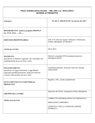 Piano Collaborativo Scuola – ASL CN1 a.s. 2013/2014 SCHEDA di PROGETTO TITOLO “Il cibo C..ROCKANTE: la musica del cibo” RIFERIMENTO numero progetto PRP/PLP (es. 2.9.2, 2,9.6, ….etc…. SERVIZIO RESPONSABILE ASL CN1 Servizio Igiene Alimenti e Nutrizione, Istituto alberghiero di Mondovì ANNO di AVVIO 2014-2016 MANDATO specificare se obiettivi regionali; obv aziendali; obv autodeteminati da un servizio o altro Obiettivi aziendali (PLP),autodeterminati ist. alberghiero/SIAN FINANZIAMENTI specificare se legge Nazionale; Legge/Bando regionale;autofinanziamento; fondi per l'attività corrente istituzionale; privati o altro Autofinanziamento; fondi per l'attività corrente istituzionale Regione, ASL, scuola, popolazione ENTI COINVOLTI E PARTNERS di PROGETTO Operatori del SIAN, insegnanti istituto alberghiero GRUPPO DI LAVORO CORRETTE INFORMAZIONI NUTRIZIONALI TEMA di SALUTE IMMAGINE CORPOREA CRITICITA' NELLA COMUNICAZIONE PUBBLICA DESTINATARI FINALI ALUNNI 4° e 5° ANNO IST: ALBERGHIERO INSEGNANTI GENITORI SETTING Scuola MOTIVAZIONI RAZIONALI E EVIDENCE –BASED AL PROGETTO “I ragazzi si barricano nella propria camera coi poster dei loro eroi, guardano i propri spettacoli, camminano per strada immersi nella propria musica” (F. Alberoni “Profeti e eroi della Internazionale degli adolescenti”) ( 2 ). “La musica è respiro. La musica è cibo” (Burroughs William S., scrittore, autore de “Il pasto nudo”). “I fattori genetici si intrecciano con quelli ambientali nel determinare i gusti musicali. Rock, indie e heavy metal: l'educazione prende il sopravvento sulla natura negli appassionati di Pink Floyd, Radiohead o Iron Maiden. Per chi ama rock, indie ed heavy metal secondo lo studio - i geni contano solo per il 40%. Il resto va imputato all'educazione familiare e alle esperienze personali”(1). La musica rock è un fattore culturale (3) Ogni fattore culturale è un insieme di pensiero razionale, mito e rito (4). Il medium è il messaggio: ne consegue che per fare passare un’informazione, è più importante impostare la FORMA del messaggio che non il messaggio stesso (5, 6, 7). Pertanto, il messaggio di “salute e corretta alimentazione” a seconda di come lo si presenta viene diversamente accolto. In parole povere “il pacco e il fiocco in cui si impacchetta il messaggio contano ALMENO QUANTO IL CONTENUTO”(7). La musica coinvolge aree del piacere legate anche al cibo, a conferma dello stretto rapporto tra alcune funzioni ataviche, come sesso, cibo e musica, legate al rilascio di dopamina, l’ormone del relax e del piacere (8) .La musica (studi con Risonanza Magnetica Funzionale) attiva diverse aree cerebrali.: principalmente nella corteccia uditiva primaria e inoltre nell’emisfero destro. Nei brani dissonanti (come la musica rock) si manifesta anche una attivazione nella corteccia frontale e nelle strutture limbiche. L’interazione cerebrale tra impulso elettrico e proteina CPEB (un prione che agisce fisiologicamente a livello dendritico) attiva i meccanismi di “ri-narrazione” e modificazione mnemonica, in maniera più o meno incisiva. Nessuno di noi conserva ricordi di eventi passati intatti, ma vengono continuamente modificati (9). Mentre vista, tatto e udito attivano circuiti di memoria a lungo termine più facilmente rimodellabili (area del talamo), gusto e olfatto attivano aree meno facilmente rimodellabili e più ataviche (zona dell’ippocampo). (10). Questo fa sì che un’ attività didattica che opera su più livelli, attraverso stimoli multimediali come musica, lezioni frontali razionali, interattività, video e procedure cenestesiche (es.: l’azione del cucinare) ha molta più efficacia e a livelli di varia profondità. Un messaggio di salute così inviato ha più probabilità di essere sia recepito che interiorizzato. (8,9,10, 11). Recenti autorevoli studi hanno indagato il nesso e l’origine neurofisiologica dei principi etici e normativi. Dagli studi risulta che l’intuizione e le scelte morali ed etiche si formano attraverso identiche linee e processi neuronali, su una base comune, emozionale e sentimentale, e non razionale (fondamentale è uno studio di J. Blair sui principi etici degli psicopatici anaffettivi, citato da Shaun). Ne deriva che per promuovere un cambiamento dei principi etici e dei comportamenti normativi, (gli stili di vita e le scelte alimentari appartengono a questo ambito) è molto efficace agire sul lato delle emozioni e dei sentimenti. (12, 13). La musica rock nei giovani è legata a un vasto retroterra sentimentale- emozionale: attraverso la musica e le parole della musica essi si esprimono e comunicano: questo nesso tra cultura giovanile e musica rock è stato evidenziato e indagato da Allan Bloom (14). Vista la complessità dei fattori che favoriscono il sovrappeso e l’obesità in adolescenza, l’International Obesity Task Force e altri autorevoli caregiver, dimostrano l’importanza di un modello di prevenzione che si fondi su un approccio socio-ecologico e che agisca sui PAR, tra cui i Predisponenti: stile di vita del singolo e le caratteristiche dei principali ambienti di vita (es.: la scuola).(15,16, 17). Il modello socio cognitivo integrato di Fishbein, spiega come un approccio che agisca su credenze normative e comportamentali possa essere efficace.(18, 19). Abbiamo già visto sopra come in realtà le credenze normative e comportamentali siano profondamente collegate alle pulsioni sentimentali ed emozionali a cui la musica è connessa. In Italia e in Europa ultimamente vi sono molte iniziative promuoventi stili di vita corretti e comportamenti sani, che uniscono il cibo e la musica (soprattutto rock). Performer e artisti più o meno famosi interagiscono promuovendo il binomio “musica e cibo sano”. Ne citiamo alcuni, collegati ad eventi importanti italiani: A) Donpasta e il “SoulFood festival” di Roma, 24-26 Maggio 2013 (20); B) la Vegetable Orchestra di Vienna, nata nel 1998; C) Fabio Bonelli con l