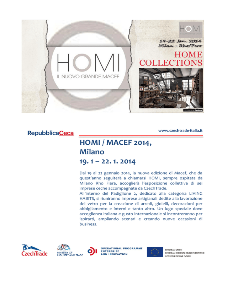 www.czechtrade-italia.it HOMI / MACEF 2014, Milano 19. 1 – 22. 1. 2014 Dal 19 al 22 gennaio 2014, la nuova edizione di Macef, che da quest’anno seguiterà a chiamarsi HOMI, sempre ospitata da Milano Rho Fiera, accoglierà l’esposizione collettiva di sei imprese ceche accompagnate da CzechTrade. All’interno del Padiglione 2, dedicato alla categoira LIVING HABITS, si riuniranno imprese artigianali dedite alla lavorazione del vetro per la creazione di arredi, gioielli, decorazioni per abbigliamento e interni e tanto altro. Un lugo speciale dove accoglienza italiana e gusto internazionale si incontreranno per ispirarti, ampliando scenari e creando nuove occasioni di business. Padiglione 2 Numero dello stand T21 – U22 Dworokova Magdalena La nostra ditta si dedica alla produzione di vetro esclusivo di alta qualità. La nostra gamma di prodotti è composta principalmente da bicchieri, vasi, portacaramelle, posacenere, portafrutta, ciotole, caraffe ed altro, sia in cristallo ceco che in vetro colorato, lavorato d'intaglio e decorato con profili in oro. Si tratta della produzione di collezioni artistiche in piccole serie. INDIRIZZO Dworokova Magdalena Duelská 109 - 739 91 Jablunkov Tel.: +420 558 357 818 Email: [email protected] www.nikeglass.cz Evolution Group CZ, s.r.o. INDIRIZZO Evolution Group CZ s.r.o. Maltézské náměstí 537/4 118 00 Praha 1 Czech Republic Tel.: +420 483 313 122 Email: [email protected] www.evolutiongroup.cz La nostra azienda, Evolution Group CZ, è uno dei principali produttori cechi di gioielli in argento con Swarovski Elements. I nostri gioielli vengono prodotti tramite metodi tradizionali ed utilizzando le tecnologie più moderne. I materiali utilizzati sono esclusivamente di produzione ceca e vengono completati con componenti Swarovski Elements. Durante questa esposizione, saremo lieti di presentare le ultime collezioni e i modelli provati di gioielli in argento creati dai nostri designer. Siamo convinti che gli orecchini, le collane, i braccialetti, i ciondoli e le parure Vi affascineranno già al primo sguardo. Kavalierglass, a.s. Kavalier è il Leader europeo per la produzione di vetro borosilicato da 177 anni. Il Marchio Simax offre vetro borosilicato di grande qualità e design. Centinai di prodotti sono offerti in unico stile per soddisfare ogni gusto. Il vetro ad alta resistenza Simax, permette di cucinare, servire e conservare ed anche ricuocere a microonde, il tutto in una volta sola. Negli ultimi anni c’è stato un forte aumento di richieste di insalatiere, teiere e brocche che costituiscono al presente, assieme ai biberon, il Core business delle vendite in Italia. Da quest’anno Kavalierglass e anche produtore di articoli in vetro cristallino. Al momento stiamo producendo una parte dei prodotti della gamma Waltherglas, brand che comprende diverse insalatiere, vasi e piatti con un’ampia gamma di decori e di colori. INDIRIZZO Kavalierglass, a.s. Křížová 1018/6 150 00 Praha 5 Czech Republic Tel.: +420 327 550 111 Email: [email protected] www.kavalier.cz Martin Odvárka – OdvarkaBijoux.com INDIRIZZO Martin Odvárka – OdvarkaBijoux.com ha un Barvířská 128 460 07 Liberec Czech Republic Tel.: +420 603 995 182 Email: [email protected] www.odvarkabijoux.com Produciamo e rivendiamo all‘ingrosso bigiotteria di strass ceca, perle di Boemia ed arredi, e siamo orgogliosi di proseguire la lunga tradizione di produzione artigianale di gioielli della nota città di Jablonec. Le nostre linee includono prodotti interessanti per chiunque ricerchi bigiotteria superiore, vari tipi di perle e applicazioni stravaganti per abiti, scarpe, stivali e per interni. Ogni articolo è realizzato in Repubblica Ceca da professionisti con un elevato senso di qualità ed originalità. Possiamo vantare, inoltre, il rispetto della nostra produzione per tutte le norme ecologiche e lavorative europee. REXPO - Ing. Jan Ryšánek La società REXPO, costituita nel 1991, ha sede e punto vendita in via Podhorská, 66A a Jablonec nad Nisou. Siamo una piccola azienda a conduzione familiare che produce un ampio assortimento di bigiotteria: bigiotteria in vetro, bigiotteria metallica, bigiotteria strass, bigiotteria di perle e perline in legno. Attualmente ci occupiamo soprattutto della bigiotteria con perle e perline levigate in combinazione con catene o altri elementi metallici. Per la produzione sono utilizzati solo semilavorati prodotti rigorosamente in loco. Tutte le perle e perline in vetro provengono da produttori di Jablonec nad Nisou. La nostra bigiotteria viene venduta sia sul mercato nazionale che quelli esteri. La nostra clientela è composta da esportatori e grossisti locali, o clienti finali tramite l'e-commerce. Esportiamo i nostri prodotti nei paesi dell'UE, USA, Canada e Messico. INDIRIZZO REXPO Ing. Jan Ryšánek Podhorská 66 A 466 01 Jablonec nad Nisou Czech Republic Tel.: +420 777 333 481 Email: [email protected] www.rexpo.cz Ing. Jaroslav Studnička La nostra azienda produce palle di Natale ed altre decorazioni natalizie in vetro soffiato, candele, uova pasquali tutte dipinte a mano. Dal 2003 partecipiamo ogni anno alla fiera di Milano dove esponiamo prodotti molto apprezzati dalla nostra clientela. Ognuno dei nostri prodotti, tipici della tradizione Ceca e interamente lavorati a mano, è un pezzo unico e originale. Ogni anno siamo presenti nei mercati natalizi di Vienna (Maria Theresien Platz, Belvedere) Firenze (Piazza Santa Croce) ed anche di altre località italiane. INDIRIZZO Ing. Jaroslav Studnička Padělky 254 696 61 Vnorovy II Czech Republic Tel.: +420 518 328 243 Mail: [email protected] www.fontanaart.eu