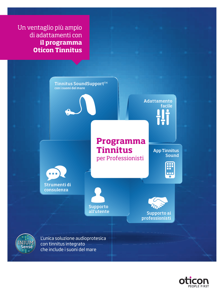 Un ventaglio più ampio di adattamenti con il programma Oticon Tinnitus Tinnitus SoundSupportTM con i suoni del mare Adattamento facile Programma Tinnitus per Professionisti App Tinnitus Sound Strumenti di consulenza Supporto all'utente L'unica soluzione audioprotesica con tinnitus integrato che include i suoni del mare Supporto ai professionisti Il pacchetto tinnitus completo che include i suoni del mare Una nuova generazione di programmi Tinnitus Tinnitus SoundSupportTM Che tu abbia o meno grande esperienza con i programmi tinnitus, ora Oticon ti supporta con un nuovo pacchetto completo. Studi di mercato approfonditi e collaborazioni con esperti in disturbi del tinnitus ci hanno permesso di valutare i tipi di programma disponibili sul mercato e rielaborarne uno totalmente innovativo per il tinnitus. Tinnitus SoundSupportTM Oticon – Un nuovo standard per generatori di suono Il Tinnitus SoundSupport stabilisce un nuovo standard per i generatori di suono, essendo il primo ad offrire il suono del mare integrato, assieme a molte altre opzioni sonore e controlli di regolazione. Ciò ti consente di personalizzare i suoni di sollievo in base alle esigenze individuali dell'utente. Maggior scelta non è sinonimo di maggior complessità. Durante il processo di adattamento offriamo una navigazione ed un supporto semplice ed agevole. con i suoni del mare Adattamento facile Consulenza Tinnitus a 360° – Strumenti e supporto per gli utenti Nessun pacchetto di trattamento tinnitus è completo se ogni utente non riceve l'adeguata consulenza e formazione. Nel nostro pacchetto tinnitus abbiamo incluso strumenti di consulenza e supporto per aiutarti a guidare gli utenti attraverso il loro percorso verso l'attenuazione dei disturbi da tinnitus. BrainHearing™ e Tinnitus Il nostro obiettivo audiologico è supportare il modo in cui il cervello dà un senso ai suoni e su tale presupposto sviluppiamo le nostre tecnologie. Il Tinnitus è spesso associato ad una perdita uditiva, ma viene principalmente considerato un disturbo a carico del cervello. Il cervello compensa la perdita uditiva regolando la sua percezione dei suoni. Per alcuni utenti, il cervello inizia ad amplificare i suoni che altrimenti passerebbero inosservati – così, si innesca il tinnitus e con esso un ciclo di stress emotivo. Oticon si basa sulla comprovata ed affidabile terapia sonora fornendo i suoni in base alle preferenze dell'utente, riducendo l'inclemenza del tinnitus nel sistema uditivo. Programma Tinnitus per Professionisti App Tinnitus Sound Strumenti di consulenza Supporto all'utente Supporto ai professionisti Gli studi indicano che gli stimoli sonori devono produrre un'attività cerebrale che sia al contempo affidabile e sincrona così da aiutare a rompere questo circolo vizioso. Oticon sa bene che "non esiste un suono per tutti" pertanto la nostra soluzione soddisfa l'esigenza di avere a disposizione molte opzioni sonore, tra cui i suoni del mare, suoni modulati, e suoni a banda larga. Ad ogni utente quindi può essere offerto lo stimolo sonoro migliore compatibilmente alla propria percezione. 2 3 Suoni del mare esclusivi Il primo a introdurre i Suoni del Mare Gli Audioprotesisti riferiscono che tra i loro utenti, i suoni del ‘Mare’ sono quelli preferiti rispetto ai convenzionali suoni a banda larga2. 2 Basato su un sondaggio condotto nel 2014 su 88 Audioprotesisti del Canada che hanno adattato Alta e Nera con il Tinnitus SoundSupport. Ora gli utenti possono apprezzare l'amplificazione e i diffusi suoni del mare direttamente nei propri apparecchi acustici – senza bisogno di ulteriori dispositivi I suoni del mare promettono grandi risultati I suoni tradizionalmente utilizzati nella terapia sonora sono sempre stati quelli a banda larga, tipo rumore bianco o rosa. Oticon ha ampliato i noti suoni a banda larga aggiungendo alla nostra selezione ben tre tipi di suoni del mare. Questi suoni della natura sono dinamici, ma rilassanti, e promettono grandi risultati nella riduzione dei disturbi da tinnitus.1 1. ‘Mi piace quel suono!’ Gli studi condotti dimostrano che una terapia sonora di successo richiede dei suoni di trattamento che ottengano una risposta positiva dagli utenti. Nessun cervello funziona allo stesso modo e alcuni utenti richiedono suoni che siano più dinamici o che per loro abbiano delle caratteristiche esclusive. Per questo è utile avere più suoni. Da oggi agli utenti puoi offrire un nuovo suono in alternativa a quelli tradizionali per il sollievo da tinnitus. Searchfield, G.D., Cameron, H., Irving, S., Kobayashi, K. (2009). Proceedings of Tinnitus Discovery: Asia-Pacific Tinnitus Symposium, The New Zealand Medical Journal, 116-124. Henry, J.A., Rheinsburg, B., Zaugg, T. (2004). Journal of the American Academy of Audiology, 15: 585-598 4 5 Tinnitus SoundSupport Disponibile nell'intera Performance Line Da Oticon il nuovo generatore di suoni più completo del settore Oticon Tinnitus SoundSupportTM Suoni del mare Caratteristiche Benefici 9 I suoni del mare sono dinamici e coprono un ampio spettro frequenziale. I tre suoni della natura Oticon si basano sui suoni a banda larga per emulare il ritmo del mare. I suoni del mare hanno capacità calmanti e rilassanti. 9 Un'opzione sonora a banda larga personalizzata sulla base delle soglie frequenziali audiometriche dell'utente. Per offrire a te e agli utenti un facile e rapido punto di partenza per cercare il suono di sollievo adeguato. 9 Rumore bianco – un segnale a banda larga e spettro piatto. Rumori rosa e rosso – segnali a banda larga che riducono il contenuto delle alte frequenze rispettivamente di -3 dB e -6 dB per ottava. Tradizionalmente usati nella terapia sonora. Efficaci per molti utenti, come suoni di sottofondo di sollievo. 9 Una variazione di ampiezza nel tempo. Quattro opzioni di modulazione applicabili a tutti i segnali a banda larga. Con la modulazione hai più opportunità di individuare i suoni di sollievo che rispondano alle esigenze e pref