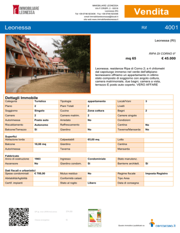 IMMOBILIARE LEONESSA VIA F.CRISPI, 2 - 02016 Leonessa (RI) Tel +39-0746-923406 - Fax +39-0746-923406 email [email protected] sito web www.immobiliareleonessa.it Vendita Leonessa 4001 Rif Leonessa (RI) RIPA DI CORNO II° mq 65 € 45.000 Leonessa. residence Ripa di Corno 2; a 4 chilometri dal capoluogo immerso nel verde dell'altipiano leonessano offriamo un appartamento in ottimo stato composto di soggiorno con angolo cottura, camera matrimoniale, due bagni, camera a vista, terrazzo E posto auto coperto. VERO AFFARE Dettagli Immobile Categoria Turistica Tipologia appartamento Locali/Vani Piano 2 Piani Totali 2 Livelli Soggiorno Singolo Cucina Zona cottura Bagni Camere 2 Camere matrim. 2 Camere singole Autorimessa Posto auto Arredato No Condizioni Riscaldamento Autonomo Raffrescamento Balcone/Terrazzo Si Giardino Calpestabili Superfici Abitazione lorda Balcone 10,00 mq Autorimessa 3 2 Cantina No No Taverna/Mansarda No 65,00 mq Lotto Giardino Cantina Taverna Mansarda Fabbricato Anno di costruzione 1983 Ingresso Condominiale Stato manutenz. Ascensore No Giardino condom. Si Barrierre architett. Si Dati fiscali e urbanistici Spese condominiali € 700,00 Mutuo residuo No Regime fiscale Imposta Registro Abitabilità/Agibilità Conformità catast. Certif. impianti Stato al rogito EP gl, nren (KWh/m2 anno) 374,50 Classe energetica G Tipo Area Data di consegna Libero G 374,5 Questo immobile è pubblicato su