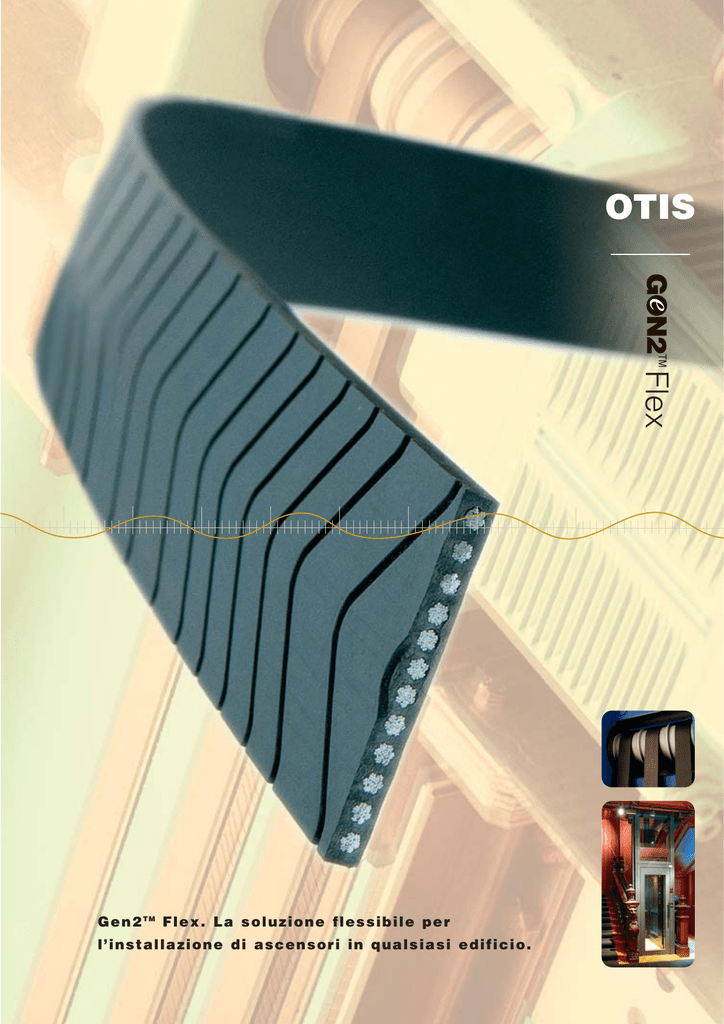 OTIS Flex G en2 TM Flex. La soluzione flessibile per l’installazione di ascensori in qualsiasi edificio. L’ascensore Gen2 Flex ➍❺ ➋ DRIVE TRADIZIONALE Il sistema tradizionale a circuito aperto è soggetto ad un andamento non lineare che si traduce in movimento a scatti, improvvisi sobbalzi e rallentamenti indesiderati. L’ascensore senza locale macchina che assicura ineguagliabili livelli di comfort, Velocità ➊ Tempo affidabilità, sicurezza e rispetto dell’ambiente. Velocità Tempo FUNI D’ACCIAIO CONVENZIONALI ➌ ➌ DRIVE A CIRCUITO CHIUSO VF La corsa confortevole e rapida, l’eccezionale precisione di livellamento al piano, un significativo risparmio energetico e l’incomparabile affidabilità sono solo alcuni dei numerosi vantaggi del sistema a circuito chiuso. PULEGGIA TRADIZIONALE L’ampio raggio di curvatura delle funi d’acciaio convenzionali richiede una macchina di grandi dimensioni con puleggia di diametro di 50/60 cm. ➊ CINGHIE PIATTE FLESSIBILI RINFORZATE IN ACCIAIO La cinghia piatta in acciaio rivestita in poliuretano è il 20% più leggera e dura tre volte di più rispetto alle funi convenzionali. Inoltre, non richiede lubrificazione. ➍ MACCHINA CONVENZIONALE Pesante ed ingombrante, la macchina convenzionale richiede grandi consumi di energia. PULEGGIA COMPATTA La puleggia del GeN2 di soli 8 cm di diametro, ha permesso ad Otis di progettare una macchina fino a 70% più piccola delle macchine tradizionali. CONTROLLO DELLE FUNI D’ACCIAIO TRADIZIONALI D Il controllo delle funi viene effettuato periodicamente richiedendo la sospensione del servizio. D ➋ MACCHINA COMPATTA GEARLESS (SENZA RIDUTTORE) La macchina gearless a bassa inerzia è equipaggiata con un motore sincrono a magneti permanenti di costruzione radiale. Il risultato è un’efficienza fino al 50% maggiore rispetto ad una macchina convenzionale. ➎ MONITORAGGIO CONTINUO DELLE CINGHIE Il sistema elettronico PULSETM monitorizza lo stato dei trefoli d’acciaio della cinghia di acciaio 24h/24h. La cinghia piatta rinforzata in acciaio: la tecnologia che ha rivoluzionato un’industria. Nel 2000, il sistema Gen2 – un’innovazione sviluppata e brevettata da Otis – ha radicalmente trasformato l’industria ascensoristica mediante la sostituzione della convenzionale fune di trazione d’acciaio con una cinghia flessibile piatta in poliuretano con anima in acciaio. Questa invenzione avvenieristica è conforme a tutte le normative europee vigenti. Otis GeN2 Flex: i benefici ➊ La sostituzione della fune convenzionale in acciaio con la cinghia piatta in poliuretano con anima di acciaio consente una corsa più dolce e silenziosa. La macchina gearless controllata da un circuito chiuso a variazione di frequenza permette il raggiungimento di una corsa confortevole, con un’eccezionale precisione nel livellamento ai piani. ➌ La macchina gearless, caratterizzata da un’inerzia ridotta e dal motore sincrono a magneti permanenti, è sinonimo di risparmio energetico e di bassi costi di esercizio. ➍ Le cinghie e la macchina gearless con cuscinetti sigillati non richiedono olio o lubrificanti inquinanti, nel totale rispetto dell’ambiente. ➎ L’interazione della cinghia piatta rinforzata in acciaio con la superficie liscia della puleggia comporta una riduzione dell’usura ed una coseguente lunga durata della cinghia stessa. ➏ Il contrappeso può essere posizionato sia lateralmente che posteriormente nel vano consentendo maggiore flessibilità. Efficienza incrementata nel vano per l’installazione di cabine più spaziose. ➐ Il sistema “PULSE” brevettato da Otis monitora costantemente lo stato dei trefoli d’acciaio all’interno della cinghia, 24 ore su 24 ore, 7 giorni su 7. ➑ Un sistema di ritorno automatico al piano a batterie assicura la sicurezza ed il rapido recupero dei passeggeri in caso di mancanza di elettricità. ➒ Grazie al fatto che la macchina è appoggiata sulle guide, a loro volte fissate in corrispondenza di ogni soletta di piano, i carichi sono trasferiti in fossa, consentendo di ridurre l’interfaccia con l’edificio ed i suoi costi strutturali. ➓ GeN2 Flex assicura un processo di installazione rapido, sicuro e controllato e che non interferisce con le altre strutture presenti nell’edificio. Flex ➋ Il sistema GeN2 Flex offre un viaggio di qualità superiore nel totale rispetto ambientale, garantendo un notevole risparmio energetico. Assenza di lubrificazione e maggiore efficienza energetica. Sia le cinghie piatte, sia la macchina gearless con cuscinetti sigillati, non richiedono alcun tipo di lubrificazione. La macchina gearless a magneti permanenti, caratterizzata dalla bassissima inerzia, è governata da un drive con frequenza variabile a circuito chiuso con controllo vettoriale. Ciò si traduce in un sostanziale risparmio dovuto al minor consumo di energia se confrontata con le più ingombranti macchine convenzionali. Consumo di energia (kw/h) AMICO DELL’AMBIENTE Percentuale di peso in cabina. Inoltre, il drive a variazione di frequenza con il dispositivo di stand by riduce ulteriormente il consumo energetico. Basato su 630kg. A 1.0 m/s. Sistema ad ingranaggi. Sistema GeN2 Flex. Rumore in cabina [dB(A)] Vibrazione verticale [milli-g] 63 Vibrazione orrizontale [milli-g] 50 UNA QUALITÀ NELLA CORSA SENZA EGUALI 60 53 45 La sostituzione della fune convenzionale di acciaio con le cinghie piatte e lisce consente una corsa più dolce e silenziosa. 28 25 12 L’elevata qualità di marcia è ottenuta attraverso la combinazione di diversi fattori. 12 La cinghia piatta in acciaio rivestita in poliuretano, evitando il contatto diretto metallo-metallo, consente una corsa molto silenziosa. Sistema idraulico Sistema ad ingranaggi Sistema GeN2 Flex Cinghia piatta rivestita in acciaio. Puleggia liscia arrotondata. Interazione della cinghia piatta Otis con la puleggia liscia arrotondata. La combinazione della macchina gearless insieme al driver che si avvale de
