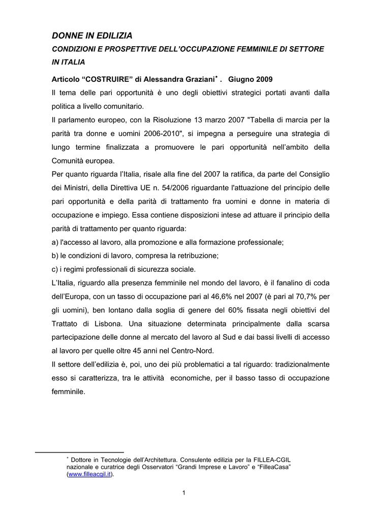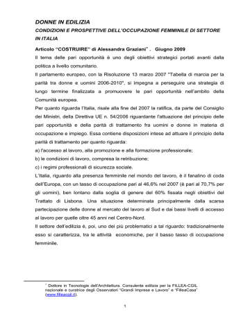 DONNE IN EDILIZIA CONDIZIONI E PROSPETTIVE DELL’OCCUPAZIONE FEMMINILE DI SETTORE IN ITALIA Articolo “COSTRUIRE” di Alessandra Graziani ∗ . Giugno 2009 Il tema delle pari opportunità è uno degli obiettivi strategici portati avanti dalla politica a livello comunitario. Il parlamento europeo, con la Risoluzione 13 marzo 2007 "Tabella di marcia per la parità tra donne e uomini 2006-2010", si impegna a perseguire una strategia di lungo termine finalizzata a promuovere le pari opportunità nell’ambito della Comunità europea. Per quanto riguarda l’Italia, risale alla fine del 2007 la ratifica, da parte del Consiglio dei Ministri, della Direttiva UE n. 54/2006 riguardante l'attuazione del principio delle pari opportunità e della parità di trattamento fra uomini e donne in materia di occupazione e impiego. Essa contiene disposizioni intese ad attuare il principio della parità di trattamento per quanto riguarda: a) l'accesso al lavoro, alla promozione e alla formazione professionale; b) le condizioni di lavoro, compresa la retribuzione; c) i regimi professionali di sicurezza sociale. L’Italia, riguardo alla presenza femminile nel mondo del lavoro, è il fanalino di coda dell’Europa, con un tasso di occupazione pari al 46,6% nel 2007 (è pari al 70,7% per gli uomini), ben lontano dalla soglia di genere del 60% fissata negli obiettivi del Trattato di Lisbona. Una situazione determinata principalmente dalla scarsa partecipazione delle donne al mercato del lavoro al Sud e dai bassi livelli di accesso al lavoro per quelle oltre 45 anni nel Centro-Nord. Il settore dell’edilizia è, poi, uno dei più problematici a tal riguardo: tradizionalmente esso si caratterizza, tra le attività economiche, per il basso tasso di occupazione femminile. ∗ Dottore in Tecnologie dell’Architettura. Consulente edilizia per la FILLEA-CGIL nazionale e curatrice degli Osservatori “Grandi Imprese e Lavoro” e “FilleaCasa” (www.filleacgil.it). 1 Quest’ultimo risulta, nelle costruzioni, notevolmente più basso rispetto agli altri settori industriali (5,3% degli occupati totali per le costruzioni nel 2007, contro il 21,6% dell’industria in senso stretto; cfr Fig. 1), a causa delle caratteristiche del processo produttivo: consistenza del lavoro manuale ed usurante, condizioni ambientali ed orari di lavoro difficilmente conciliabili con le esigenze della vita familiare. Fig. 1 Occupazione femminile nelle costruzioni, nell'industria e totali. Anni 2006-2007 (valori percentuali sul totale degli occupati dei relativi settori) 28,2 30,0 25,0 21,6 20,0 15,0 10,0 5,1 5,3 5,0 0,0 cos truzioni indus tria s .s . 2006 2007 Fonte: Istat, Rilevazione delle forze di lavoro Su questo fronte sono attive le politiche delle parti sociali, particolarmente dei sindacati di categoria, miranti a ridurre il divario con gli altri paesi europei, riequilibrando la rappresentanza femminile nel settore 1 . Una analisi della occupazione femminile in edilizia appare quanto mai opportuna, non soltanto a causa dell’attualità della problematica, ma anche perché stanno mutando, nel settore, alcune condizioni di assetto del sistema, ascrivibili sia a cause congiunturali che strutturali, che hanno diretti riflessi sull’occupazione. 1 A tal proposito si vedano i recenti documenti elaborati dalla Fillea-Cgil in occasione della Conferenza di Organizzazione di categoria, tenuta a Torino il 5 e 6 maggio 2008 (www.filleacgil.it, Rete Filleadonna). 2 Assistiamo infatti, ormai da quasi un decennio, ad un andamento positivo delle costruzioni (in controtendenza rispetto all’industria), che ha portato ad un costante incremento dell’occupazione nel settore, di cui ha beneficiato anche la quota femminile. Le donne in edilizia superano le 100.000 unità nell’ultimo quadriennio e si attestano, secondo i dati Istat 2007, a 103.316. L’andamento è tendenzialmente stabile, al contrario di quello del resto dell’industria, che vede una forte contrazione della quota di occupazione femminile dal 2007 al 2006 (vedi Fig. 1). Il lavoro dipendente prevale nettamente tra le donne, assorbendo quasi l’80% di tutta l’occupazione femminile, e tra le dipendenti la posizione professionale dominante è quella delle impiegate (cfr Fig. 2). Fig. 2 Occupazione femminile nelle costruzioni, dipendenti e indipendenti. Anni 2004-2007 (valori assoluti; migliaia di unità) 120,0 107,1 106,8 100,0 80,0 103,3 97,5 75,9 79,6 79,7 73,6 60,0 40,0 31,3 27,2 24,0 23,6 20,0 0,0 2004 2005 occcupati donne 2006 dipe nde nti 2007 indipe nde nti Fonte: Istat, Rilevazione delle forze di lavoro Tale caratteristica tende a consolidarsi nel medio lungo periodo, come conseguenza di un cambiamento strutturale che sta interessando il settore, soprattutto nel segmento delle imprese di maggiore dimensione: l’Italia, lentamente, tende ad allinearsi all’esempio delle grandi imprese europee di costruzione. In esse prevale la diversificazione delle attività e l’innovazione organizzativa e tecnica, condizioni che stanno mutando le caratteristiche dell’occupazione. La tradizionale prevalenza della componente operaia rispetto a quella impiegatizia sta perdendo consistenza, mentre cresce l’importanza e la quota (nei lavoratori dipendenti) dei tecnici e degli amministrativi. 3 La percentuale di operai sui dipendenti, nelle costruzioni, si aggira attualmente intorno all’80%, quella calcolata sulle prime 10 imprese nazionali di settore scende al 65%, quella delle prime 10 imprese europee arriva al 60% 2 . Un'altra considerazione interessante riguarda l’aumento, anche nelle costruzioni, del ricorso ai contratti atipici e a maggior flessibilità di orario, in cui la componente femminile risulta più forte. Nel complesso, mentre per gli uomini l’occupazione a tempo parziale appare marginale (3,5% del totale nel 2007 3 ), più di una donna su 3 fa ricorso a questa tipologia di orario (37,3%; vedi Fig. 3). Le rispettive percentuali scendono, seppure di poco, per i dipe