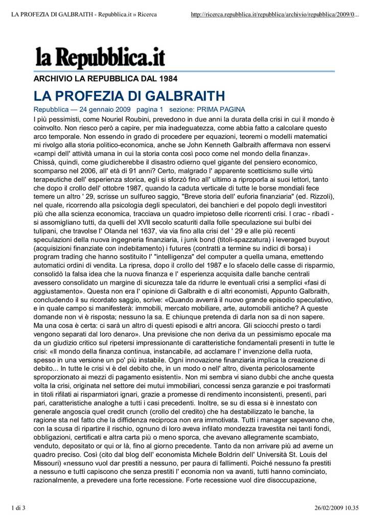 LA PROFEZIA DI GALBRAITH - Repubblica.it » Ricerca http://ricerca.repubblica.it/repubblica/archivio/repubblica/2009/0... ARCHIVIO LA REPUBBLICA DAL 1984 LA PROFEZIA DI GALBRAITH Repubblica — 24 gennaio 2009 pagina 1 sezione: PRIMA PAGINA I più pessimisti, come Nouriel Roubini, prevedono in due anni la durata della crisi in cui il mondo è coinvolto. Non riesco però a capire, per mia inadeguatezza, come abbia fatto a calcolare questo arco temporale. Non essendo in grado di procedere per equazioni, teoremi o modelli matematici mi rivolgo alla storia politico-economica, anche se John Kenneth Galbraith affermava non esservi «campi dell' attività umana in cui la storia conta così poco come nel mondo della finanza». Chissà, quindi, come giudicherebbe il disastro odierno quel gigante del pensiero economico, scomparso nel 2006, all' età di 91 anni? Certo, malgrado l' apparente scetticismo sulle virtù terapeutiche dell' esperienza storica, egli si sforzò fino all' ultimo a riproporla ai suoi lettori, tanto che dopo il crollo dell' ottobre 1987, quando la caduta verticale di tutte le borse mondiali fece temere un altro ' 29, scrisse un sulfureo saggio, "Breve storia dell' euforia finanziaria" (ed. Rizzoli), nel quale, ricorrendo alla psicologia degli speculatori, dei banchieri e del popolo degli investitori più che alla scienza economica, tracciava un quadro impietoso delle ricorrenti crisi. I crac - ribadì si assomigliano tutti, da quelli del XVII secolo scaturiti dalla folle speculazione sui bulbi dei tulipani, che travolse l' Olanda nel 1637, via via fino alla crisi del ' 29 e alle più recenti speculazioni della nuova ingegneria finanziaria, i junk bond (titoli-spazzatura) i leveraged buyout (acquisizioni finanziate con indebitamento) i futures (contratti a termine su indici di borsa) i program trading che hanno sostituito l' "intelligenza" del computer a quella umana, emettendo automatici ordini di vendita. La ripresa, dopo il crollo del 1987 e lo sfacelo delle casse di risparmio, consolidò la falsa idea che la nuova finanza e l' esperienza acquisita dalle banche centrali avessero consolidato un margine di sicurezza tale da ridurre le eventuali crisi a semplici «fasi di aggiustamento». Questa non era l' opinione di Galbraith e di altri economisti, Appunto Galbraith, concludendo il su ricordato saggio, scrive: «Quando avverrà il nuovo grande episodio speculativo, e in quale campo si manifesterà: immobili, mercato mobiliare, arte, automobili antiche? A queste domande non vi è risposta; nessuno la sa. E chiunque pretenda di darla non sa di non sapere. Ma una cosa è certa: ci sarà un altro di questi episodi e altri ancora. Gli sciocchi presto o tardi vengono separati dal loro denaro». Una previsione che non deriva da un pessimismo epocale ma da un giudizio critico sul ripetersi impressionante di caratteristiche fondamentali presenti in tutte le crisi: «Il mondo della finanza continua, instancabile, ad acclamare l' invenzione della ruota, spesso in una versione un po' più instabile. Ogni innovazione finanziaria implica la creazione di debito... In tutte le crisi vi è del debito che, in un modo o nell' altro, diventa pericolosamente sproporzionato ai mezzi di pagamento esistenti». Non mi sembra vi siano dubbi che anche questa volta la crisi, originata nel settore dei mutui immobiliari, concessi senza garanzie e poi trasformati in titoli rifilati ai risparmiatori ignari, grazie a promesse di rendimento inconsistenti, presenti, pari pari, caratteristiche analoghe a tutti i casi precedenti. Inoltre, se su di essa si è innestato con generale angoscia quel credit crunch (crollo del credito) che ha destabilizzato le banche, la ragione sta nel fatto che la diffidenza reciproca non era immotivata. Tutti i manager sapevano che, con la scusa di ripartire il rischio, ognuno di loro aveva infilato mondezza travestita nei tanti fondi, obbligazioni, certificati e altra carta più o meno sporca, che avevano allegramente scambiato, venduto, depositato or qui or là, fino al giorno precedente. Tanto da non arrivare più ad averne un quadro preciso. Così (cito dal blog dell' economista Michele Boldrin dell' Università St. Louis del Missouri) «nessuno vuol dar prestiti a nessuno, per paura di fallimenti. Poiché nessuno fa prestiti a nessuno e tutti capiscono che senza prestiti l' economia non va avanti, tutti hanno cominciato, razionalmente, a prevedere una forte recessione. Forte recessione vuol dire disoccupazione, 1 di 3 26/02/2009 10.35 LA PROFEZIA DI GALBRAITH - Repubblica.it » Ricerca http://ricerca.repubblica.it/repubblica/archivio/repubblica/2009/0... salari che si riducono, gente che non può più pagare i mutui, quindi più perdite per le banche, quindi meno credito, quindi più imprese che falliscono e più disoccupazione, eccetera... Questo spiega la caduta vertiginosa dei valori delle azioni di tutte le imprese, anche di quelle che con le banche, i mutui e l' edilizia non hanno niente a che fare... Un fatto reale relativamente piccolo (-500 miliardi in valori azionari) ed una serie di segnali credibili e pessimistici da parte delle autorità politiche e monetarie, hanno convinto tutti a gettare al vento le aspettative ottimistiche e ad assumere quelle super pessimistiche, portando l' economia su un nuovo sentiero di equilibrio, un sentiero da depressione». Mi permetto di suggerire qualche altra riflessione di carattere politico più generale sul perché questa volta abbia fatto presa la paura del ' 29 anche se i dati sono assai meno catastrofici di quelli della Grande depressione, quando il Dow Jones scese dell' 85% e la disoccupazione americana colpì il 25% della popolazione. Oggi la preoccupazione diffusa che la situazione sia andata fuori controllo e che nessuno sia in grado di proporre una ricetta di risanamento, genera il timore di un peggio, prossimo venturo, dove i risparmi accumulati rischiano di andar dispersi e le speranze delle nuove generazioni annullate p