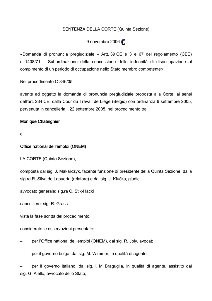 SENTENZA DELLA CORTE (Quinta Sezione) 9 novembre 2006 (*) «Domanda di pronuncia pregiudiziale – Artt. 39 CE e 3 e 67 del regolamento (CEE) n. 1408/71 – Subordinazione della concessione delle indennità di disoccupazione al compimento di un periodo di occupazione nello Stato membro competente» Nel procedimento C-346/05, avente ad oggetto la domanda di pronuncia pregiudiziale proposta alla Corte, ai sensi dell’art. 234 CE, dalla Cour du Travail de Liège (Belgio) con ordinanza 6 settembre 2005, pervenuta in cancelleria il 22 settembre 2005, nel procedimento tra Monique Chateignier e Office national de l’emploi (ONEM) LA CORTE (Quinta Sezione), composta dal sig. J. Makarczyk, facente funzione di presidente della Quinta Sezione, dalla sig.ra R. Silva de Lapuerta (relatore) e dal sig. J. Klučka, giudici, avvocato generale: sig.ra C. Stix-Hackl cancelliere: sig. R. Grass vista la fase scritta del procedimento, considerate le osservazioni presentate: – per l’Office national de l’emploi (ONEM), dal sig. R. Joly, avocat; – per il governo belga, dal sig. M. Wimmer, in qualità di agente; – per il governo italiano, dal sig. I. M. Braguglia, in qualità di agente, assistito dal sig. G. Aiello, avvocato dello Stato; – per la Commissione delle Comunità europee, dai sigg. V. Kreuschitz e J.-P. Keppenne, in qualità di agenti, vista la decisione, adottata dopo aver sentito l’avvocato generale, di giudicare la causa senza conclusioni, ha pronunciato la seguente Sentenza 1 La domanda di pronuncia pregiudiziale riguarda l’interpretazione dell’ art. 39, n. 2, CE e degli artt. 3, n. 1 e 67, nn. 2-3, regolamento (CEE) del Consiglio 14 giugno 1971, n. 1408/71, relativo all’applicazione dei regimi di sicurezza sociale ai lavoratori subordinati, ai lavoratori autonomi e ai loro familiari che si spostano all’interno della Comunità, così come modificato e aggiornato dal regolamento (CE) del Consiglio 2 dicembre 1996, n. 118/97, (GU 1997, L 28, pag. 1; in prosieguo: il «regolamento n. 1408/71»). 2 Tale domanda è stata presentata nell’ambito di una controversia fra la sig.ra Chateignier e l’Office national de l’emploi (Ufficio nazionale per l’impiego; in prosieguo: l’«ONEM») riguardante il rifiuto da parte di tale ente di concederle l’indennità di disoccupazione in quanto ella non aveva svolto almeno un giorno di lavoro in Belgio, dove l’interessata risiedeva alla data di deposito della domanda relativa all’indennità in questione. Contesto normativo normativo La normativa comunitaria 3 L’art. 3, n. 1, del regolamento n. 1408/71 prevede che: «Le persone che risiedono nel territorio di uno degli Stati membri ed alle quali sono applicabili le disposizioni del presente regolamento, sono soggette agli obblighi e sono ammesse al beneficio della legislazione di ciascuno Stato membro alle stesse condizioni dei cittadini di tale Stato, fatte salve le disposizioni particolari del presente regolamento». 4 Ai sensi dell’art. 67, nn. 2-3 del regolamento n. 1408/71: «2. L’istituzione competente di uno Stato membro la cui legislazione subordina l’acquisizione, il mantenimento o il recupero del diritto alle prestazioni al compimento di periodi di occupazione, tiene conto, nella misura necessaria, dei periodi di assicurazione o di occupazione compiuti in qualità di lavoratore subordinato sotto la legislazione di ogni altro Stato membro, come se si trattasse di periodi di occupazione compiuti sotto la legislazione ch’essa applica. 3. Salvo i casi previsti all’articolo 71, paragrafo 1, lettera a), punto ii) e lettera b), punto ii), l’applicazione delle disposizioni dei paragrafi 1 e 2 è subordinata alla condizione che l’interessato abbia compiuto da ultimo: – nel caso del paragrafo 1, periodi di assicurazione, – nel caso del paragrafo 2, periodi di [occupazione], secondo le disposizioni della legislazione a norma della quale vengono richieste le prestazioni». La normativa nazionale 5 La normativa nazionale in vigore alla data in cui l’ONEM ha rifiutato alla sig.ra Chateignier il godimento dell’indennità di disoccupazione era il regio decreto 25 novembre 1991, recante regolamentazione della disoccupazione (Moniteur Belge, del 31 dicembre 1991, pag. 29888, in prosieguo: il «regio decreto»). 6 L’art. 37, n. 2, del regio decreto è formulato come segue: «L’attività lavorativa prestata all’estero è presa in considerazione [ai fini dell’ammissione al godimento dell’indennità di disoccupazione] ove abbia avuto luogo nell’ambito di un impiego che in Belgio darebbe luogo a trattenute previdenziali, ivi comprese quelle per il settore disoccupazione». 7 L’art. 43, n. 1, terzo comma, del regio decreto stabilisce che: «Gli artt. 35, 36, 37, n 2 e 38, n. 2 si applicano soltanto nell’ambito di una convenzione internazionale. Tuttavia, gli artt. 35 e 36 si applicano altresì ai cittadini dei paesi elencati nella legge 13 dicembre 1976, recante approvazione degli accordi bilaterali relativi all’occupazione in Belgio di lavoratori stranieri». 8 La costituzionalità del detto art. 43 è stata contestata innanzi la Cour de cassation (Corte di cassazione belga), che, con sentenza 20 marzo 2002, ha dichiarato tale disposizione inapplicabile. Causa principale e questione pregiudiziale 9 La sig.ra Chateignier, cittadina francese, ha contratto matrimonio con un cittadino belga l’8 ottobre 1994, trasferendosi quindi in Belgio. 10 Il 17 ottobre 1994, la sig.ra Chateignier compilava una richiesta di concessione dell’indennità di disoccupazione, indicando di essere cittadina francese. Il giorno seguente, ella redigeva una seconda richiesta, questa volta segnalando di aver acquisito la cittadinanza belga in seguito al matrimonio. Tale ultima richiesta, con i relativi allegati, è stata inoltrata all’ufficio regionale competente il 9 dicembre 1994. L’ufficio in questione, con decisione 1º febbraio 1995, ha ammesso l’interessata al benefic