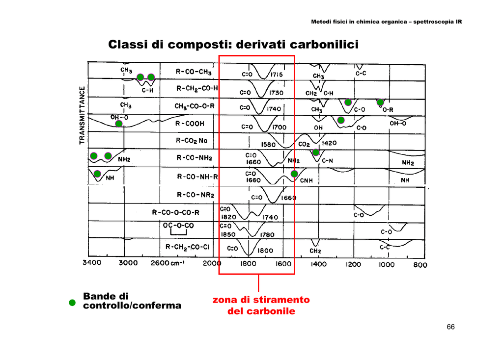 Metodi fisici in chimica organica – spettroscopia IR Classi di composti: derivati carbonilici Bande di controllo/conferma zona di stiramento del carbonile 66 Tabella sinottica della posizione della banda di stiramento del carbonile e della posizione delle bande di controllo Composto Alogenuro acilico (RCOX) C=O cm-1 Altre bande 1800 Anidride ciclica (RCOOCOR) >1800 – 1000-1100 C-O <1800 + Anidride aciclica (RCOOCOR’) >1800 + 1000-1100 C-O <1800 - Estere (RCOOR’) 1740 1000-1300 C-O (2 bande) Aldeide (RCOH) 1730 2750-2850 C-H (2 bande) Chetone (RCOR’) 1715 Acido carbossilico (RCOOH) 1700 3000 O-H molto larga 1000-1300 C-O (1 banda) Ammide primaria (RCONH2) 1680 3200, 3300 N-H (2 bande) 1450 C-N Ammide secondaria (RCONHR) 1680 3300 N-H (1 banda) 1550 C-N Ammide terziaria (RCONR2) 1660 Sale acido carbossilico (RCOONa) ©Paolo Scrimin – Università di Padova – vietata la riproduzione a fini commerciali 1580 1420 (sec. banda CO2) Metodi fisici in chimica organica – spettroscopia IR Fattori che influenzano la posizione della banda del carbonile 1. induttivi; 2. coniugativi; 3. legame ad idrogeno; 4. dimensione anello 1. +I O -I R Z +I: sposta la banda a valori più bassi - I: sposta la banda a valori più alti O 2. R OX R H OR O 3. R R' X+ sposta la banda a valori più bassi sposta la banda a valori più bassi 4. La posizione della banda si sposta a valori di numero d’onda più alti al diminuire della dimensione d’anello 68 Metodi fisici in chimica organica – spettroscopia IR Esempi di spettri di anidridi e di un cloruro acilico Zona della banda del carbonile: 2 bande nel caso di anidridi. La banda di sinistra è più intensa con anidridi acicliche, viceversa con anidridi cicliche stiramento C-O-C: una sola banda, anidridi simmetriche ©Paolo Scrimin – Università di Padova – vietata la riproduzione a fini commerciali Metodi fisici in chimica organica – spettroscopia IR Esempi di spettri di esteri C-O stiramento Zona del carbonile: la banda doppio legame è spostata a valori più bassi Stiramento del sistema per coniugazione con il C=O; C-O-C asimmetrico più alti per coniugazione con e simmetrico O in quanto il doppietto di edell’ossigeno è meno disponibile alla coniugazione con il C=O 70 Metodi fisici in chimica organica – spettroscopia IR Esempi di spettri di aldeidi zona del CO-H le due bande sono assenti! zona del C=O 71 ©Paolo Scrimin – Università di Padova – vietata la riproduzione a fini commerciali La ragione delle due bande di stiramento del CO-H delle aldeidi La sequenza di spettri teorici 1-7 fa vedere come variano le bande osservate (in bianco) in funzione della posizione relativa della banda fondamentale e di sovratono (in nero) mano a mano che sisposta la posizione della banda di sovratono (linea tratteggiata) 1 2 3 4 5 risonanza di Fermi 6 7 risonanza della banda di sovratono della fondamentale di piegamento con la fondamentale di stiramento del CO-H fondamentale di piegamento del CO-H 72 Metodi fisici in chimica organica – spettroscopia IR Esempi di spettri di chetoni; il ruolo della dimensione dell’anello Zona di stiramento del C=O: ruolo del legame ad H e della dimensione di anello; al diminuire della dimensione la posizione della banda si sposta a numeri d’onda più alti 73 ©Paolo Scrimin – Università di Padova – vietata la riproduzione a fini commerciali Metodi fisici in chimica organica – spettroscopia IR Esempi di spettri di acidi carbossilici e di un carbossilato stiramento O-H legato a legame ad H con il C=O stiramento del C-O zona di stiramento della banda del C=O; dipendenza da sostituenti -I seconda banda stiramento simmetrico COO74 ©Paolo Scrimin – Università di Padova – vietata la riproduzione a fini commerciali Metodi fisici in chimica organica – spettroscopia IR Esempi di spettri di ammidi stiramenti degli N-H: 2 bande se zona del C=O ammide primaria, 1 banda se ammide secondaria, 0 bande se ammide terziaria ammide “2° banda”: stiramento C-N 75 ©Paolo Scrimin – Università di Padova – vietata la riproduzione a fini commerciali Metodi fisici in chimica organica – spettroscopia IR Classi di composti: derivati con tripli legami e doppi legami cumulati zona 2100-2400 cm-1 Tripli legami: banda stretta; alchini poco intensa nitrili media intensità Doppi legami cumulati: banda intensa e larga (corrisponde allo stiramento asimmetrico del sistema X=C=Y) 76 ©Paolo Scrimin – Università di Padova – vietata la riproduzione a fini commerciali Metodi fisici in chimica organica – spettroscopia IR Esempi di spettri di alchini e di nitrili C-H dell’ alchino terminale Inattivo: la molecola è simmetrica e non varia il momento di dipolo nel corso della Zona del triplo legame vibrazione Notare la differenza di intensità tra la banda del C=C e quella del C=N 77 ©Paolo Scrimin – Università di Padova – vietata la riproduzione a fini commerciali Metodi fisici in chimica organica – spettroscopia IR Esempi di spettri di derivati con doppi legami cumulati Zona di stiramento asimmetrico del sistema X=C=Y Derivato aromatico monosostituito 78 ©Paolo Scrimin – Università di Padova – vietata la riproduzione a fini commerciali Metodi fisici in chimica organica – spettroscopia IR Classi di composti azotati: ammine, immine, nitroderivati ammine sali di ammonio immine nitroderivati Stiramento C-N: 1000-1300 cm-1 Stiramento N-H: (più debole di O-H!) ammine primarie 2 bande, 3300-3400 cm-1 ammine secondarie: 1 banda, ca. 3300 cm-1 Stiramento C=N Gruppo NO2: due bande a 1350 e 1550 cm-1 (stiramento asimmetrico e simmetrico ©Paolo Scrimin – Università di Padova – vietata la riproduzione a fini commerciali Gruppo NH3+ 79 Metodi fisici in chimica organica – spettroscopia IR Esempi di spettri di ammine, immine, nitroderivati Stiramento N-H Stiramento NO2 Stiramento asimmetrico Stiramento C-N C=N Stiramento NO2 simmetrico ©Paolo Scrimin – Università di Padova – vietata la riproduzione a fini c