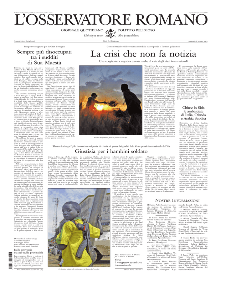 Spedizione in abbonamento postale Roma, conto corrente postale n. 649004 Copia € 1,00 Copia arretrata € 2,00 L’OSSERVATORE ROMANO POLITICO RELIGIOSO GIORNALE QUOTIDIANO Non praevalebunt Unicuique suum Anno CLII n. 64 (46.010) Città del Vaticano venerdì 16 marzo 2012 . Prospettive negative per la Gran Bretagna Come il tracollo dell’economia mondiale sta colpendo i Territori palestinesi Sempre più disoccupati tra i sudditi di Sua Maestà La crisi che non fa notizia LONDRA, 15. Guai in vista per i sudditi di Sua Maestà. Il tasso di disoccupazione è al livello più alto dal 1995 e anche le agenzie di rating cominciano a lanciare segnali negativi. Pur confermando ieri la tripla A sul debito sovrano della Gran Bretagna, Fitch ha infatti rivisto le prospettive, trasformando l’outlook da stabile a negativo. Segno che la crisi del debito in Europa sta iniziando a coinvolgere anche le economie considerate più sicure. «La conferma del rating AAA per la Gran Bretagna — spiega Fitch — riflette i progressi fatti nell’ambito della riduzione del deficit strutturale e degli sforzi per consolidare la credibilità delle finanze pubbliche». L’agenzia di rating sottolinea quindi i vantaggi che derivano da un’economia flessibile e da una situazione di stabilità politica e sociale. Nonostante questo — affermano ancora gli analisti di Fitch — l’ammontare del deficit di bilancio strutturale della Gran Bretagna resta secondo solo a quello degli Stati Uniti e il livello di indebitamento è significativamente sopra la media di un Paese con la tripla A. Per questo le prospettive sono state portate da stabili a negative. Anche perché ci sono sempre i rischi legati all’evolversi della crisi dell’Eurozona. La Grecia non è vicina, ma non è nemmeno lontanissima. Al problema dei conti si aggiunge poi una grave crisi del mercato del lavoro. Continua infatti a crescere il tasso di disoccupazione in Gran Bretagna che nell’ultimo trimestre del 2011 è salito dello 0,1 per cento all’8,4 della forza lavoro: si tratta del livello più alto dal 1995. I dati diffusi ieri dall’O ffice for National Statistics mostrano un aumento di 28.000 unità che porta a 2,67 milioni il numero di persone in cerca di occupazione alla fine del 2011. Nel caso occupazionale, va detto che la Gran Bretagna risente dello scenario globale, ed europeo in particolare. Al 10,7 per cento la disoccupazione dell’area euro è aumentata ai massimi da 15 anni a questa parte e rischia di «peggiorare ulteriormente nei trimestri a venire»: a lanciare l’allarme è la Banca centrale europea, che di recente ha rilevato come «le condizioni del mercato del lavoro si siano indebolite sulla scia del calo della crescita economica». Fra dicembre 2011 e gennaio 2012 il tasso di disoccupazione dell’eurozona è passato dal 10,6 al 10,7 per cento, superando l’ultimo massimo registrato nel secondo trimestre del 2010. Di fatto, un livello di disoccupazione come quello attuale non si registrava più dalla metà del 1997. Considerata la crescita sottotono dell’occupazione — ha aggiunto l’istituto di Francoforte — il tasso di disoccupazione dovrebbe rimanere elevato, se non addirittura aumentare nel breve periodo. Per migliorare la situazione complessiva il Governo britannico, che il prossimo 21 marzo presenterà la finanziaria, sta valutando l’ipotesi di emettere titoli di Stato a lungo termine (cento anni e più) per sfruttare i bassi tassi d’interesse di cui può godere al momento. Stando a quanto riporta la Bbc alcuni Una congiuntura negativa dovuta anche al calo degli aiuti internazionali funzionari del Tesoro avrebbero paragonato l’operazione all’accensione di un mutuo a tasso fisso. Nel caso in cui dovessero incontrare il favore degli investitori l’erario potrebbe risparmiare — dicono stime ufficiali — circa venti miliardi di sterline nell’arco dei prossimi cinque anni grazie ai minori tassi d’interesse. Ma l’appetito per questo tipo di maxi-bond è tutto da verificare. «Una maturazione di cento anni sarebbe troppo lunga per la maggior parte dei fondi pensione e noi crediamo che non sarebbero in molti ad acquistare questi titoli» ha commentato Joanne Segars, amministratore delegato della National Association of Pension Funds (Napf), ovvero l’associazione dei «clienti naturali» dei titoli di Stato britannici. «I fondi pensioni hanno un orizzonte di lungo termine ma non così tanto; quel che cercano sono titoli legati all’inflazione a trenta, quaranta e cinquant’anni e vorrebbero che il Governo emettesse una maggior quantità di questi bond». A ogni modo l’idea del prestito perpetuo non è del tutto nuova. Al momento, infatti, il Tesoro possiede nel suo portafoglio otto debiti di lungo termine il più anziano dei quali risale al 1853. In totale valgono due miliardi di sterline. L’ultimo bond perpetuo è stato emesso per pagare i costi della prima guerra mondiale. Raccolta del grano nei pressi di Jenin (LaPresse/Ap) Thomas Lubanga Dyilo riconosciuto colpevole di crimini di guerra dai giudici della Corte penale internazionale dell’Aia Giustizia per i bambini soldato L’AJA, 15. L’ex capo ribelle congolese Thomas Lubanga Dyilo, attivo tra il 2002 e il 2003 nel conflitto nell’Ituri, la provincia orientale della Repubblica democratica del Congo al confine con l’Uganda e il Rwanda, è stato riconosciuto all’unanimità colpevole di crimini di guerra dai giudici della prima Camera della Corte penale internazionale (Cpi) dell’Aia. Secondo i magistrati, Lobanga Dyilo avrebbe reclutato e impiegato nel conflitto minorenni al di sotto dei 15 anni. La sentenza completa sarà resa nota in un secondo tempo, così come la condanna inflit- ta a Lubamga Dyilo. «La Camera ha concluso all’unanimità che l’accusa ha dimostrato, al di là di ogni ragionevole dubbio, che Thomas Lubanga è colpevole di avere arruolato bambini di meno di 15 anni e di averli coinvolti in un conflitto a