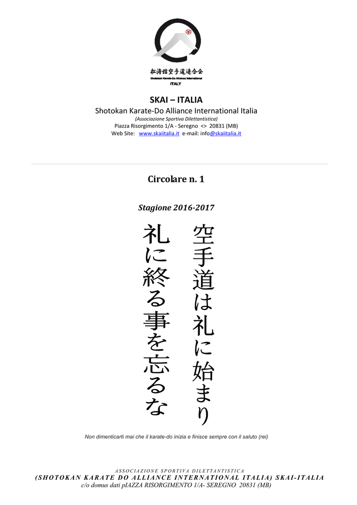 SKAI – ITALIA Shotokan Karate-Do Alliance International Italia (Associazione Sportiva Dilettantistica) Piazza Risorgimento 1/A - Seregno <> 20831 (MB) Web Site: www.skaiitalia.it e-mail: [email protected] Circolare n. 1 Stagione 2016-2017 Non dimenticarti mai che il karate-do inizia e finisce sempre con il saluto (rei) ASSOCIAZIONE SPORTIVA DILETTANTISTICA (SHOTOKAN KARATE DO ALLIANCE INTERNATIONAL ITALIA) SKAI-ITALIA c/o domus dati pIAZZA RISORGIMENTO 1/A- SEREGNO 20831 (MB) Lettera del presidente Cari Maestri e Presidenti Sta iniziando una nuova stagione, un nuovo anno sportivo. Con l’augurio che tutto possa andare per il meglio, la Skai Italia si è dotata di una struttura organizzativa che possa realmente rispondere alle esigenze di tutti. Come già ribadito più volte, la Skai Italia nasce come la rappresentanza nazionale della SKAI INTERNATIONAL del maestro Akita; io vi scrivo in qualità di Presidente nazionale e di Responsabile internazionale. La Skai Italia ha la sua identità, la sua sede, i suoi tecnici, i suoi maestri e le sue esigenze nazionali, territoriali e locali, che comunque dovranno, nei limiti del possibile, identificarsi con quelle di SKAI INTERNATIONAL. Innanzitutto, per la stagione che sta per cominciare, abbiamo organizzato dei raduni tecnici con lo scopo di ampliare non solo la conoscenza tecnica ma anche quella formativa, in modo tale da dare agli istruttori gli strumenti idonei per compiere il loro lavoro con gli allievi. Stiamo lavorando su eventi innovativi, tra cui il primo campionato SKAI fra nazioni, che presumibilmente si terrà alla fine del 2017 o al più nella primavera del 2018; abbiamo già il benestare del Maestro Akita ! Un altro evento che si vuole organizzare nel breve termine è una competizione SKAI a livello nazionale. Abbiamo appena finito di perfezionare gli accordi con quelle realtà che sono già all’interno della Skai Italia, ovvero Shotoreigikan e Uniaks; questa circolare è il veicolo divulgativo dei propri programmi per fare in modo che tutti possano sfruttare le opportunità che vengono offerte. Auguro a tutti un buon lavoro e vi esorto caldamente non solo a non mancare, ma a coinvolgere tutti quelli che avete vicino. In fondo il lavoro svolto fino a qui sta iniziando a dare i suoi frutti e non solo dobbiamo essere pronti a raccoglierli, ma occorre continuare a seminare per fare in modo che il domani sarà ancora più rigoglioso. Oss !! Antonio Circolare n. 1 Stagione 2016-17 Pagina 2 1. Corso istruttori, arbitri, maestri e aspiranti istruttori I corsi si terranno nelle seguenti date: 1. Sabato 1 e Domenica 2 ottobre 2016: Policastro Bussentino (SA) – Dettagli in Allegato 1 2. Sabato 5 e Domenica 6 novembre 2016: Giussano (MB) 3. Sabato 28 e Domenica 29 gennaio 2017: Sardegna (località da stabilire) 4. Sabato 4 e Domenica 5 marzo 2017: Frosinone (FR) Per tutti i corsi, il Sabato pomeriggio si terrà la lezione di pratica con il medico (materie: Pronto intervento. Traumatologia, Psicologia dell’insegnamento), docente: Dottor Cappiello. Nota: Si fa presente che è obbligatorio partecipare ad almeno DUE corsi istruttori nell’arco dell’intera stagione. Circolare n. 1 Stagione 2016-17 Pagina 3 2. Stage tecnico della SHOTOKAN ITALIA Lo stage tecnico si terrà ad Anagni, alla quale la Skai Italia parteciperà con docenti, atleti e sabato sera con una rappresentativa agonistica: • Sabato 22 e Domenica 23 ottobre 2016: Anagni (FR) Circolare n. 1 Stagione 2016-17 Pagina 4 3. Raduni agonisti I raduni si terranno nelle seguenti date: 1. Domenica 20 novembre 2016: Giussano (MB) 2. Domenica 12 febbraio 2017: Sardegna (località da stabilire) 3. Domenica 26 marzo 2017: Latina (LT) Circolare n. 1 Stagione 2016-17 Pagina 5 4. Stage con Akita Sensei Gli stage con sensei si terranno nelle seguenti date: 1. Sabato 10 e Domenica 11 dicembre 2016: Latina (LT) 2. Sabato 8 e Domenica 9 aprile 2017: Giussano (MB) Nota: Si fa presente che è obbligatorio partecipare ad almeno UNO stage nell’arco dell’intera stagione. Circolare n. 1 Stagione 2016-17 Pagina 6 A. Comunicazioni del Direttore Tecnico Carissimi Maestri, Istruttori, Arbitri e Allenatori. Siamo all’inizio di un nuovo anno sportivo colmo di novità entusiasmanti ma anche abbastanza impegnative. Tante occasioni, vecchie e nuove, ci confermano che il nostro lavoro è arrivato ad una svolta importante per tutti noi. La SKAI Italia e la SKAI International stanno crescendo, piano ma costantemente, ed il nostro impegno sarà sicuramente maggiore degli anni precedenti. Mi sento comunque in dovere di esprimere un mio pensiero, al di là della parte tecnica: In questi anni nella veste di direttore tecnico il mio obiettivo fondamentale costantemente mantenuto nel tempo è stato: “Crescere insieme”, a parole apparentemente semplice ma in realtà molto difficoltoso ed impegnativo da attuare concretamente. Nel tempo, ed oggi in particolare, anche alla luce di tutti gli avvenimenti e delle esperienze di questi ultimi anni, ho maturato l’importanza dell’obiettivo “crescere insieme” in “imparare a stare insieme”, solo così si può crescere come persone, dirigenti, tecnici e atleti; la funzione aggregativa di un gruppo sportivo è sempre fondamentale, ancor di più nel caso di un gruppo incentrato sui valori educativi di cui la nostra disciplina si fonda. Sta a noi tutti saper sfruttare l’occasione e, a tutti i livelli, saper superare eventuali contrasti, diversità di abitudini, malumori, torti subiti o “presunti”, per un’esperienza di convivenza vera, per saper condividere il cammino insieme, per la capacità di crescita di ognuno di noi, per imparare a vincere, ma soprattutto a perdere, per sapersi rialzare ed andare avanti, come tanti hanno dimostrato in un modo o nell’altro. Avremo cosi pienamente assolto il nostro compito principale: fare della nostra disciplina uno strumento di crescita individuale e collettiva nella condivisione, su questo si fonda la SKAI-Ital