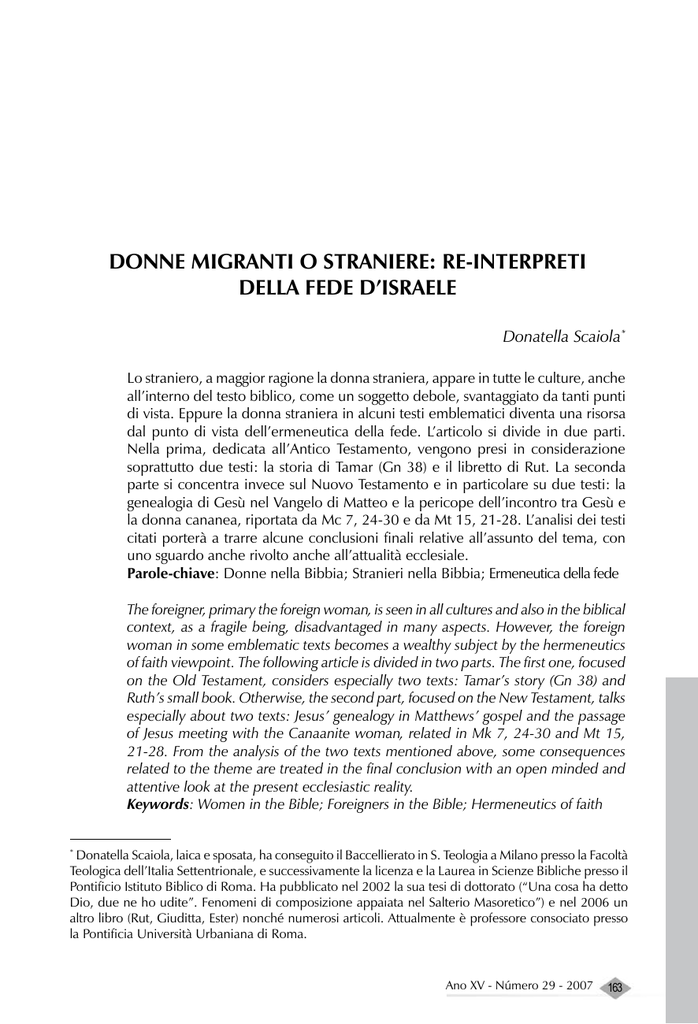 Donatella Scaiola DONNE MIGRANTI O STRANIERE: RE-INTERPRETI DELLA FEDE D’ISRAELE Donatella Scaiola* Lo straniero, a maggior ragione la donna straniera, appare in tutte le culture, anche all’interno del testo biblico, come un soggetto debole, svantaggiato da tanti punti di vista. Eppure la donna straniera in alcuni testi emblematici diventa una risorsa dal punto di vista dell’ermeneutica della fede. L’articolo si divide in due parti. Nella prima, dedicata all’Antico Testamento, vengono presi in considerazione soprattutto due testi: la storia di Tamar (Gn 38) e il libretto di Rut. La seconda parte si concentra invece sul Nuovo Testamento e in particolare su due testi: la genealogia di Gesù nel Vangelo di Matteo e la pericope dell’incontro tra Gesù e la donna cananea, riportata da Mc 7, 24-30 e da Mt 15, 21-28. L’analisi dei testi citati porterà a trarre alcune conclusioni finali relative all’assunto del tema, con uno sguardo anche rivolto anche all’attualità ecclesiale. Parole-chiave: Donne nella Bibbia; Stranieri nella Bibbia; Ermeneutica della fede The foreigner, primary the foreign woman, is seen in all cultures and also in the biblical context, as a fragile being, disadvantaged in many aspects. However, the foreign woman in some emblematic texts becomes a wealthy subject by the hermeneutics of faith viewpoint. The following article is divided in two parts. The first one, focused on the Old Testament, considers especially two texts: Tamar’s story (Gn 38) and Ruth’s small book. Otherwise, the second part, focused on the New Testament, talks especially about two texts: Jesus’ genealogy in Matthews’ gospel and the passage of Jesus meeting with the Canaanite woman, related in Mk 7, 24-30 and Mt 15, 21-28. From the analysis of the two texts mentioned above, some consequences related to the theme are treated in the final conclusion with an open minded and attentive look at the present ecclesiastic reality. Keywords: Women in the Bible; Foreigners in the Bible; Hermeneutics of faith * Donatella Scaiola, laica e sposata, ha conseguito il Baccellierato in S. Teologia a Milano presso la Facoltà Teologica dell’Italia Settentrionale, e successivamente la licenza e la Laurea in Scienze Bibliche presso il Pontificio Istituto Biblico di Roma. Ha pubblicato nel 2002 la sua tesi di dottorato (“Una cosa ha detto Dio, due ne ho udite”. Fenomeni di composizione appaiata nel Salterio Masoretico”) e nel 2006 un altro libro (Rut, Giuditta, Ester) nonché numerosi articoli. Attualmente è professore consociato presso la Pontificia Università Urbaniana di Roma. Ano XV - Número 29 - 2007 163 Donne migranti o straniere: Re-interpreti della fede d´Israele Introduzione Lo straniero, nella cultura antica e moderna, è un soggetto debole, che assomma in sé una serie di caratteristiche negative: egli è, per eccellenza, l’estraneo, che, in quanto tale, potrebbe diventare una minaccia, almeno nell’immaginario collettivo, di cui i mass media odierni si fanno cassa di risonanza. La sua estraneità deriva dalla lingua, dalla cultura, dalla religione, dal modo di mangiare e di vestirsi, ecc. Per questi motivi, spesso di natura emotiva, non frutto di vera riflessione, lo straniero è emarginato, “non è dei nostri”, quindi va ghettizzato, non gli vengono riconosciuti diritti, se non alcuni, ed egli è semplicemente tollerato, dal momento che, come avviene in Italia almeno, il suo lavoro è spesso necessario, quando non indispensabile, soprattutto in alcuni settori, come l’assistenza alle persone, la cura degli anziani, dei bambini, ecc. La Scrittura spesso propone alla riflessione del credente questo soggetto, invitando il popolo d’Israele non solo a tollerare lo straniero senza opprimerlo in maniera indebita, ma ordinandogli addirittura: “Amate lo straniero, perché anche voi foste forestieri nel paese d’Egitto” (Dt 10,19). Ci limitiamo solo a questo accenno, senza sviluppare ulteriormente il discorso, perché il nostro contributo verte su un altro aspetto del problema, come si evince dal titolo dell’articolo: la donna straniera, soggetto che permette a Israele di re-interpretare la sua fede. La tesi che intendiamo sviluppare può essere così espressa: nonostante la sua condizione a diversi livelli e per molte ragioni svantaggiata, la donna in quanto tale e quella straniera, nella fattispecie, si rivela, in alcuni testi, un soggetto interessante per Israele, dal momento che consente al popolo eletto di approfondire alcuni aspetti della sua fede peculiare. Non si tratta di inventare quello che non c’è, ma piuttosto di far emergere ciò che è già presente in forma incoativa e che viene alla luce grazie a quelle che si potrebbero definire delle contingenze storiche. Dato che, però, in ambito teologico si ripete frequentemente uno slogan, peraltro vero, che recita: “La rivelazione avviene nella storia”, quello che a noi può apparire contingenza storica, forse si può anche chiamare provvidenza. Prima parte: Antico Testamento 1. Il vocabolario: alcuni dati Può essere interessante ricordare che le radici ebraiche utilizzate per indicare lo straniero sono fondamentalmente tre.1 In primo luogo, possiamo ricordare il vocabolo Gçr che indica lo straniero residente2, noi oggi diremmo 164 REMHU – Revista Interdisciplinar da Mobilidade Humana Donatella Scaiola l’immigrato, che risiede in Israele senza godere tuttavia di tutti i diritti di un israelita. Anche i patriarchi, Abramo, Isacco, Giacobbe, e tutto il popolo di Israele in Egitto vissero in questa condizione. La legge di Israele (Es 22,20; Dt 10,18; 24,17-22; 27,19) prescriveva che essi dovevano essere rispettati, come altre categorie svantaggiate (l’orfano, la vedova). Il rispetto non era solo formale, ma si specificava in alcuni casi particolari: si chiedeva all’israelita, ad esempio, di non raccogliere tutto il frutto della mietitura , della vendemmia o della bacchiatura del proprio campo, ma 