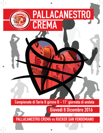 PALLACANESTRO CREMA Campionato di Serie B girone B - 11° giornata di andata Giovedì 8 Dicembre 2016 PALLACANESTRO CREMA vs RUCKER SAN VENDEMIANO PALLACANESTRO CREMA COACH: Massimiliano Baldiraghi Pasqualin #9 PLAY anno 1997 altezza 178 Del Sorbo #5 GUARDIA anno 1985 altezza 191 Tardito #7 ALA/CENTRO anno 1989 altezza 204 Manuelli #12 PLAY/GUARDIA anno 1994 altezza 188 Petronio #10 ALA anno1994 altezza 192 De Min #15 ALA anno1986 altezza 203 Liberati #3 PLAY/GUARDIA anno 1992 altezza 190 Bozzetto #16 CENTRO anno 1989 altezza 207 Nicoletti #0 GUARDIA anno 1996 altezza 188 Bovo #33 ALA anno 1997 altezza 198 RUCKER SAN VENDEMIANO COACH: Fabio Volpato Michelin #0 PLAY/GUARDIA Fazioli #4 PLAY Varaschin #5 ALA Rossetto #8 ALA Dal Pos #6 PLAY Carbon #18 GUARDIA Carlesso #9 CENTRO Antelli #10 PLAY Masocco #12 PLAY/GUARDIA Pin Dal Pos #14 GUARDIA/ALA Muner #15 ALA/CENTRO Locci #19 CENTRO LA GARA DI OGGI A distanza di tre giorni dl confronto con la capolista Bergamo che ha interrotto la striscia di cinque vittorie consecutive torna in campo la Pallacanestro Crema. Inedito avversario di giornata la Rucker di San Vendemiano. I concittadini di Alex Del Piero sono saliti in serie B a giugno vincendo contro Caorle la finale play off della C Gold veneta. Grande artefice della promozione è stato coach Fabio Volpato, una vera e propria istituzione nella pallacanestro veneta, che dal 2012 siede sulla panchina della Rucker. Per l’esordio in serie B la dirigenza ha deciso di confermare quattro atleti della scorsa stagione e di affidarsi a giovani talentuosi in rampa di lancio grazie alla collaborazione nata nel 2014 con il Treviso Basket. Dal club trevigiano militante in C Silver, sono arrivati il playmaker Filippo Fazioli, la guardia Cesare Barbon, l’ala Lorenzo Varaschin e il play Matteo Michelin, ma il vero gioiellino è il playmaker Michele Antelli, protagonista nell’Under 20 della Reyer Venezia che si sta mettendo in luce anche nella sua prima stagione in serie B con 9.6 punti di media. Antelli è il regista titolare di un quintetto che annovera anche quattro confermati: la guardia Andrea Masocco, le ali Francesco Pin Dal Pos ed Edoardo Rossetto e il pivot Andrea Carlesso, miglior marcatore (13 punti) e rimbalzista (4.4) della Rucker. Dalla panchina sono pronti ad entrare Andrea Muner, ultimamente spesso in quintetto titolare e pure lui lo scorso anno nel roster della promozione, e il romagnolo Andrea Locci, centro ex Cento (serie B) visto anche con la maglia di Ravenna. Un incontro da non sottovalutare per i leoni cremaschi, chiamati a mettere fieno in cascina sia a livello di punti che di fiducia in vista del difficile “derby” contro Orzinuovi. CLASSIFICA GIMAR Basket Lecco 14 Tramarossa Pall. Vicenza 8 Rekico Faenza 14 Hikkaduwa Milano 6 16 Pallacanestro Crema 14 Rucker Sanve San Vend. 6 16 Pallacanestro Aurora 8 Vivigas Alto Sebino 6 Agribertocchi Orzinuovi 16 Bmr 2000 Reggio Emilia 8 Accademia su Stentu Sestu 4 Baltur Cento 14 Broetto Virtus Padova 8 Argomm Basket Iseo 2 CO.MARK Bergamo Bakery Piacenza 11° GIORNATA -AURORA DESIO vs GIMAR LECCO -TRAMAROSSA PALL. VICENZA vs CO.MARK BERGAMO -BAKERY PIACENZA vs ARGOMM BASKET ISEO -REKICO FAENZA vs HIKKADUWA MILANO - VIVIGAS ALTO SEBINO vs BALTUR CENTO -BMR 2000 REGGIO EMILIA vs BROETTO VIRTUS PADOVA -AGRIBERTOCCHI ORZINUOVI vs ACCADEMIA SU STENTU SESTU -PALLACANESTRO CREMA vs RUCKER SANVE SAN VENDEMIANO PROSSIMO TURNO -ARGOMM BASKET ISEO vs BMR 2000 REGGIO EMILIA -BROETTO VIRTUS PADOVA vs VIVIGAS ALTO SEBINO -RUCKER SANVE SAN VENDEMIANO vs AURORA DESIO -BALTUR CENTO vs BAKERY PIACENZA - HIKKADUWA MILANO vs TRAMAROSSA PALL.VICENZA -ACCADEMIA SU STENTU SESTU vs GIMAR LECCO -PALLACANESTRO CREMA vs AGRIBERTOCCHI ORZINUOVI -CO.MARK BERGAMO vs REKICO FAENZA IL PUNTO SULLE GIOVANILI Il mondo del minibasket tra Crema e Castelleone.Prosegue il viaggio nel mondo del minibasket e del suo scopo ludico-sportivo e di crescita formativa dei bambini. Questa settimana vi vogliamo parlare di un uomo, un allenatore che ha fatto del minibasket la propria vita: Angelo Bocchiola, responsabile del Centro Minibasket Asd CMB Avis Castelleone che da settembre ha iniziato una bellissima collaborazione con la Pallacanestro Crema. Ciao Angelo. Allora, come sta andando il minibasket a Castelleone? Ciao a tutti! Il minibasket qui a Castelleone sta andando molto bene e dire che sono soddisfatto è dire poco. I ragazzi si impegnano moltissimo ed i risultati si vedono. Da settembre avete iniziato a collaborare con il settore minibasket e giovanile della Pallacanestro Crema ed ora i vostri allenamenti si dividono sulle palestre di Crema, Offanengo e Castelleone. Come sta andando questa bella collaborazione? La collaborazione tra le due società va benissimo. L’interesse reciproco era di far conoscere il settore giovanile e ci stiamo dando dentro alla grande con risultati più che ottimi. Quest’anno tu ed il minibasket di Castelleone avete spento insieme le prime 35 candeline di vita professionale. Vuoi parlarcene? Il minibasket a Castelleone è nato 35 anni fa, nel 1981 ed a giugno di quest’anno abbiamo festeggiato l’anniversario ed i miei 35 anni di istruttore. Ho iniziato con l’atletica ed i giochi della gioventù, vincendo il campionato provinciale, regionale e piazzandomi al 5° posto assoluto ai campionati nazionali. Terminata l’avventura nell’atletica sono passato al rugby, a Crema. 14 anni e fino a 2 anni fa con esperienza come vice allenatore in serie A femminile. Nel contempo ero impegnato nel mondo della pallacanestro. CSI e federazione. A 18 anni ho conseguito la tessera di istruttore. Fino ad oggi. Sono stati anni bellissimi, con molte soddisfazioni in campo e fuori. Dal mio centro sono usciti molti ragazzi che tutt’ora giocano in serie di tutto rispetto. Grazie e buon lavoro! Grafica, stampa, pubblicità. Via Bodesine, 37A-Castelleone (CR) 0374 58243 www.grafeuropa.com [email protected]