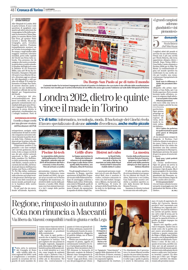 T1 CV PR T2 48 .Cronaca di Torino STAMPA .LA MERCOLEDÌ 1 AGOSTO 2012 «I grandi campioni adorano gianduiotti e vini piemontesi» SILVIA GARBARINO LETIZIA TORTELLO Alle Olimpiadi di Londra 2012 si parla torinese. E non è solo questione di spogliatoi: sono quattro gli atleti autoctoni che compongono le fila della nazionale (la nuotatrice Chiara Boggiatto, la canoista Maria Clara Giai Pron, gli sprinter Fabio Cerutti e Davide Manenti). L’orgoglio, però, travalica l’aspetto sportivo. Possiamo tranquillamente montarci un po’ la testa: la tecnologia a bordo campo, o negli studios delle maggiori emittenti televisive mondiali, porta nella capitale dei Giochi una firma tutta sabauda. Una presenza che dà ossigeno alla nostra economia, in particolare a realtà aziendali cittadine dell’high tech come la Deltatre di via Francesco Millio, nata nell’ 86 da due informatici, Giampiero Rinaudo (53 anni) e Luca Marini (58 anni) e diventata oggi un colosso da 400 dipendenti e utili per oltre 40 milioni. È il centro informatico di Borgo San Paolo, di recente sbarcato anche a Londra con uno stabilimento, il fornitore ufficiale dei servizi digitali per l’organizzazione dei Giochi. A cominciare dal sito, www.london2012.com. Sembrerà incredibile, ma ad aggiornarlo costantemente con i risultati delle gare sono 50 tecnici e ingegneri da Torino, che seguono in presa diretta le operazioni, coordinandosi con i colleghi londinesi. Forti di ESPERIENZA ED ESTRO Esordio a cinque cerchi per una giovane creatura dell’Incubatore del Poli un’esperienza navigata nella realizzazione di tutte le scritte che compaiono sul nostro televisore durante le partite di calcio della Uefa, i Deltatre sono sbarcati per la prima volta alle Olimpiadi nel 2008 a Pechino. L’esperienza positiva li ha premiati e ora sono moltiplicati i servizi: gestiscono, tra il resto, il sito a cinque cerchi di uno dei più celebri network americani, la Nbc, e quello della canadese Ctv. Nell’elenco delle partnership commerciali illustri, vantano anche la curatela del sito Bbc, del broadcast più famoso dell’America Latina, cioè Terra, e di France Tv. Per Sky, infine, realizzano le scritte in sovrimpressione sullo schermo sui tempi tecnici dei giocatori. Dal borgo operaio si sono fatti conoscere in mezzo mondo, portando in giro la bandiera della nostra tecnologia. Un po’ quel che sta succedendo all’azienda Aqvatech, 5 Da Borgo San Paolo ai pc di tutto il mondo L’azienda leader fra le torinesi impegnate ai Giochi di Londra è la Deltatre che cura tutto il sito ufficiale della manifestazione Un incarico non insolito per il centro informatico di via Millio che aveva già curato l’edizione sul web delle Olimpiadi di Pechino Londra 2012, dietro le quinte vince il made in Torino C’è di tutto: informatica, tecnologia, moda. Il backstage dei Giochi rivela il lavoro specializzato di alcune aziende d’eccellenza, anche molto piccole atta salva la sentenza del Consiglio di Stato sulla validità delle elezioni regionali del 2010, i nodi si scioglieranno a novembre, quando in occasione del traguardo di metà mandato do- F Quali sono le differenze rispetto alle precedenti Olimpiadi? «Rispetto alla prima esperienza a Casa Italia, qui è un livello superiore. Però, avendo lavorato molto all’estero, conosco le esigenze degli atleti». E nei suoi piatti ci sono molte influenze piemontesi? «Un tocco della mia terra lo metto sempre, perché ha una ricchezza particolare. Ogni giorno, propongo un menù di una regione diversa, sfruttando la varietà culinaria italiana». Chi è l’atleta che preferisce tra quelli incontrati in questi primi giorni di Olimpiade londinese? Piscine hi-tech Griffe d’oro Bistrot nel cubo La mostra La segnaletica delle piscine della pallanuoto è firmata Aqvatech, azienda nata nel 2010 all’Incubatore del Poli e cresciuta a vista d’occhio, fino ad arrivare a Londra La Kappa sponsorizza la Nazionale italiana di scherma e di canottaggio. Il loro logo è sulle divise come quella della fiorettista, oro olimpico, Elisa Di Francisca La Nussli Italia, multinazionale di allestimenti con sede a Torino, ha montato sul tetto della Royal Festival Hall il ristorante mobile detto il «cubo» Curata dalla professoressa torinese Renata Freccero, propone a Casa Italia 27 artisti uniti dalla passione olimpica (in foto opera di Stefano Nicolini) giovanissima creatura dell’Incubatore del Politecnico (sono stati fondati nel 2010), che grazie ad un accordo con le Piscine Castiglione del mantovano, costruttrici delle vasche della pallanuoto a Londra 2012, illuminano con i loro sistemi innovativi a led i campi delle partite olimpiche. Tra gli orgogli torinesi c’è, ovviamente, la Kappa, marchio sportswear di BasicNet. È sponsor tecnico delle Federazioni italiane di canottaggio, scherma e Fijlkam (judo, lotta). D’altronde, sono state le Olimpiadi, quelle di Los Angeles 1984, a rendere famoso il brand, che sponsorizzò la squadra di atletica degli Usa. I gourmand potranno respirare aria di casa alla Royal Festival Hall, dove è montato il «cubo», esclusivo ristorante in vetro con chef stellati. Inaugurato a Milano, sta facendo il giro dell’Europa. Si tratta di un’opera della Nussli Italia, che ha sede in via Quittengo, zona corso Novara. E infine la cultura sportiva, di cui in pochissimi si occupano. Da tre edizioni dei Giochi, Pechino, Vancouver e ora Londra, Casa Italia ospita mostre artistiche a carattere sportivo curate dalla docente del Suism Renata Freccero. Insomma, la vittoria i torinesi la cercano non solo nelle gare. Via libera da Maroni: compatibili i ruoli in giunta e nella Lega ALESSANDRO MONDO Nicola Batavia chef Nike House I migliori atleti del mondo si servono da uno chef torinese. Ormai non è più una novità per Nicola Batavia, alla terza apparizione olimpica dietro i fornelli. Dopo Torino 2006 a Casa Italia, è stato chiamato a Pechino 2008 per la Nike Vip House. La multinazionale regina nel mondo s