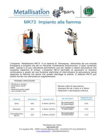 MK73 Impianto alla fiamma L’impianto Metallisation MK73 è un sistema di flamespray alimentato da una miscela d’ossigeno e propano che da un rilevante rivestimento anticorrosivo. Il peso contenuto della pistola e la sua robustezza permettono una più rapida e veloce spruzzatura che consente risparmio di tempo. L’impianto MK73 permette di spruzzare in maniera continuativa e grazie ad una funzione start/stop di interrompere la spruzzatura senza spegnere la fiamma ma senza che questo danneggi la pistola. Il sistema MK73 può essere fornito con attrezzatura supplementare. POSSIBILI APPLICAZIONI - Strutture in acciaio - Costruzioni navali - Ponti - Recinzioni,porte,mobili - Carri armati e navi - Elevato indice di spruzzatura - Diametro filo da 1.6mm a 4.76mm - Stop/start o spruzzatura continua Sp max/ kg/H Copertura max m2/Kg/100um 50 /continuato) 32 (start/stop)) 0.91 Materiali Riferimenti Diametro filo Zinco 02E 4.76mm (3/16’’) Alluminio 01E 4.76mm (3/16") 12.5 (continuato) 8 (start/stop) 3.57 Zinco/Alluminio 85/15 21E 4.76mm (3/16") 39 (continuato) 25 (start/stop) 1.11 Distributore per l’Italia: Intermetal Srl Via Aquileia 45H – 20092 Cinisello Balsamo (Mi) - Tel.02/6411471-Fax 02/6430114 www.intermetal.it – [email protected]