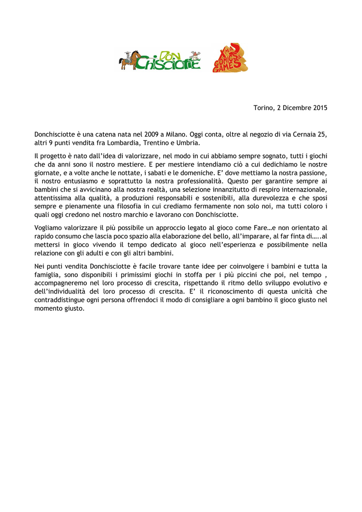 Torino, 2 Dicembre 2015 Donchisciotte è una catena nata nel 2009 a Milano. Oggi conta, oltre al negozio di via Cernaia 25, altri 9 punti vendita fra Lombardia, Trentino e Umbria. Il progetto è nato dall’idea di valorizzare, nel modo in cui abbiamo sempre sognato, tutti i giochi che da anni sono il nostro mestiere. E per mestiere intendiamo ciò a cui dedichiamo le nostre giornate, e a volte anche le nottate, i sabati e le domeniche. E’ dove mettiamo la nostra passione, il nostro entusiasmo e soprattutto la nostra professionalità. Questo per garantire sempre ai bambini che si avvicinano alla nostra realtà, una selezione innanzitutto di respiro internazionale, attentissima alla qualità, a produzioni responsabili e sostenibili, alla durevolezza e che sposi sempre e pienamente una filosofia in cui crediamo fermamente non solo noi, ma tutti coloro i quali oggi credono nel nostro marchio e lavorano con Donchisciotte. Vogliamo valorizzare il più possibile un approccio legato al gioco come Fare…e non orientato al rapido consumo che lascia poco spazio alla elaborazione del bello, all’imparare, al far finta di…..al mettersi in gioco vivendo il tempo dedicato al gioco nell’esperienza e possibilmente nella relazione con gli adulti e con gli altri bambini. Nei punti vendita Donchisciotte è facile trovare tante idee per coinvolgere i bambini e tutta la famiglia, sono disponibili i primissimi giochi in stoffa per i più piccini che poi, nel tempo , accompagneremo nel loro processo di crescita, rispettando il ritmo dello sviluppo evolutivo e dell’individualità del loro processo di crescita. E’ il riconoscimento di questa unicità che contraddistingue ogni persona offrendoci il modo di consigliare a ogni bambino il gioco giusto nel momento giusto. Proprio da questo presupposto nasce anche il progetto Toys for School, Toys for School™ è un servizio fornito ai clienti che prestano particolare attenzione all’educazione e alla formazione dei propri bambini. Una selezione specifica di prodotti che, attraverso il divertimento, permette di sviluppare i sensi, esercitare parti del corpo e stimolare l’attenzione. Questi prodotti sono adatti a TUTTI i bambini per accrescere le loro capacità personali, ma risultano particolarmente utili per bambini con dei problemi dell’apprendimento o con specifiche difficoltà. Attraverso la relazione fra adulto e bambino che giocano insieme, l’apprendimento è più facile e più immediato, poiché più divertente per il bambino. La selezione di prodotti effettuata attraverso il catalogo Toys for School è divisa per tipologia di apprendimento e con indicazione delle proprietà educative. Nei punti vendita Donchisciotte è possibile trovare degli operatori formati ad hoc per un confronto o per un consiglio «pensato» per aiutare nella scelta ed introdurre ad ulteriori prodotti studiati per stimolare nel dettaglio specifiche competenze cognitive. Il presupposto teorico alla base del progetto TFS e la sua suddivisione in aree di competenze, si rifà alla teoria delle intelligenze multiple di di H. Gardner secondo il quale un’intelligenza è una potenzialità biologica e psicologica che può realizzarsi di più o di meno a seconda dei fattori esperienziali, culturali e motivazionali che influiscono su una persona. Le 9 intelligenze mappate da Gardner rappresentano i rami principali di un albero vivo e dinamico, e che tende a svilupparsi in maniera unica, è su questa struttura, grazie all’interazione con l’ambiente circostante, che si andrà a sviluppare in maniera individuale e irripetibile, una combinazione di talenti e di competenze cognitive che potremo andare ad esercitare e a stimolare in diversissimi modi. GIOCARE e IMITARE sono il primo nutrimento per l’albero che sta prendendo forma. La selezione che abbiamo realizzato ha l’obiettivo di nutrire questo albero nella maniera più divertente, più colorata e più naturale possibile, convinti che solo nel rispetto dell’individualità e nella consapevolezza della natura del nostro intelletto, possa crescere un albero bello e ricco perché armonioso. Donchisciotte presenta in occasione del Torino Christmas Comics & Games: Uno stand con una piccola rappresentazione dell’assortimento del Punto vendita Quattro laboratori in due fasce di orario giornaliere per il sabato e la domenica. Il mago OID MAGIC che ci divertirà con trucchi di magia e giocoleria Donchisciotte e Novapediatrica La collaborazione con Novapediatrica è iniziata quasi per caso…ma soprattutto per un entusiasmo che ha viralmente colpito tutti i protagonisti di questo incontro e che ha visto germogliare i primi semi di un eclettico, giocoso e concreto connubio. Attraverso quattro laboratori andremo a fondere l’esperienza e la professionalità dei conduttori con lo spirito e i giochi di Donchisciotte e della selezione Toys For School. Si stimoleranno i bambini a confrontarsi con le loro competenze relativamente al linguaggio e alla fantasia, alla gestione dello spazio e alla capacità di vedere oltre gli schemi, e infine a testare la loro dimestichezza con numeri e velocità. Attraverso il laboratorio dei Mangiapaure avremo l’opportunità di parlare insieme delle paure che ricorrono maggiormente nei nostri pensieri e invadono a volte anche i nostri sogni. E’ così che pensiamo di coinvolgere i bambini in un modo nuovo e di sperimentare la loro voglia di mettersi in gioco insieme a noi e ai loro genitori. LABORATORIO LINGUISTICO – LANCIA LA STORIA ! FASCIA DI ETA’ 4-6 ANNI HABA DADI CONTASTORIE Conduce la Dr.ssa Fiore. Sabato dalle 16.00 alle 16,45 Domenica dalle 15,30 alle 16,45 Ogni bambino lanciando i dadi viene aiutato a creare una storia al termine della quale verrà rilasciato un Diploma di Cantastorie . Tempo previsto: 30 min. LABORATORIO VISUO SPAZIALE – TROVA LA FORMA FASCIA DI ETA’ 5-7 ANNI Conduce la Dr.ssa Fiore Sabato dalle 16,45 alle 17,30 Domenica dalle 16,45 alle 17,30 Il bambino viene ai