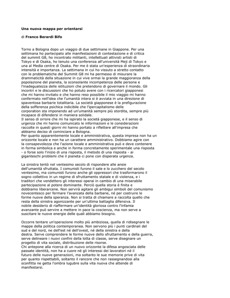 Una nuova mappa per orientarsi di Franco Berardi Bifo Torno a Bologna dopo un viaggio di due settimane in Giappone. Per una settimana ho partecipato alle manifestazioni di contestazione e di critica del summit G8, ho incontrato militanti, intellettuali attivisti artisti di Tokyo e di Osaka, ho tenuto una conferenza all'università Meji di Tokyo e una al Media centre di Osaka. Per me è stata un'esperienza di straordinaria intensità e importanza. La settimana in cui ho vissuto a stretto contatto con le problematiche del Summit G8 mi ha permesso di misurare la drammaticità della situazione in cui vive ormai la grande maggioranza della popolazione del pianeta, la sconsolante incompetenza delle persone e l'inadeguatezza delle istituzioni che pretendono di governare il mondo. Gli incontri e le discussioni che ho potuto avere con i ricercatori giapponesi che mi hanno invitato e che hanno reso possibile il mio viaggio mi hanno confermato nell'idea che l'umanità intera si è avviata in una direzione di spaventosa barbarie totalitaria. La società giapponese è la prefigurazione della sofferenza psichica indicibile che l'ipercapitalismo delle corporation sta imponendo ad un'umanità sempre più stordita, sempre più incapace di difendersi in maniera solidale. Il senso di orrore che mi ha ispirato la società giapponese, e il senso di urgenza che mi hanno comunicato le informazioni e le considerazioni raccolte in questi giorni mi hanno portato a riflettere all'impresa che abbiamo deciso di cominciare a Bologna. Per quanto apparentemente locale e amministrativa, questa impresa non ha un orizzonte locale e non ha un carattere amministrativo. Dobbiamo agire con la consapevolezza che l'azione locale e amministrativa può e deve contenere in forma simbolica e anche in forma concretamente sperimentale una risposta - o forse solo l'inizio di una risposta, il metodo di una risposta - ai giganteschi problemi che il pianeta ci pone con disperata urgenza. La sinistra tentò nel ventesimo secolo di rispondere alle ansie dell'umanità sfruttata. I comunisti furono il sale e lo zucchero del secolo ventesimo, ma comunisti furono anche gli oppressori che trasformarono il sogno collettivo in un regime di sfruttamento statale e di violenza, e i traditori che vendettero gli interessi operai in cambio di una miserabile partecipazione al potere dominante. Perciò quella storia è finita e dobbiamo liberarcene. Non servirà agitare gli ambigui simboli del comunismo novecentesco per fermare l'avanzata della barbarie, né per costruire le forme nuove della speranza. Non si tratta di chiamare a raccolta quello che resta della sinistra agonizzante per un'ultima battaglia difensiva. Il nobile desiderio di riaffermare un'identità gloriosa contro l'infamia avanzante può servire a mettere in pace la coscienza, ma non serve a suscitare le nuove energie delle quali abbiamo bisogno. Occorre tentare un'operazione molto più ambiziosa, quella di ridisegnare le mappe della politica contemporanea. Non servono più i punti cardinali del sud e del nord, ne dell'est né dell'ovest, né della sinistra e della destra. Serve comprendere le forme nuove dello sfruttamento e della guerra, serve delineare i nuovi confini della lotta di classe, serve disegnare un progetto di vita sociale, distribuzione delle risorse. Chi antepone alla ricerca di un nuovo orizzonte la difesa angosciata delle passate identità, non ha a cuore né gli interessi dei lavoratori né il futuro delle nuove generazioni, ma soltanto le sue memorie prive di vita per quanto rispettabili, soltanto il rancore che non rassegnandosi alla sconfitta ne getta l'ombra lugubre sulla vita nuova che attende di manifestarsi. La sconfitta della sinistra alle elezioni italiane, ma anche alle elezioni francesi dell'anno scorso, e a quelle inglesi degli ultimi mesi non è il segno di un temporaneo offuscarsi del sol dell'avvenire che presto o tardi tornerà a risplendere. Mai più risplenderà quel sol dell'avvenire, ma la lotta tra la classe del lavoro e la classe del profitto non per questo è finita, la violenza e la guerra e l'oppressione non per questo hanno smesso di devastare la vita di milioni di uomini e donne. Da qui noi dobbiamo ripartire, perché essere comunisti non significa difendere la propria identità meschina ma aprire gli occhi a ciò che è inevitabile, e scoprire ciò ch'è possibile esercitando l'intelligenza senza alcun pregiudizio. Proponendo a Bologna la costituzione di una lista cittadina non perseguiamo la prospettiva di ottenere una piccola affermazione elettorale di minoranza che restituisca credibilità alle nostre agonizzanti illusioni, o quella di ricostruire una rispettabile rappresentanza di minoranza e di opposizione. Ci proponiamo di sconvolgere l'ordine politico di questa città per aprire l'intero spettro delle questioni sociali e culturali del nostro tempo. Ci proponiamo di condurre una campagna per la conquista della maggioranza alle elezioni della primavera 2009. Ci proponiamo di ottenere una maggioranza dei voti che ci consenta di iniziare un esperimento di amministrazione innovativa, rispettosa degli interessi della maggioranza della società cittadina, attenta soprattutto ai bisogni degli esclusi dei precari e degli sfruttati, ed al contempo gravida di un contenuto di esemplarità e di forza simbolica. Il compito che ci prefiggiamo è quello di dare alla città di Bologna un governo che stia dalla parte dei deboli, ma apra al contempo la strada ad un'innovazione produttiva adeguata alle esigenze e alle possibilità di una società postindustriale ad alto potenziale cognitivo. E al tempo stesso il compito che ci prefiggiamo è quello di dare corpo alla nuova speranza. Occorrerà confrontarsi con il Partito democratico senza soggezione. Quel partito è la sintesi di tutto quel che di vecchio persiste nella società italiana,. E' il partito del cinismo e dell'autodisprezzo, un ceto politico che fu al servizio dell'oppressione stalinista e del