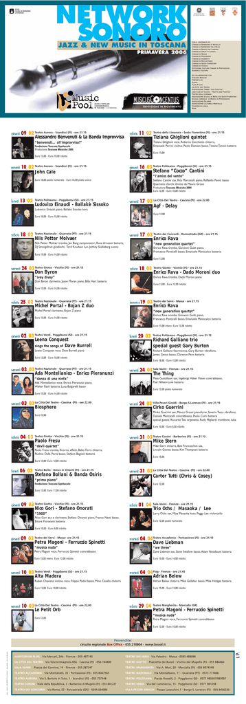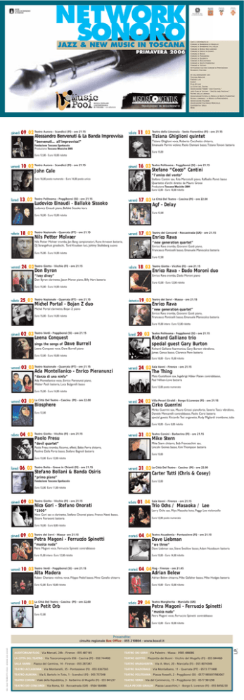 NETWORK SONORO Provincia di Firenze Ministero per i Beni e le Attività Culturali Con il contributo di: Comune di Barberino di Mugello Comune di Barberino Val d'Elsa Comune di Borgo San Lorenzo Comune di Greve in Chianti Comune di Massa Comune di Poggibonsi Comune di Quarrata Comune di Roccastrada Comune di Sesto Fiorentino Comune di Vicchio Istituzione Cultura Comune di Pontassieve Scandicci Cultura JAZZ & NEW MUSIC IN TOSCANA PRIMAVERA 2006 MUSICA POPOLARE CONTEMPORANEA IN TOSCANA - XXII edizione giovedì 09_02 Teatro Aurora - Scandicci (FI) - ore 21.15 Alessandro Benvenuti & La Banda Improvvisa In collaborazione con: Toscana Musiche Firenze Live Eventi Flog W Live La Citta' del Teatro Associazione Timbre “Jazz Cocktail” Jazz Club of Vicchio - “Giotto Jazz Festival” Teatro della Limonaia Associazione Scuola di Musica di Sesto Fiorentino Scuola comunale di Musica di Pontassieve Associazione Palomar Associazione Culturale Marcialla Cooperativa Unica Wide TRADIZIONE IN MOVIMENTO TRADIZIONE IN MOVIMENTO sabato 11_03 Comune di Firenze Teatro della Limonaia - Sesto Fiorentino (FI) - ore 21.15 Tiziana Ghiglioni quintet Tiziana Ghiglioni voce, Roberto Cecchetto chitarra, Emanuele Parrini violino, Paolo Damiani basso,Tiziano Tononi batteria “benvenuti… all'improvvisa!” Fondazione Toscana Spettacolo Produzione Toscana Musiche 2005 Euro 15,00 Euro 12,00 - Euro 10,00 ridotto giovedì 16_03 Teatro Politeama - Poggibonsi (SI) - ore 21.15 venerdì 10_02 Teatro Aurora - Scandicci (FI) - ore 21.15 Stefano “Cocco” Cantini John Cale “l’amico del vento” Euro 18,00 posto numerato - Euro 14,00 posto unico Stefano Cantini sax, Rita Marcotulli piano, Raffaello Pareti basso Quartetto d'archi diretto da Mauro Grossi Produzione Toscana Musiche 2004 Euro 12,00 - Euro 10,00 ridotto lunedì 13_02 venerdì 17_03 La Città Del Teatro - Cascina (PI) - ore 22.00 Teatro Politeama - Poggibonsi (SI) - ore 21.15 Ludovico Einaudi - Ballakè Sissoko Agf - Delay Ludovico Einaudi piano, Ballakè Sissoko kora Euro 12,00 Euro 18,00 - Euro 15,00 ridotto sabato 18_02 venerdì 17_03 Teatro dei Concordi - Roccastrada (GR) - ore 21.15 Teatro Nazionale - Quarrata (PT) - ore 21.15 Nils Petter Molvaer Enrico Rava Nils Petter Molvær tromba, Jan Bang campionatori, Rune Arnesen batteria, DJ Strangefruit giradischi, Tord Knudsen luci, Johhny Skalleberg suono “new generation quartet” Enrico Rava tromba, Giovanni Guidi piano, Francesco Ponticelli basso, Emanuele Maniscalco batteria Euro 15,00 - Euro 14,00 ridotto Euro 12,00 venerdì 24_02 Teatro Giotto - Vicchio (FI) - ore 21.15 sabato 18_03 Don Byron “ivey divey” Teatro Giotto - Vicchio (FI) - ore 21.15 Enrico Rava - Dado Moroni duo Enrico Rava tromba, Dado Moroni piano Don Byron clarinetto, Jason Moran piano, Billy Hart batteria Euro 13,00 - Euro 12,00 ridotto Euro 15,00 - Euro 14,00 ridotto sabato 25_02 domenica19_03 Teatro dei Servi - Massa - ore 21.15 Teatro Nazionale - Quarrata (PT) - ore 21.15 Michel Portal - Bojan Z duo Enrico Rava Michel Portal clarinetto, Bojan Z piano “new generation quartet” Euro 15,00 - Euro 14,00 ridotto Enrico Rava tromba, Giovanni Guidi piano, Francesco Ponticelli basso, Emanuele Maniscalco batteria Euro 15,00 intero Euro 12,00 ridotto giovedì 02_03 Teatro Verdi - Poggibonsi (SI) - ore 21.15 lunedì 20_03 Leena Conquest sings the songs of Dave Burrell Leena Conquest voce, Dave Burrell piano Teatro Politeama - Poggibonsi (SI) - ore 21.15 Richard Galliano trio special guest Gary Burton Richard Galliano fisarmonica, Gary Burton vibrafono, James Genus basso, Clarence Penn batteria Euro 12,00 - Euro 10,00 ridotto Euro 18,00 - Euro 15,00 ridotto venerdì 03_03 Teatro Nazionale - Quarrata (PT) - ore 21.15 venerdì 24_03 Sala Vanni - Firenze - ore 21.15 Ada Montellanico - Enrico Pieranunzi The Thing “danza di una ninfa” Mats Gustafsson sax, Ingebrigt Håker Flaten contrabbasso, Paal Nillsen-Love batteria Ada Montellanico voce, Enrico Pieranunzi piano, Walter Paoli batteria, Luca Bulgarelli basso Euro 12,00 posto numerato Euro 15,00 - Euro 14,00 ridotto venerdì 03_03 La Città Del Teatro - Cascina venerdì 24_03 Villa Pecori Giraldi - Borgo S.Lorenzo (FI) - ore 21.15 (PI) - ore 22.00 Biosphere Cirko Guerrini Mirko Guerrini sax, Mauro Grossi pianoforte, Saverio Tasca vibrafono, Daniele Mencarelli contrabbasso, Paolo Corsi batteria special guests: Riccardo Tesi organetto, Rudy Migliardi trombone, tuba Euro 12,00 Euro 10,00 - Euro 9,00 ridotto sabato 04_03 venerdì 31_03 Teatro Corsini - Barberino (FI) - ore 21.15 Teatro Giotto - Vicchio (FI) - ore 21.15 Paolo Fresu Mike Stern “devil quartet” Mike Stern chitarra, Bob Franceschini sax, Lincoln Goines basso, Kim Thompson batteria Paolo Fresu tromba, flicorno, effetti, Bebo Ferra chitarra, Paolino Dalla Porta basso, Stefano Bagnoli batteria Euro 15,00 Euro 13,00 Euro 12,00 ridotto lunedì 06_03 venerdì 31_03 La Città Del Teatro - Cascina Teatro Boito - Greve in Chianti (FI) - ore 21.15 Stefano Bollani & Banda Osiris (PI) - ore 22.00 Carter Tutti (Chris & Cosey) “primo piano” Fondazione Toscana Spettacolo Euro 12,00 Euro 13,00 Euro 11,00 ridotto giovedì 09_03 Teatro Giotto - Vicchio (FI) - ore 21.15 sabato 01_04 Nico Gori - Stefano Onorati Sala Vanni - Firenze - ore 21.15 Trio Ochs / Masaoka / Lee “1900” Larry Ochs sax, Miya Masaoka koto, Peggy Lee violoncello Nico Gori sax e clarinetto, Stefano Onorati piano, Franco Nesti basso, Ettore Fioravanti batteria Euro 12,00 posto numerato Euro 10,00 - Euro 9,00 ridotto giovedì 09_03 Teatro dei Servi - Massa- ore 21.15 martedì 04_04 Teatro Accademia - Pontassieve (FI) - ore 21.15 Petra Magoni - Ferruccio Spinetti Dave Liebman “musica nuda” “we three” Petra Magoni voce, Ferruccio Spinetti contrabbasso Dave Liebman sax, Steve Swallow basso, Adam Nussbaum batteria Euro 15,00 intero Euro 12,00 ridotto Euro 15,00 - Euro 14,00 ridotto venerdì 10_03 Teatro Verdi - Poggibonsi (SI) - ore 21.15 martedì 04_04 Flog - Firenze -