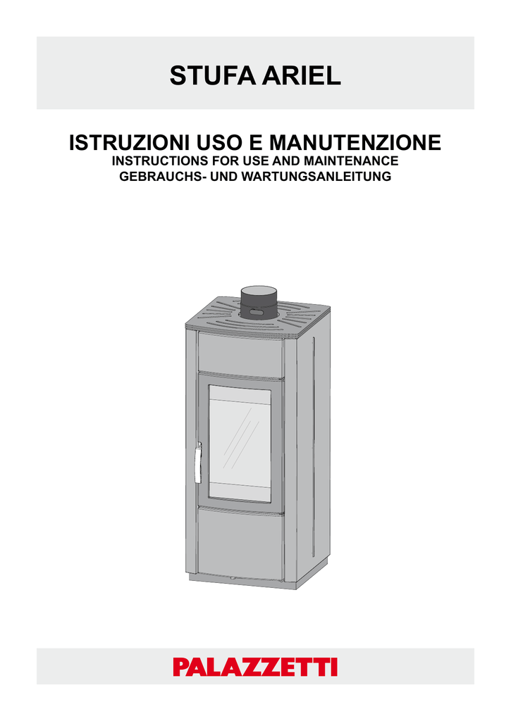 StufA ARIEL Istruzioni Uso e manutenzione instructions for use and maintenance GEBRAUCHS- UND WARTUNGSANLEITUNG Le apparecchiature da riscaldamento (denominate in seguito “stufe”) PALAZZETTI LELIO S.p.A. (di seguito PALAZZETTI) sono costruite e collaudate seguendo le prescrizioni di sicurezza. Questo manuale è indirizzato ai proprietari della stufa, agli installatori, operatori e manutentori delle stufe. In caso di dubbi sul contenuto e per ogni chiarimento contattare il costruttore o il servizio di assistenza tecnica autorizzato citando il numero del paragrafo dell’argomento in discussione. La stampa, la traduzione e la riproduzione anche parziale del presente manuale s’intendono vincolata dall’autorizzazione Palazzetti. Le informazioni tecniche, le rappresentazioni grafiche e le specifiche presenti in questo manuale non sono divulgabili. 2/40 cod. 004773220 - 02-2014 ARIEL IT GB Palazzetti’s heating appliances are made and tested following the safety provisions. his manual is for owners, installers, operators and maintenance T engineers of the stoves. If you have any doubts about the contents or need some clarifications, do not hesitate to contact the manufacturer or an authorised technical assistance centre, giving the number of the paragraph in question. he printing, translation and reproduction, even T partial, of this manual are subject to Palazzetti’s authorisation. Die Heizgeräte (anstehend „Heizofen” genannt) der PALAZZETTI LELIO S.P.A. (in Folge PALAZZETTI) werden unter Einhaltung der von den diesbezüglichen europäische Richtlinien vorgegebenen Sicherheitsbestimmungen hergestellt und geprüft. Dieses Handbuch richtet sich an den Eigentümer des Heizofens, sowie an die Installateure, Bediener und das Wartungspersonal. Im Zweifelsfalle bzw. für jede weitere Erklärung zum Handbuch ist mit dem Hersteller oder der befugten Kundendienststelle Kontakt aufzunehmen. Dabei bitte die Absatznummer und das betroffene Thema angeben. Der Druck, die Übersetzung und auch nur die teilweise Vervielfältigung dieses Handbuchs unterstehen der Genehmigung seitens der Fa. Palazzetti. Die in diesem Handbuch enthaltenen technischen Informationen, grafischen Darstellungen und Spezifikationen dürfen nicht verbreitet werden. he technical information, graphs and specifications T in this manual are not to be disclosed. ARIEL cod. 004773220 - 02-2014 3/40 D INDICE 1 IT PREMESSA 1.1 SIMBOLOGIA 1.2 DESTINAZIONE D’USO 1.3 Scopo e contenuto del manuale 1.4 Conservazione del manuale 1.5 AGGIORNAMENTO DEL MANUALE 1.6 Generalità 1.7principali norme antifortunistiche rispettate e da rispettare 1.8 GARANZIA Legale 1.9 RESPONSABILITà DEL COSTRUTTORE 1.10 CARATTERISTICHE DELL’Utilizzatore 1.11 ASSISTENZA TECNICA 1.12 PARTI DI RICAMBIO 1.13 Targhetta DI identificazione 1.14 CONSEGNA DELLA STUFA 2 AVVERTENZE per la sicurezza 2.1avvertenze per l’installatore 2.2 Avvertenze per l’utilizzatore 2.3 Avvertenze per il manutentore 3Caratteristiche del combustibile e descrizione della stufa 3.1 3.2 CARATTERISTICHE DEL COMBUSTIBILE Descrizione delle parti principali della stufa 4 movimentazione e trasporto 5preparazione del luogo di installazione 5.1precauzioni per la sicurezza 5.2 Considerazioni generali 5.3lUOGO DI INSTALLAZIONE DELLA stufa 5.4 Aria comburente 5.5 Collegamento uscita fumi 6 INSTALLAZIONE, MESSA IN SERVIZIO ED USO della stufa 6.1 6.2 6.3 PRIMA MESSA IN FUNZIONE ACCENSIONE RICARICA DEL COMBUSTIBILE 7Manutenzione E PULIZIA 7.1 7.2 7.2.1 7.2.2 7.2.3 7.2.4 7.2.5 PRECAUZIONI DI SICUREZZA MANUTENZIONE ORDINARIA RIVOLTA ALL’UTILIZZATORE Rimozione della cenere dal focolare Asportazione della cenere dal cassetto Pulizia del vetro Pulizia della canna fumaria Pulizia del forno (Stufa ELISA CON FORNO) 8 Informazioni per la demolizione e lo smaltimento LEGENDA TARGHETTA MATRICOLA CARATTERISTICHE TECNICHE 4/40 cod. 004773220 - 02-2014 ARIEL GB INDEX NHALTSVERZEICHNIS D 1 GENERAL 1 EINLEITUNG 1.1 1.2 1.3 1.4 1.5 1.6 1.7 1.1 1.2 1.3 1.4 1.5 1.6 1.7 1.8 1.9 1.10 1.11 1.12 1.13 1.14 SYMBOLS USE OF THE STOVE Purpose and contents of the manual Keeping the manual UPDATING THE MANUAL GENERAL INFORMATION Main accident prevention regulations to comply with LEGAL GUARANTEE THE MANUFACTURER’S LIABILITIES User CHARACTERISTICS TECHNICAL ASSISTANCE SPARE PARTS Identification plate DELIVERY OF THE STOVE SYMBOLE ANWENDUNGSZWECK Zweck und Inhalt des Handbuchs Aufbewahrung des Handbuchs ERGÄNZUNG DES HANDBUCHS ALLGEMEINE INFORMATIONEN Grundlegende eingehaltene und einzuhaltende Unfallverhütungsnormen GEWÄHRLEISTUNG HAFTBARKEIT DES HERSTELLERS EIGENSCHAFTEN DES BENUTZERS TECHNISCHER KUNDENDIENST ERSATZTEILE Typenschild LIEFERUNG DES HEIZOFENS 2 Safety precautions 2 Vorbeugende SicherheitsmaSSnahmen 2.1 2.2 2.3 Hinweise für den Installateur Hinweise für den Benutzer Hinweise für das Wartungspersonal 3 Brennstoffeigenschaften und Gerätebeschreibung 3.1 3.2 BRENNSTOFFEIGENSCHAFTEN Beschreibung der Hauptbestandteile des Heizofens 4 Handling und Transport 5 Vorbereitung des Installationsorts 1.8 1.9 1.10 1.11 1.12 1.13 1.14 2.1 Instructions for the installer 2.2instructions for the user 2.3 Instructions for the maintenance engineer 3Fuel characteristics and a description of the Stove 3.1 3.2 FUEL CHARACTERISTICS Description of the stove’s main parts 4 Handling and transport 5 Preparing the place of installation 5.1 5.2 5.3 5.4 5.5 Safety precautions COMBUSTION Clearance around the stove Air for combustion SMOKE OUTLET CONNECTION 6 INSTALLATION, COMMISSIONING AND USE OF THE STOVE 6.1 6.2 6.3 FIRST START-UP LIGHTING THE FIRE RELOADING FUEL 7.1 7.2 7.2.1 7.2.2 7.2.3 7.2.4 7.2.5 SAFETY PRECAUTIONS SCHEDULED MAINTENANCE ASSIGNED TO THE USER Removing ashes from the fireplace Removing ashes from the box Cleaning the glass Cleaning the flue Oven cleaning (ELISA WITH OVEN Stove) 8 Information for demolition and disposal LEGEND PRODUCT LABEL ARIEL 6 INSTALLATION 6.1 Erste inbetriebnahme 6.2zündung 6.3brennstoff