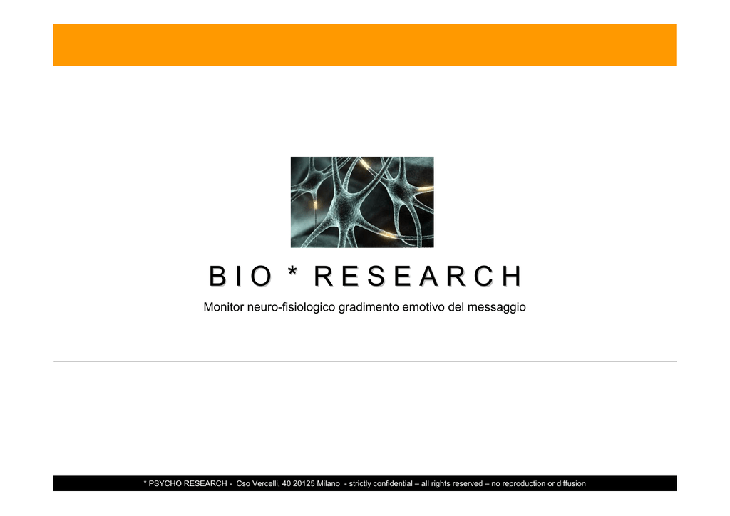 BIO * RESEARCH Monitor neuro-fisiologico gradimento emotivo del messaggio * PSYCHO RESEARCH - Cso Vercelli, 40 20125 Milano - strictly confidential – all rights reserved – no reproduction or diffusion Affiancare alla ricerca tradizionale e psicolinguistica la misurazione delle reazioni neuro-fisiologiche Conoscere con più esattezza la percezione spesso nascosta in una intervista tradizionale Essere in grado, nel caso di uno spot, di avere un report neuro-fisiologico frame by frame * PSYCHO RESEARCH - Cso Vercelli, 40 20125 Milano - strictly confidential – all rights reserved – no reproduction or diffusion DATI OGGETTIVI Sotto i comportamenti e le parole manifeste del consumatore c’è un mondo difficile da esplorare che in realta’ è quello fondante: l’emotivita’ La maieutica interpretativa su cui si basa l’osservazione di ricerca è un passo importante e affidabile. La ricerca biologica si pone come ausilio confirmatorio della ricerca classica, in un panorama interpretativo che diventa ogni giorno sempre piu’ difficile. * PSYCHO RESEARCH - Cso Vercelli, 40 20125 Milano - strictly confidential – all rights reserved – no reproduction or diffusion ATTIVITA’ ELETTRODERMICA (INTERESSE) ATTIVITA’ CARDIACA (GRADIMENTO) ANALISI BIOLOGICA DELLE REAZIONI AL MESSAGGIO ATTIVITA’ CEREBRALE ( STATO D’ANIMO ) ATTIVITA’ MUSCOLARE ( INTENSITA’ INCROCIO DATABASE PSICOLINGUISTICO * PSYCHO RESEARCH - Cso Vercelli, 40 20125 Milano - strictly confidential – all rights reserved – no reproduction or diffusion EUSTRESS brain alpha-theta cardio low-eurhythm musc. no contr. skin low conductance diff. brain theta-alpha cardio low - eurhythm musc. no contr skin no conductance diff. brain lowbeta alpha cardio low-middle- eurhythm musc. average contr. skin average conductance SEROTONINA PARA SIMPATICO btain beta - hibeta cardio high musc. high contr. skin high condutcance A D Rbrain E beta NA L I N ASIMPATICO - hibeta E N Dbrain O low R beta FINE cardio low musc. no contr. skin average conductance diff. cardio hi - arhythm musc. rigid. skin high conductance brain hi-beta brain hibeta –gamma cardio high – arhythm cardio high - arhythm musc high contr. musc. max contract skin high conductance diff. skin high conductance diff. CORTISOLO DISTRESS * Psycho Research - strictly confidential – ( all rights reserved – no reproduction or diffusion - Intellectual property Copyright 970327979/0301441) MODALITA’ DI ATTUAZIONE * PSYCHO RESEARCH - Cso Vercelli, 40 20125 Milano - strictly confidential – all rights reserved – no reproduction or diffusion Aree cerebrali e Proiezioni sistema nervoso autonomo * PSYCHO RESEARCH - Cso Vercelli, 40 20125 Milano - strictly confidential – all rights reserved – no reproduction or diffusion BIO-TRACKING * ASPETTATIVE * STIMOLO IN TEST * PSYCHO RESEARCH - Cso Vercelli, 40 20125 Milano - strictly confidential – all rights reserved – no reproduction or diffusion MESSAGE IN TEST: . ATTIVITA’ ELETTRODERMICA: INTERESSE COINVOLGIMENTO idealtipo>>> LONTANANZA ATTIVITA’ CARDIACA: GRADIMENTO PIACERE idealtipo>>> PATHOS ATTIVITA’ CEREBRALE: STATO D’ANIMO PERDITA CONTROLLO idealtipo>>> TORPORE ATTIVITA’ MUSCOLARE: TENSIONE idealtipo>>> RELAX INTENSITA’ ESTRATTO FLASH RISULTATI DI RICERCA * PSYCHO RESEARCH - Cso Vercelli, 40 20125 Milano - strictly confidential – all rights reserved – no reproduction or diffusion MARCA FAMOSA E MARCA NON FAMOSA * PSYCHO RESEARCH - Cso Vercelli, 40 20125 Milano - strictly confidential – all rights reserved – no reproduction or diffusion marca non famosa marca molto famosa ( ) ATTIVITA’ ELETTRODERMICA: INTERESSE COINVOLGIMENTO LONTANANZA ATTIVITA’ CARDIACA: GRADIMENTO PIACERE PATHOS ATTIVITA’ CEREBRALE: STATO D’ANIMO PERDITA CONTROLLO TORPORE ATTIVITA’ MUSCOLARE: TENSIONE RELAX INTENSITA’ ESTRATTO bio-valori inferiori a livello generale di > 35% attivita’ cutanea e interesse polarizzati con l’influsso marca attivita’ cerebrale velocizzata intensita’ muscolare enfatizzata si denota un gradimento minore ma non particolarmente depresso, segnale di una sovrastruttura emozionale della marca che necessita continui i nterventi di polarizzazione emotiva necessita’ di compensare la mancanza di pressing emotivo per la non marca con l’effetto – prezzo, sovraeccitante “naturale” * PSYCHO RESEARCH - Cso Vercelli, 40 20125 Milano - strictly confidential – all rights reserved – no reproduction or diffusion SPOT SUPERGA * PSYCHO RESEARCH - Cso Vercelli, 40 20125 Milano - strictly confidential – all rights reserved – no reproduction or diffusion ESTRATTO DA: ANALISI ADV SUPERGA z z z z z z Pubblicità: scarpe Durata: 30 secondi Variabili misurate: elettroencefalografo, elettrocardiogramma, miografo, elettrodermia. Procedura: differenze tra momento senza stimolo e pubblicità. Differenze tra adv e scarpa ottimale-ideale nel pensiero degli intervistati. * PSYCHO RESEARCH - Cso Vercelli, 40 20125 Milano - strictly confidential – all rights reserved – no reproduction or diffusion * PSYCHO RESEARCH - Cso Vercelli, 40 20125 Milano - strictly confidential – all rights reserved – no reproduction or diffusion Spot frames >>> MESSAGE MESSAGE IN TEST: IN .TEST: . “MESSAGGIO X” ATTIVITA’ ELETTRODERMICA: INTERESSE COINVOLGIMENTO idealtipo>>> ERROR LONTANANZA ATTIVITA’ CARDIACA: GRADIMENTO PIACERE idealtipo>>> ERROR PATHOS ATTIVITA’ CEREBRALE: STATO D’ANIMO PERDITA CONTROLLO idealtipo>>> TORPORE ATTIVITA’ MUSCOLARE: INTENSITA’ TENSIONE idealtipo>>> RELAX ERROR MAPPING * PSYCHO RESEARCH - Cso Vercelli, 40 20125 Milano - strictly confidential – all rights reserved – no reproduction or diffusion INTERESSE % IMPULSO interesse senza gradimento GRA DI MEN TO Spot Superga % RIFIUTO gradimento senza interesse Il consumatore non compra trapani ma…buchi pietre luccicanti ma…amore stoffa ma…sex appeal Saper aggiungere il sogno al bisogno vuol dire …il bilancio in